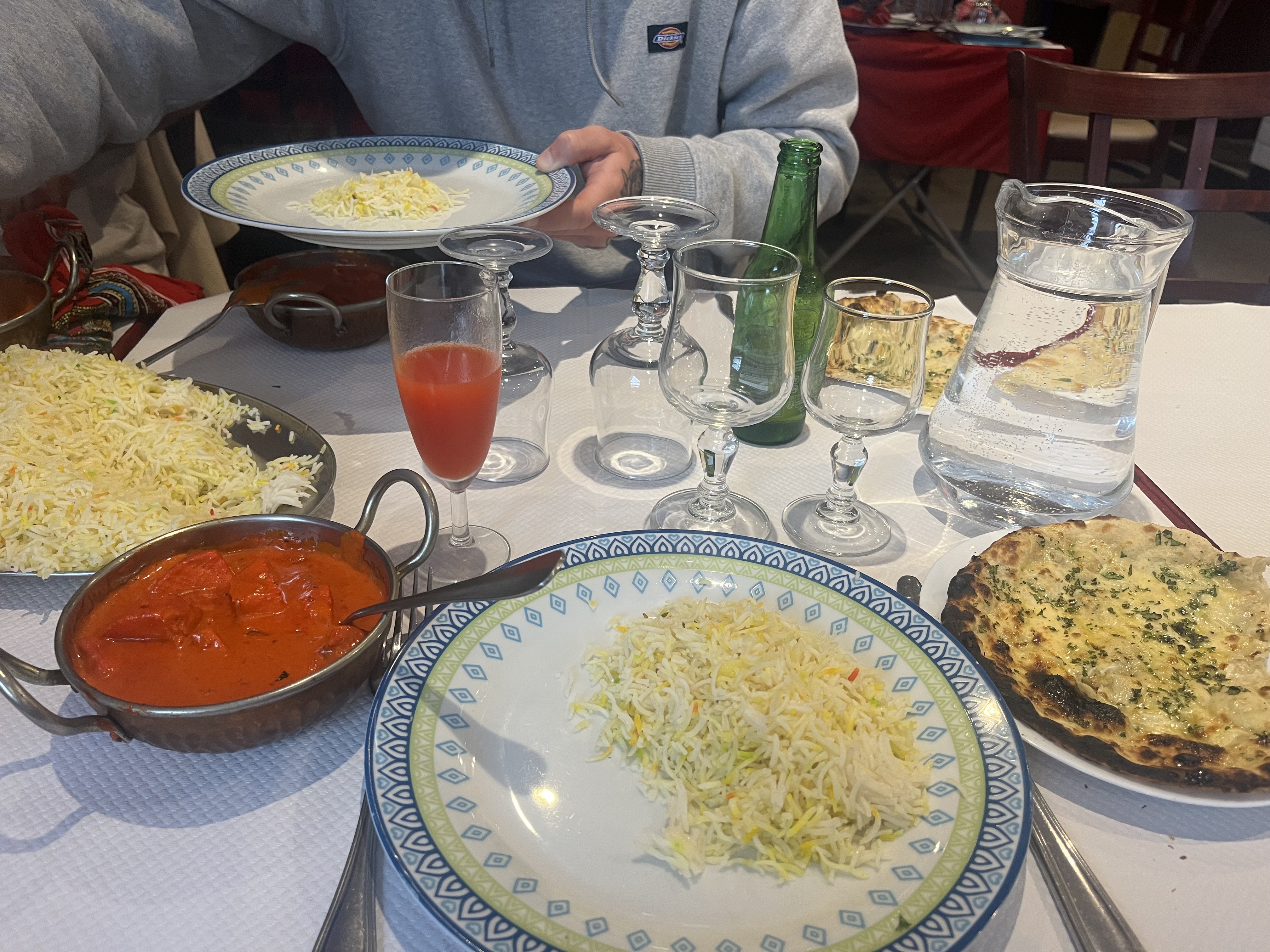 Quelle trouvaille ! Nous aimons la bonne cuisine indienne et la essayons dans tous les pays où nous allons. Nous leur avons fait savoir que nous aimons tous les deux les épices (et non les Britanniques?), alors nous avons commandé des épices moyennes. Parfait! Le poulet au beurre et le vindaloo d’agneau n’étaient ni trop doux ni trop épicés, juste ce qu’il fallait. Le naan à l'ail et le riz au safran étaient des accompagnements parfaits, et la Kingfisher Lager était un excellent accord de bière.