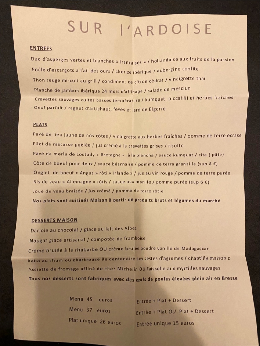 Très bon menu du jour,seul regret pas de présentation de carte ,car peut être aurions nous choisi autres mets.