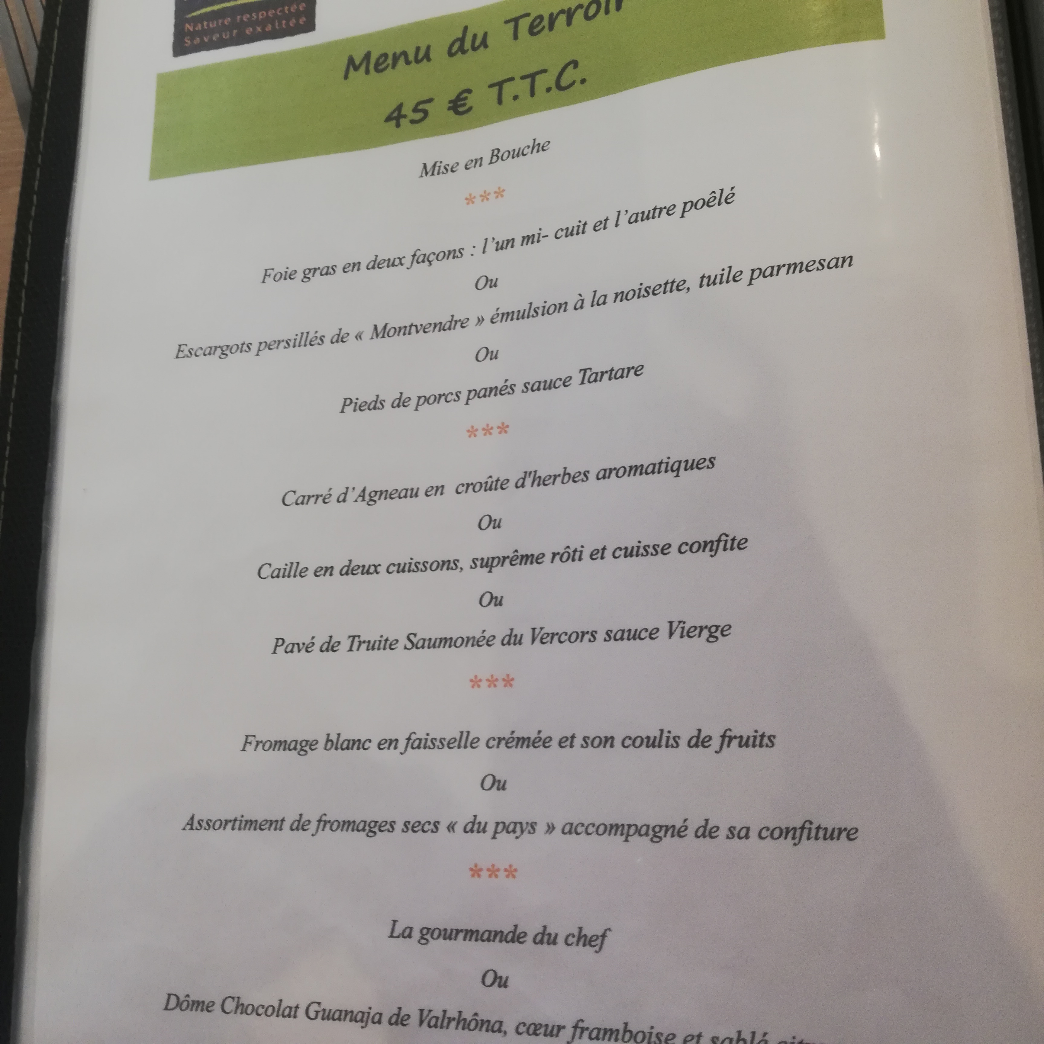 Quel repas parfait ! Menu du jour entrée plat et dessert pour 21 euros. Avec des plats succulent. Préparés avec des produits locaux. La quantité fut parfaite. Repas prit en terrasse à l'ombre des arbres dans un très beau cadre. L'accueil fût souriant et le service rapide. Je recommande vivement ce lieu aux amateurs de la bonne cuisine dromoise !