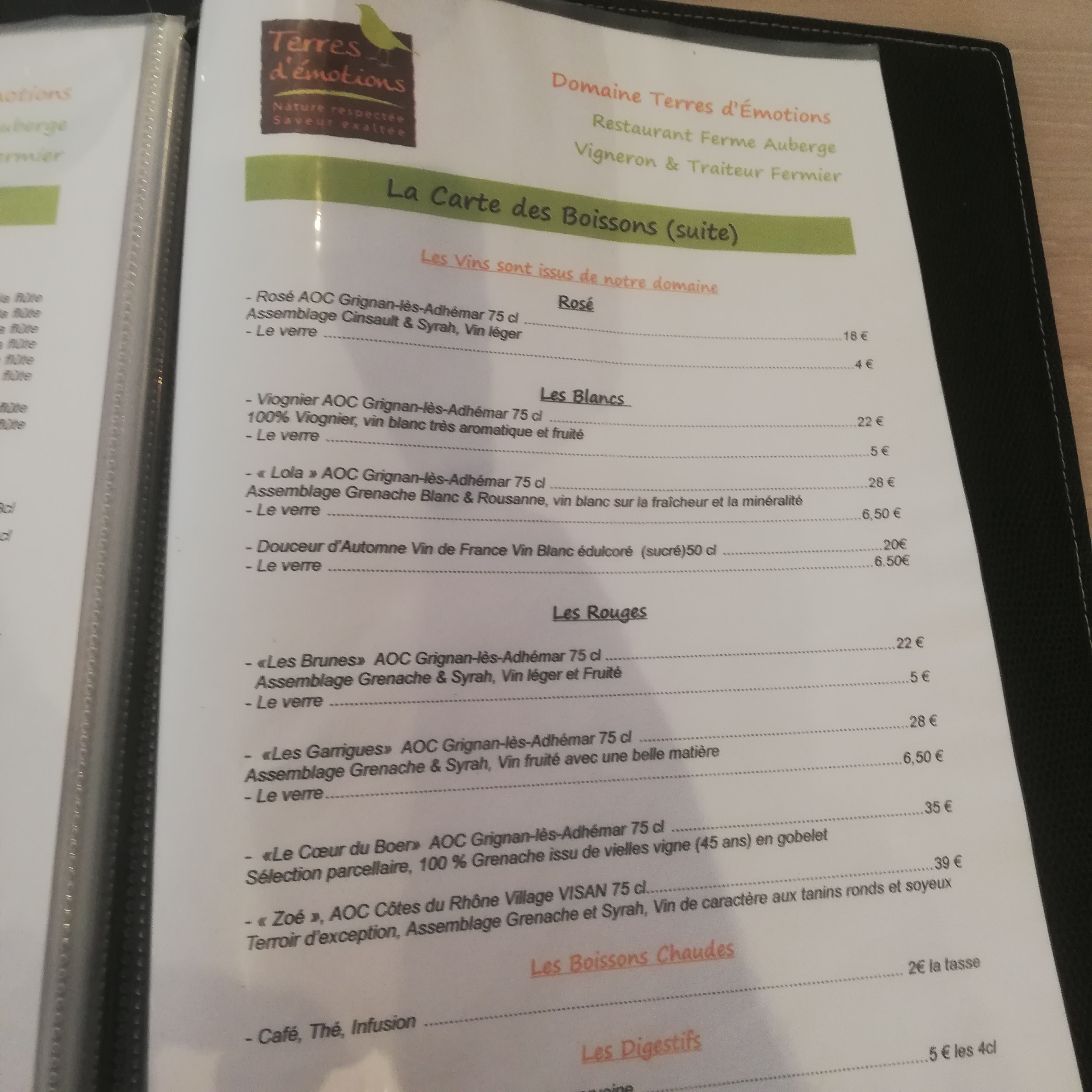 Très franchement je ne comprends pas les avis... sauf à être tombé un très mauvais jour ! Nous avons été fortement déçus par le menu du Terroir (45 euros) du restaurant Terres d’émotions. Déjà, nous attendions d’une ferme auberge un peu plus de générosité dans l’assiette ; nous en étions loin. Pour autant, les parts peuvent être petites et excellentes, c’est souvent le cas dans les bons restaurants d’où l’on ressort rassasié avec des petites portions, après s’être régalé. L’entrée, nous avions opté pour la ceviche de truite : en réalité 2 très fines tranches noyées dans une grande assiette creuse, baignaient dans un liquide fadasse. Le plat. Nous avions fait deux choix différents. « Truite Arc en ciel ». En réalité un seul filet (même pas deux !) enveloppé dans un mélimélo de pâtes (type cheveux d’anges) fort peu gustatif. « Caille en croustille et foie gras ». La demi-caille qui était sèche, semblait avoir été accompagnée avec de la sauce tomate... en tube ! Le dessert. « Chocolat Valrhona » bon, sans plus. Cerise sur le gâteau : la terrasse. Fortement crayeuse, les dames avaient déposé leurs sacs à main au sol, elles les ont récupéré souillés par cette matière. Pas de store pour occulter du soleil qui nous a aveuglé une bonne partie du repas (c'était en soirée) Membre « les Collectionneurs », habitué des restaurateurs de ce réseau présidé par Alain Ducasse, il faut bien évidemment comparer ce qui est comparable : réclamer 45 euros pour le Menu du Terroir est tout-à-fait injustifié (voire abusif) par rapport à ceux pratiqués par la plupart des restaurants bistronomiques dont les premiers menus varient dans une fourchette de prix allant de 30 à 35 euros. Ce tarif est complètement hors-sol par rapport à certaines alternatives économiques offertes par certains établissements gastronomiques à leurs clients, à tarif équivalent bien évidemment. La présentation du site est alléchante, la découverte dans l’assiette de ce menu à 45 euros est une vraie déception ; le prix ne justifie pas la prestation, il y a bien mieux ailleurs.