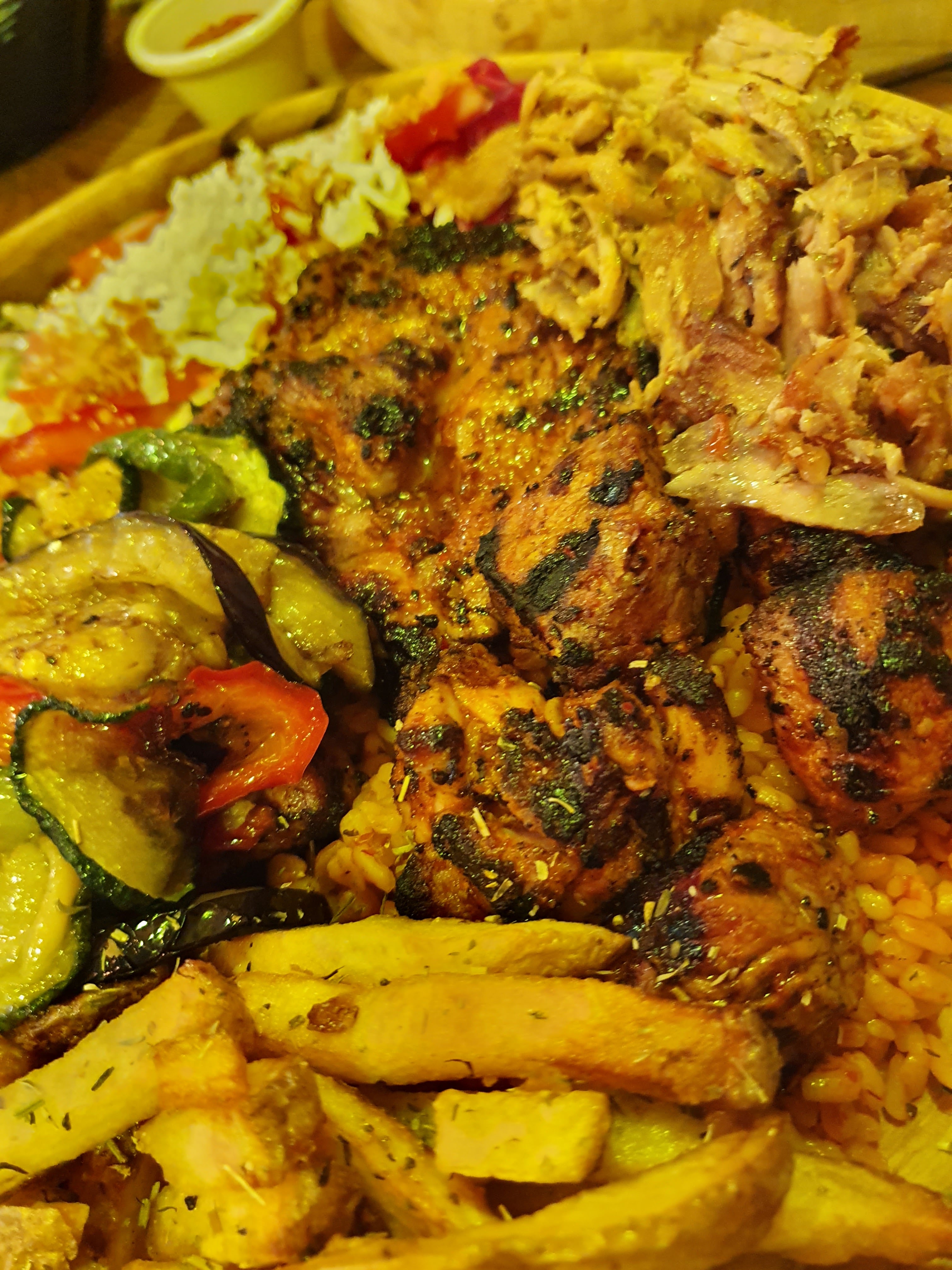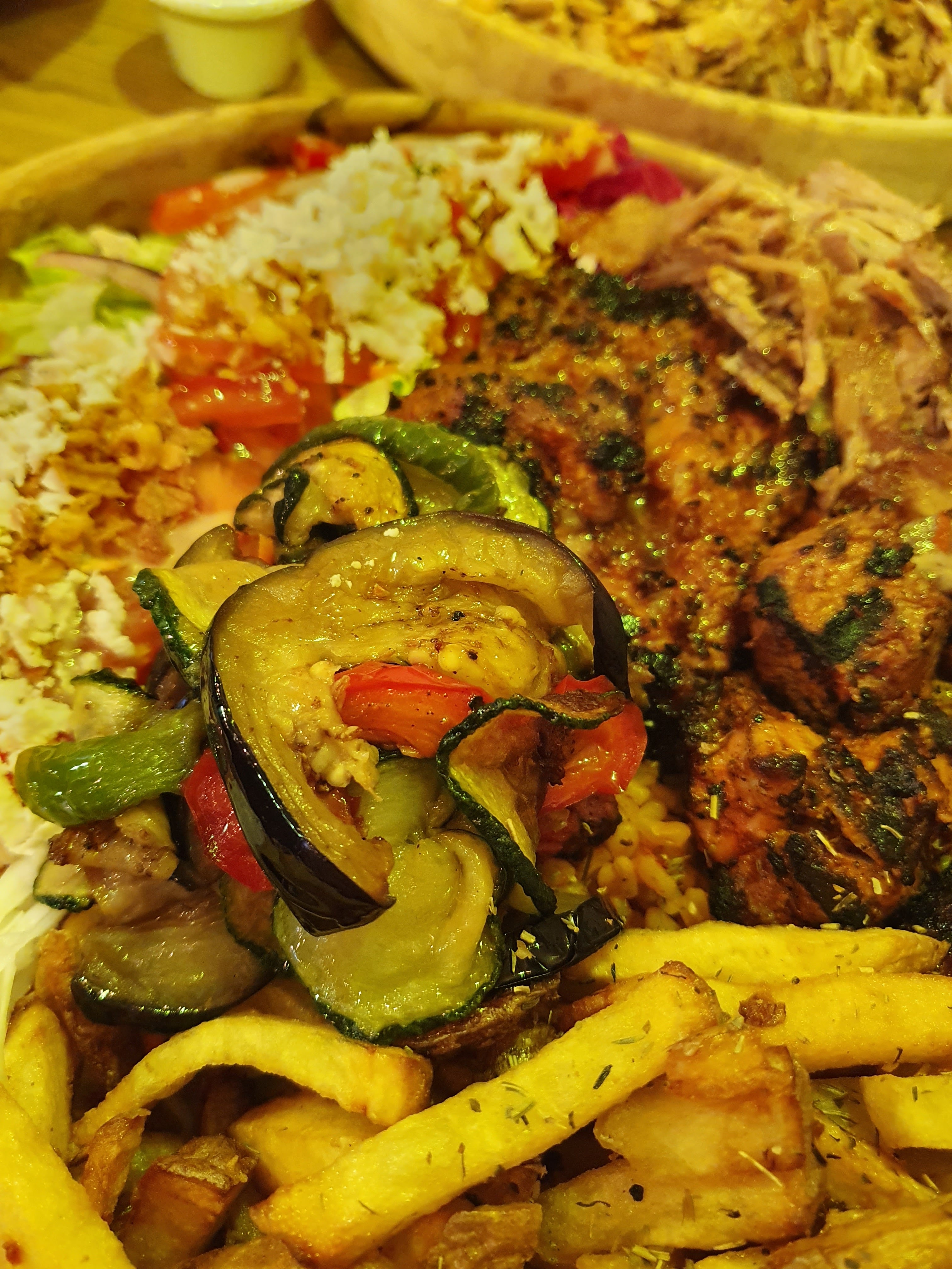 N'ayant pas pu visiter le bon mais ordinaire kebab que nous connaissions à cet endroit pendant de longs mois de confinement, nous avons été très agréablement surpris de constater que le restaurant avait complètement changé avec une déco sympa, une ambiance très chaleureuse et accueillante, et personnel sympathique et attentionné. Et la nourriture était délicieuse et d'un excellent rapport qualité/prix, avec des portions énormes. Très équilibré aussi, avec plein de savoureux légumes grillés 😇. Leurs plats sont tous accompagnés de salades, de frites (faites maison), de légumes grillés, de boulgour et de feta. Ils peuvent bien sûr constituer une bonne option végétalienne en omettant simplement le fromage feta. La propriétaire et son personnel sont très serviables et arrangeants, et mon mari et moi y avons passé un merveilleux repas.