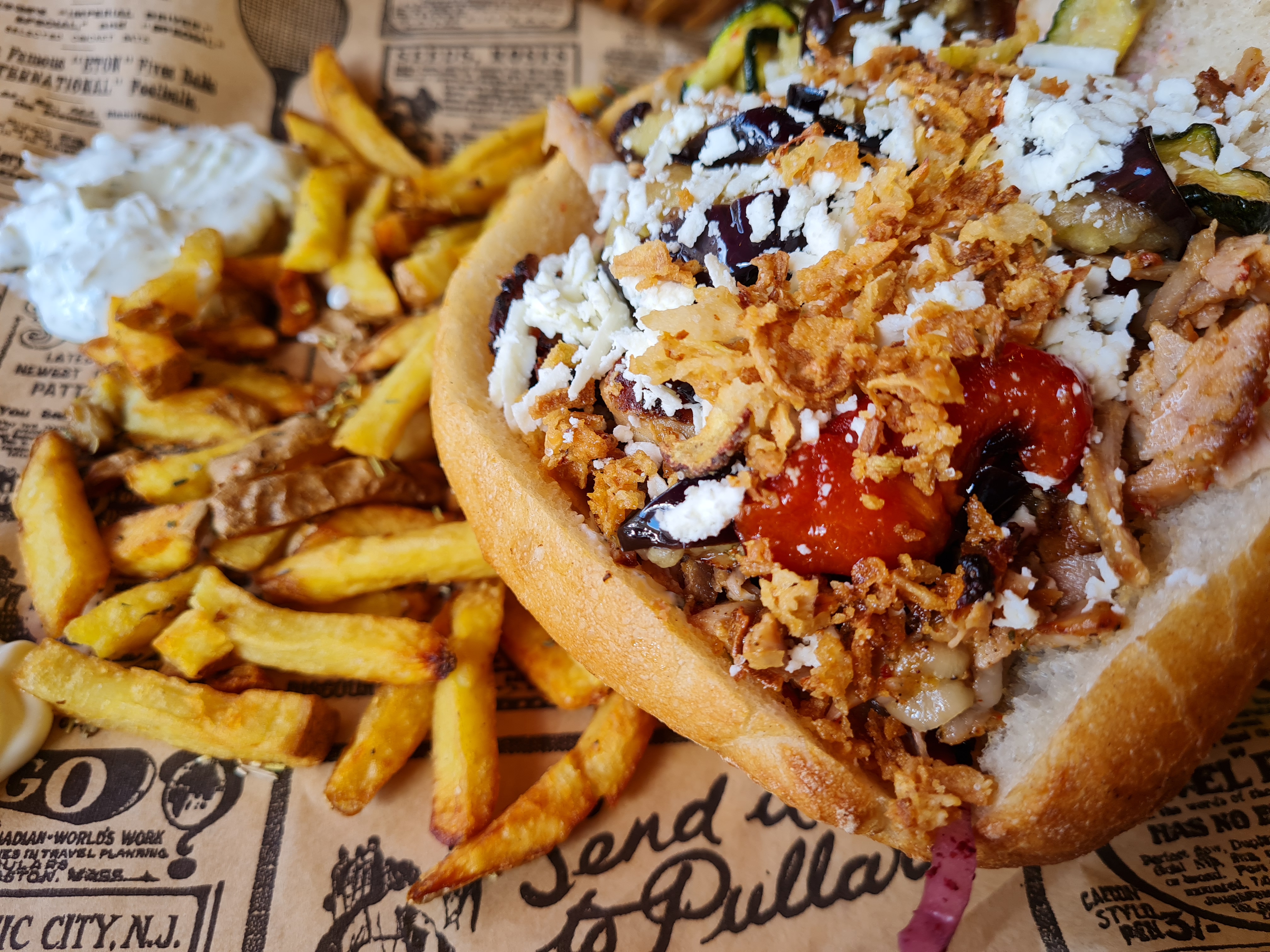 Pain boule kebab complet..( chou rouge, blanc, carotte, oignons frits, fromage émietté turc dessus...Je n ai pas goûter aux légumes frits..la prochaine fois😁)Un seul mot : délicieux ! Frites excellentes également, avec peau et herbes.. Sauce blanche maison très bonne.. Prix très correcte au vu de la qualité..Déco sympa.. On s y sent bien. Mercii !!!