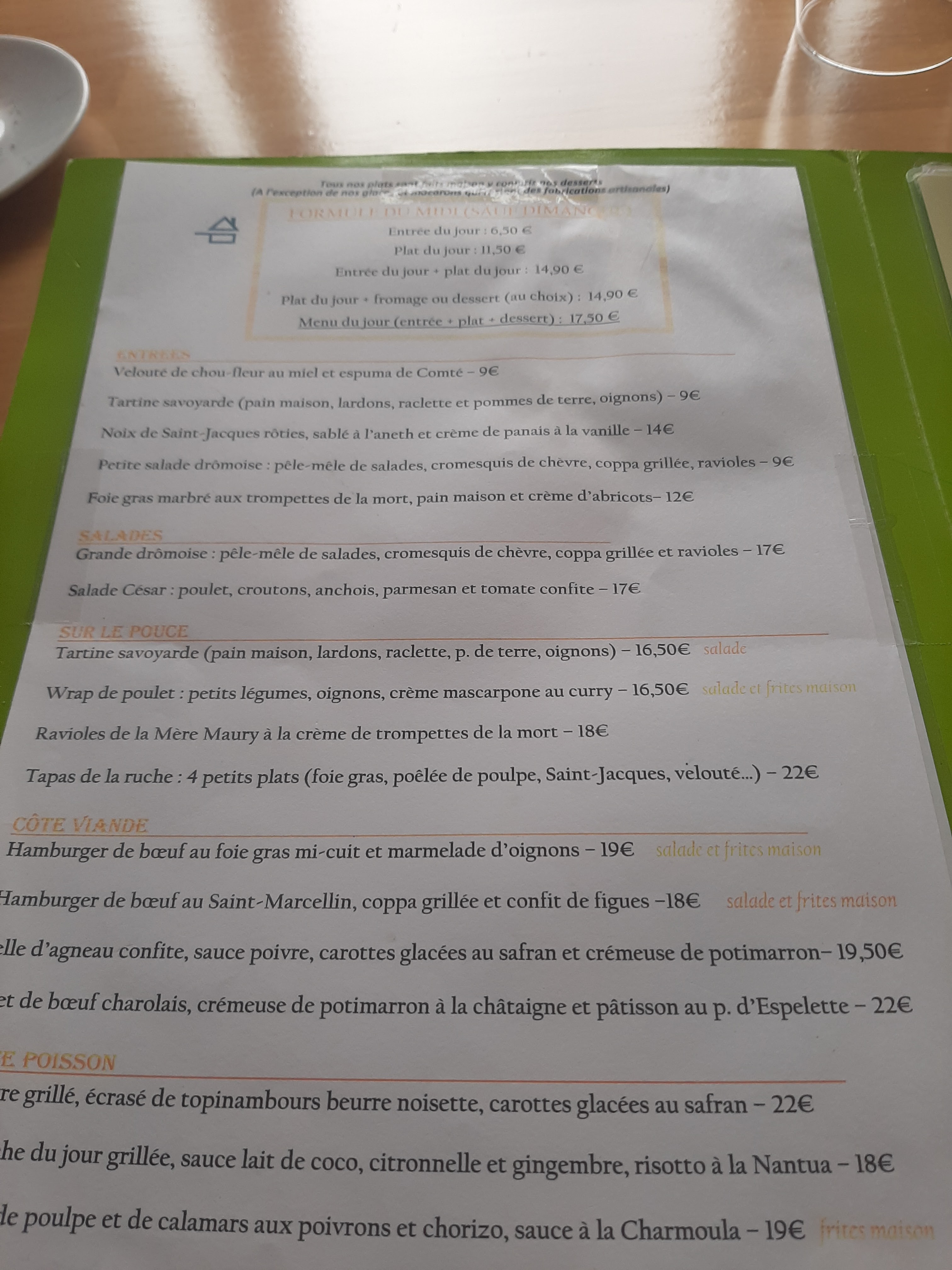 Une salade dromoise à tomber par terre. Un hamburger au foie gras et à la confiture d'oignons somptueux. Le plateau des desserts très bon. un endroit agréable mais pas pompeux. Nous avons passé un agréable moment. Merci