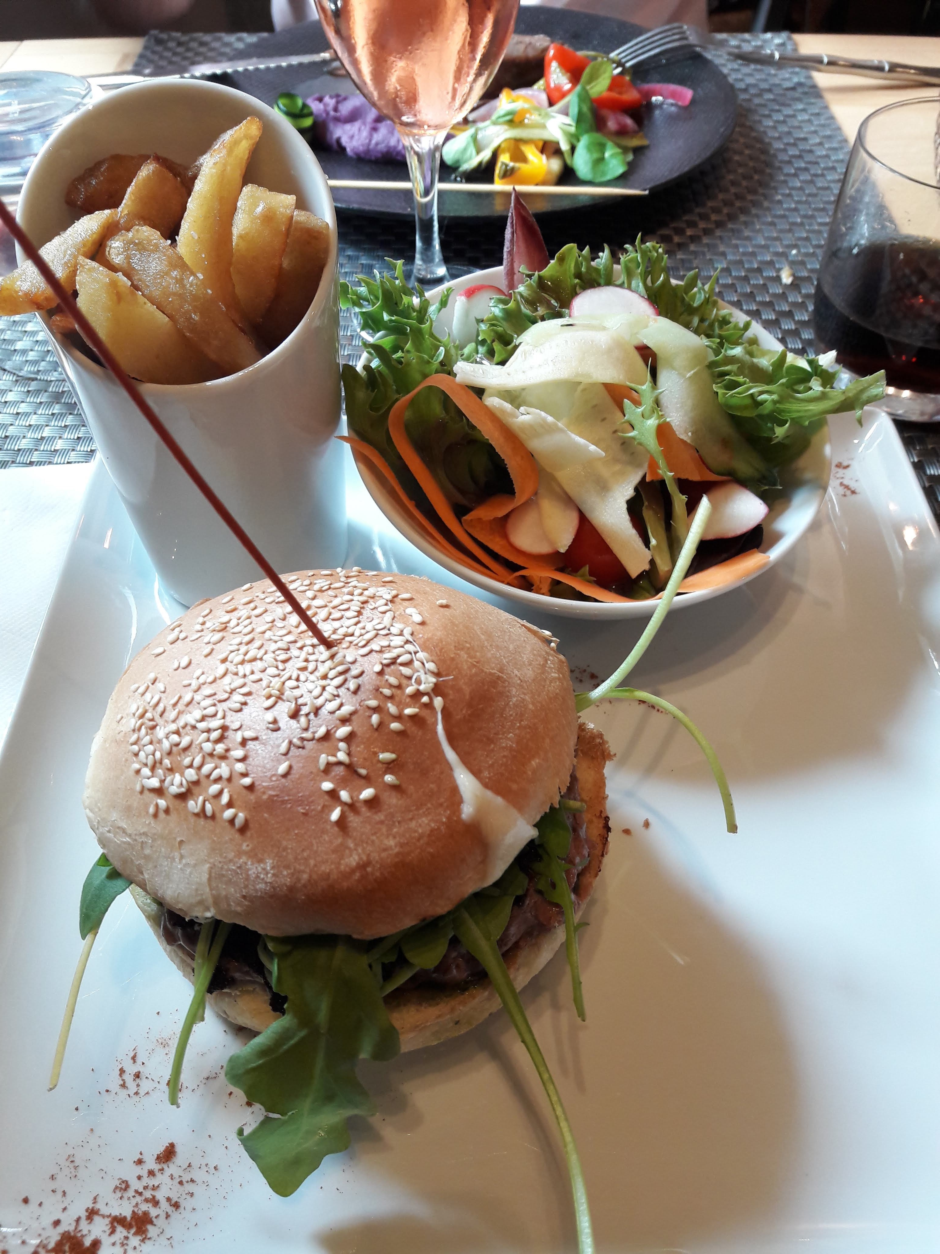 Déçus. Nous nous sommes arrêtés dimanche midi, nous avions sélectionné ce restaurant grâce au label Gault et Millau mais je doute qu'il soit toujours d'actualité... L'hamburger italien (19€) pesto, fromage, jambon, steak et une petite tomate séchée était peu garni, il manquait de crudités et de couleurs. Le pain était bon ainsi que les quelques frites. La salade verte d'accompagnement était abîmée par endroit, on ne doit pas voir ça dans un tel restaurant. Le restaurant est en travaux mais ce n'est pas normal qu'il y ait, par exemple, une pile de serviettes en vrac à sur la terrasse proche des tables, et que les cuisiniers ne portent pas de masques et n'aient pas de tenues de cuisine.