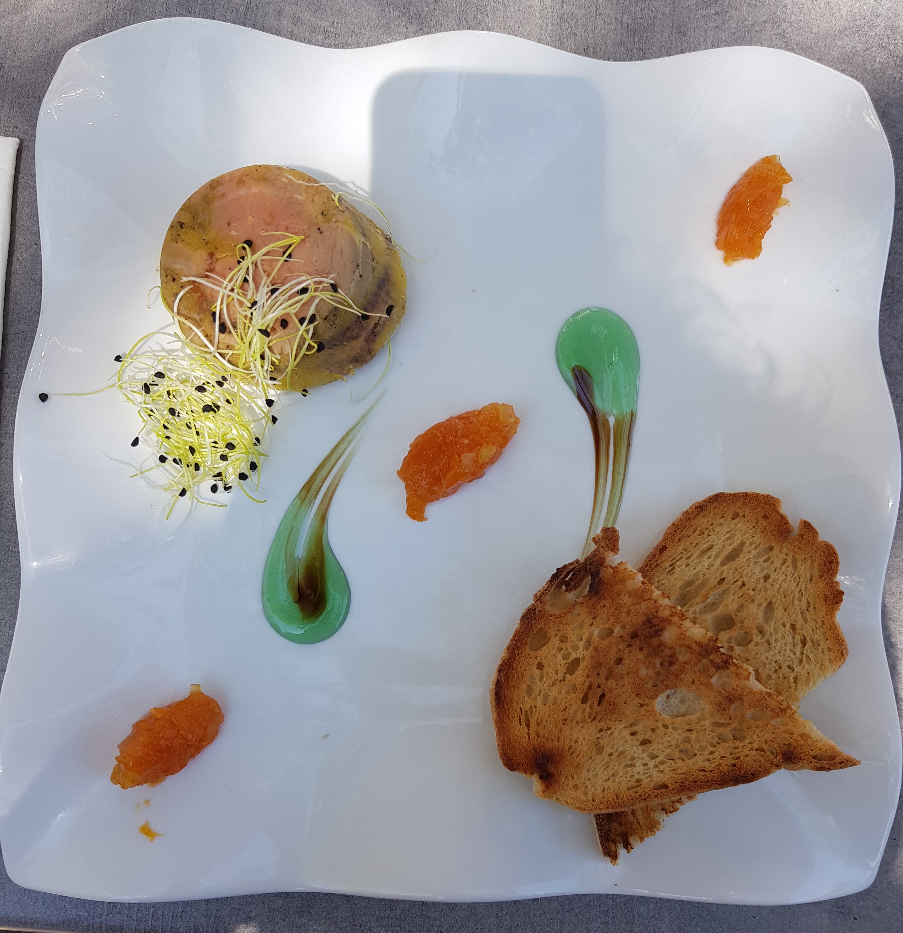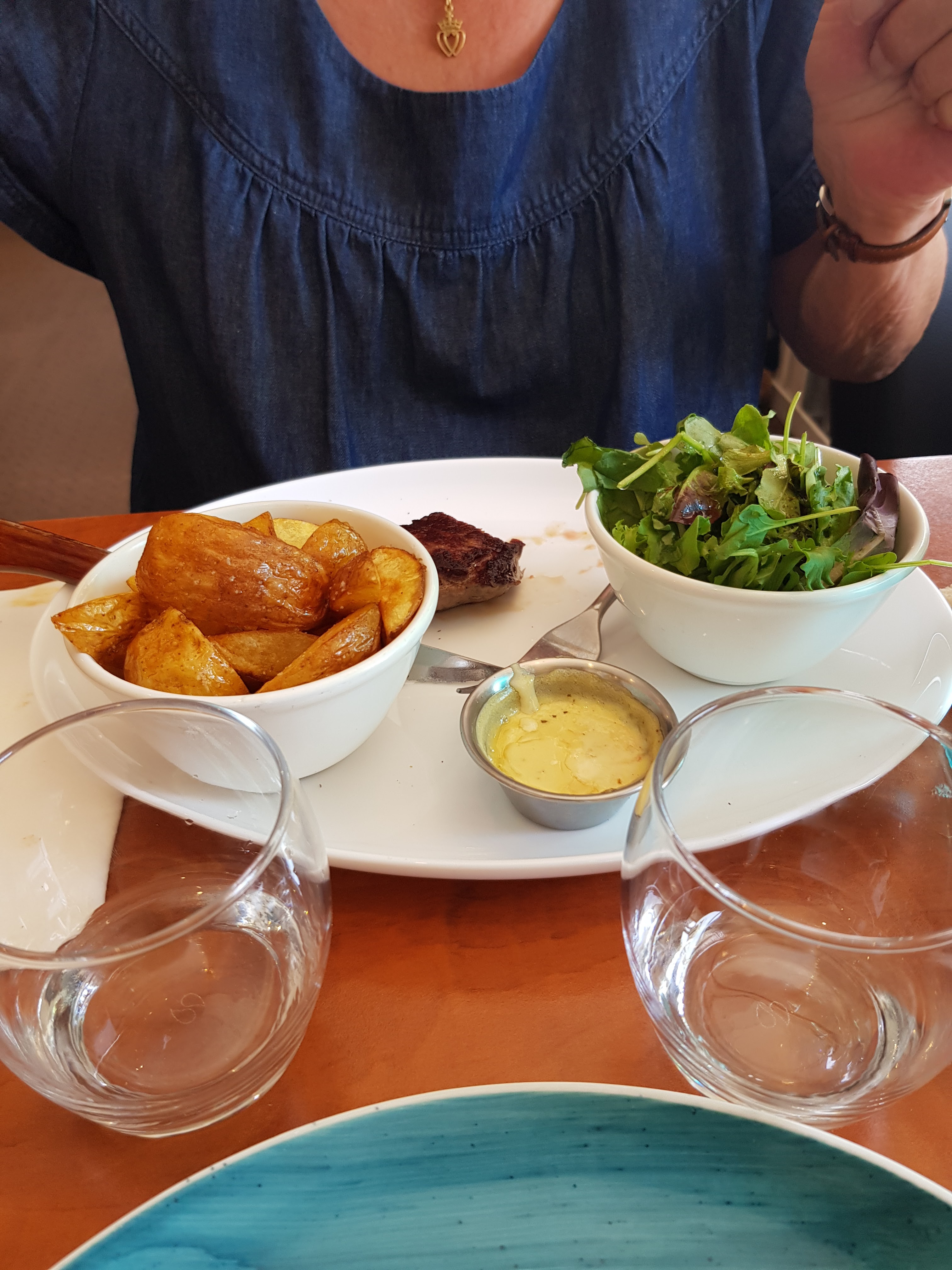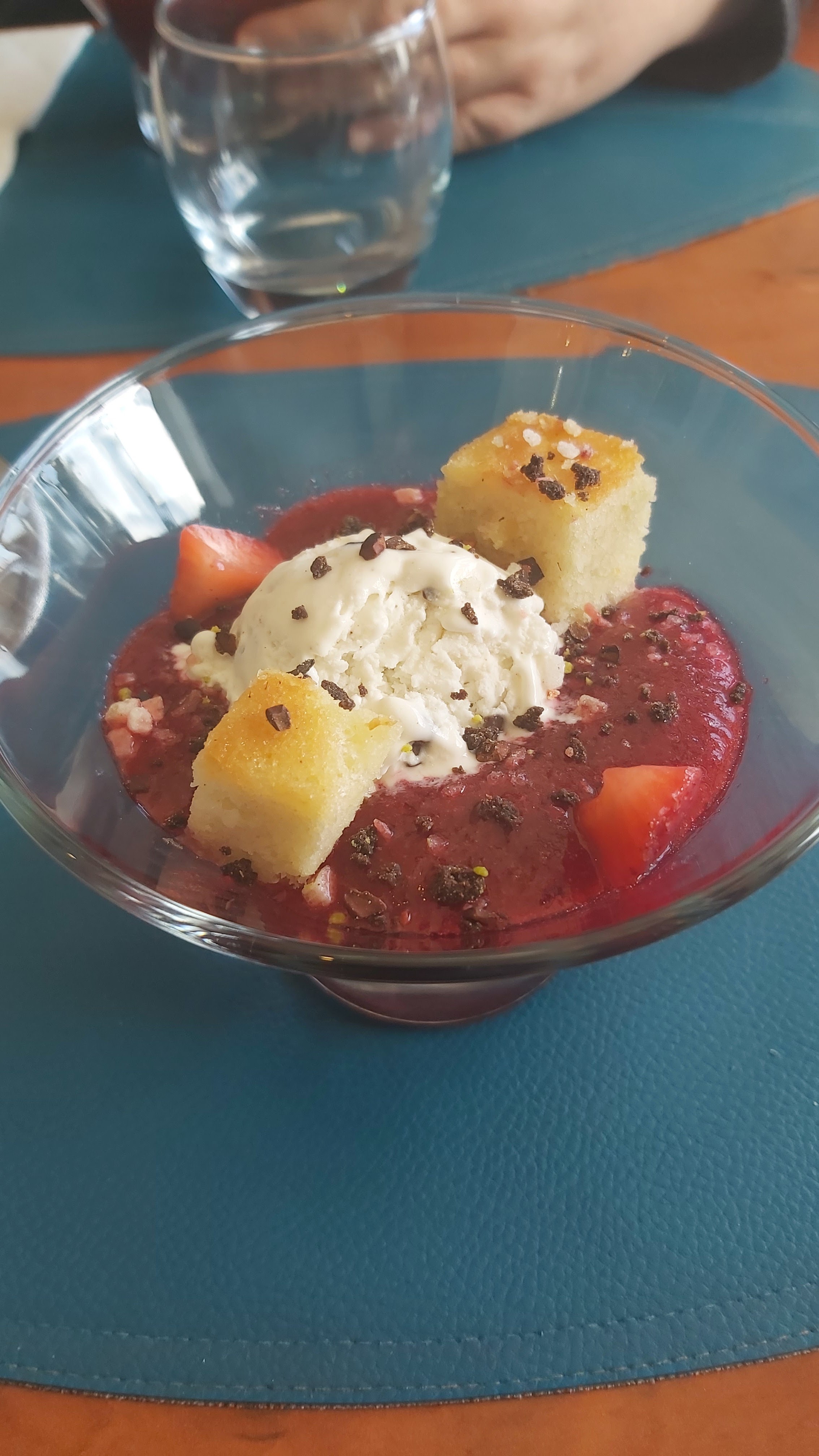 Repas servi en terrasse. Juste un peu déçue par l'entrée du chef, le buisson de langoustines était vraiment très léger avec seulement 4 toutes petites langoustines sur un lit de salade et un petit pot de guacamole maison. Le plat principal était, heureusement, plus copieux et très bon même si la viande commandée à point, etait un peu trop cuite. Les frites maison étaient délicieuses et le dessert, un tiramisu aux fruits rouge, idem. Un geste apprécié, la gamelle d'eau proposée, pour notre chien.