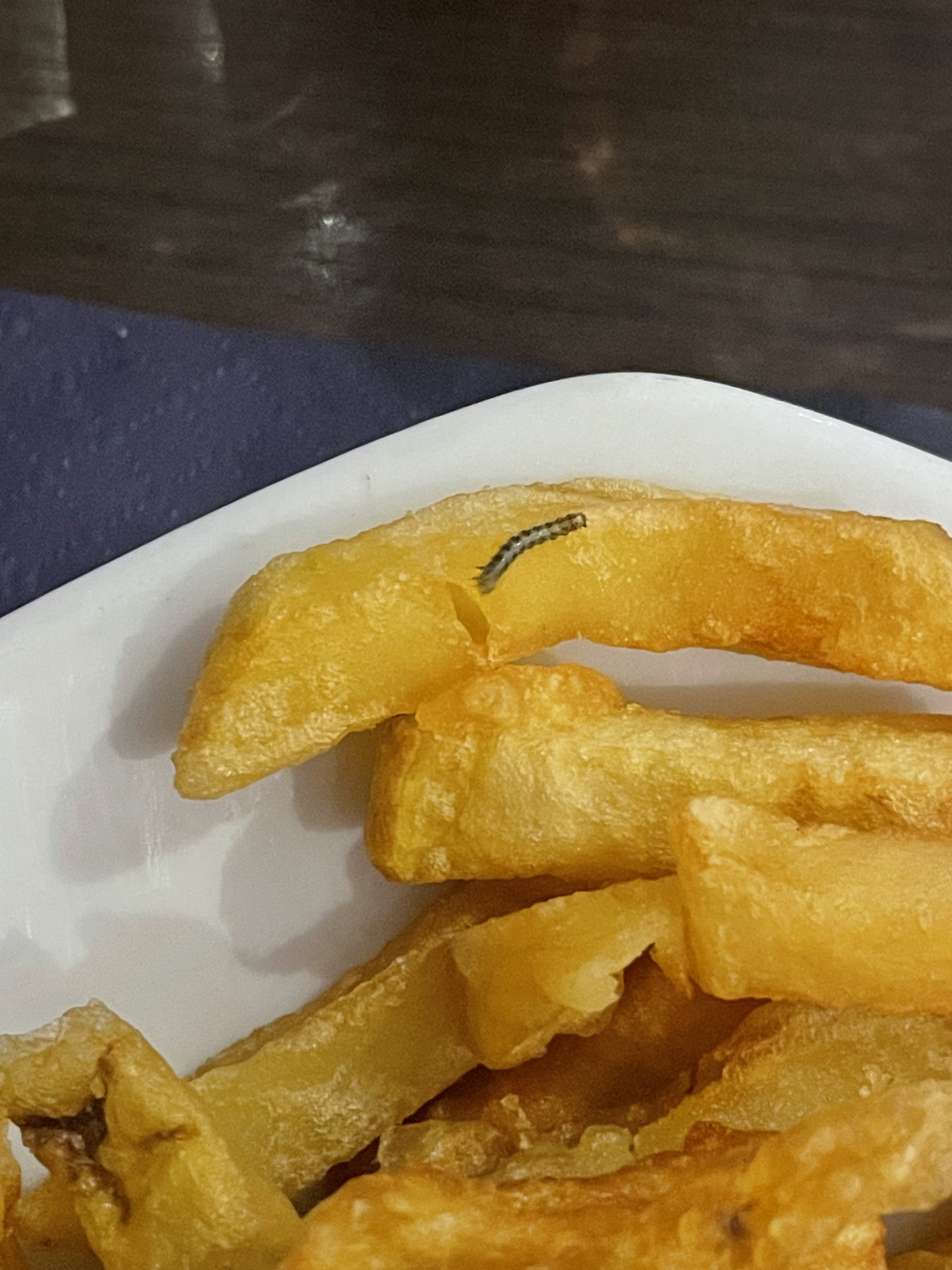 Frites trops cuites, croûtons de pains raci.