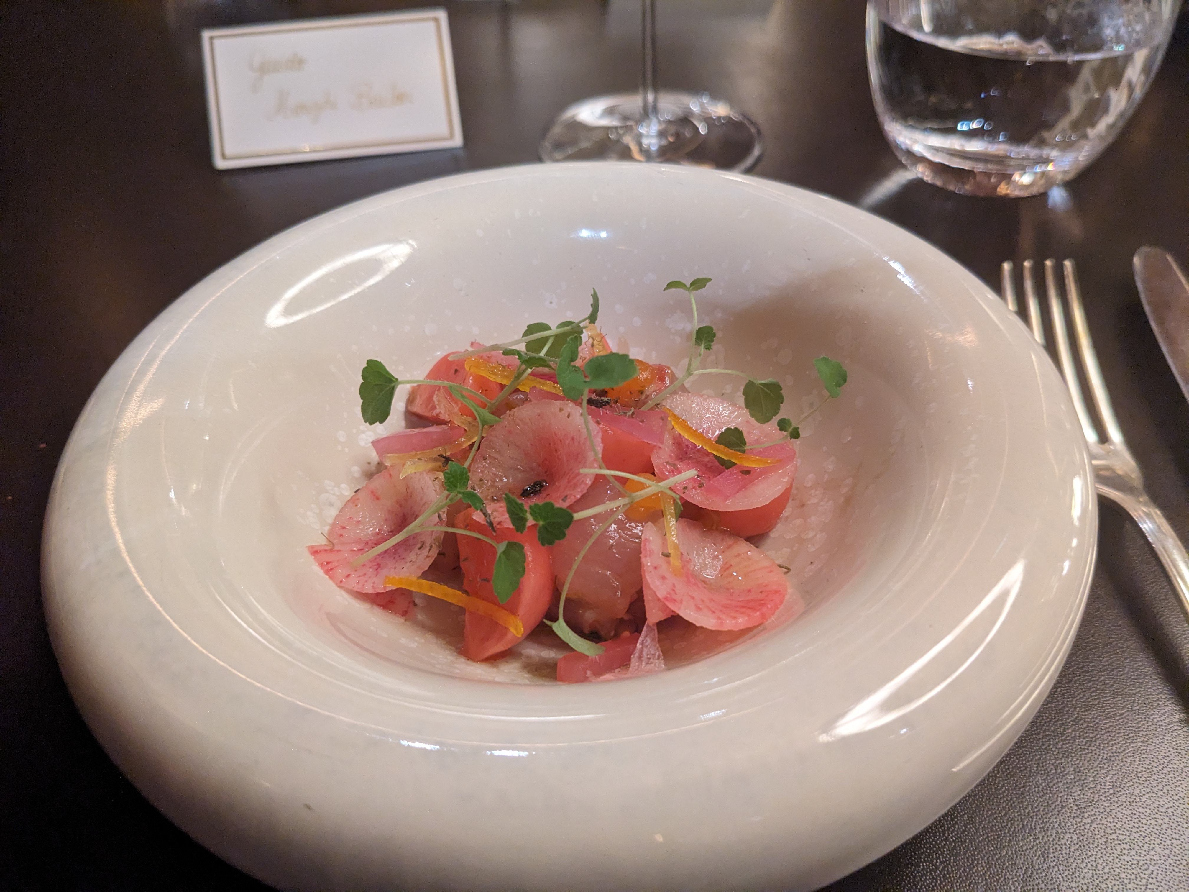 Je suis venu un lundi pour fêter les 70 ans de ma mère. J'ai retiré des étoiles car le service n'était pas comparable à mes expériences dans d'autres restaurants haut de gamme. Nous avons commandé le menu dégustation de six plats et commandé l'accord mets et vins. Nous avons commandé l'accord mets et vins après qu'on nous ait dit qu'aucun cocktail ne pouvait être préparé car ils n'avaient pas de barman, ce qui était étrange puisque la serveuse nous a proposé des boissons et une fois commandée, on nous a dit que nous ne pouvions rien obtenir. L'accord mets et vins ne comprenait également que 3 vins pour 6 plats et était très cher pour ce que nous avions commandé. Nous devions constamment demander des recharges de notre eau et honnêtement, le personnel donnait l'impression qu'il voulait simplement que nous partions. Encore une fois, la nourriture était excellente mais l'expérience était médiocre
