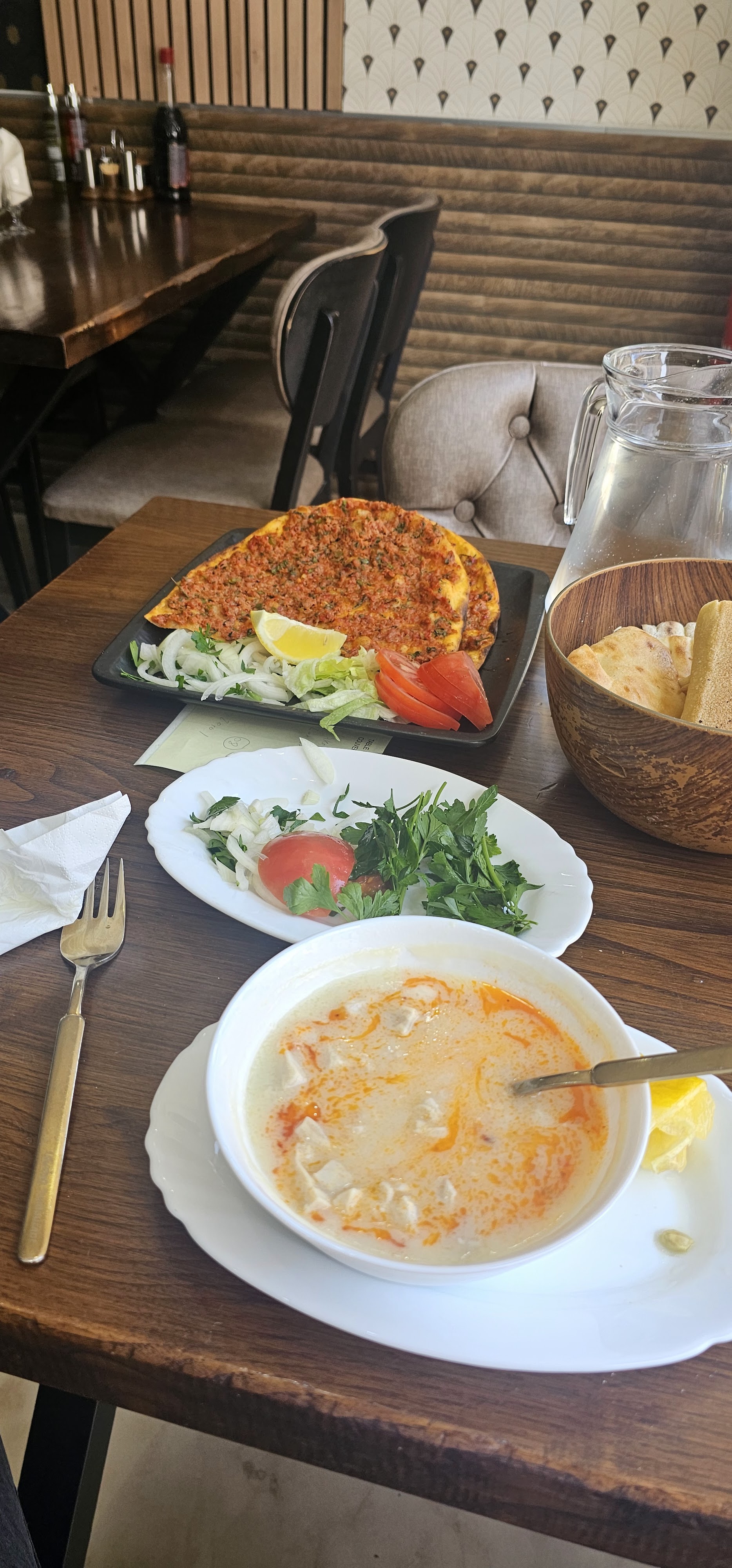Nous sommes arrivés assez tard et on nous a quand même trouvé une place.Des amuses bouches nous sont offert avec pain et petite salade composée pour nous faire patienter Nous sommes accueillis par une équipe jeune dynamique et souriante. Les plats copieux viandes goutues parfaites. Malheureusement pas pu goûter au kunefe mais le café à été gentillement offert. Je recommande ce restaurant turc avec sa jolie déco.
