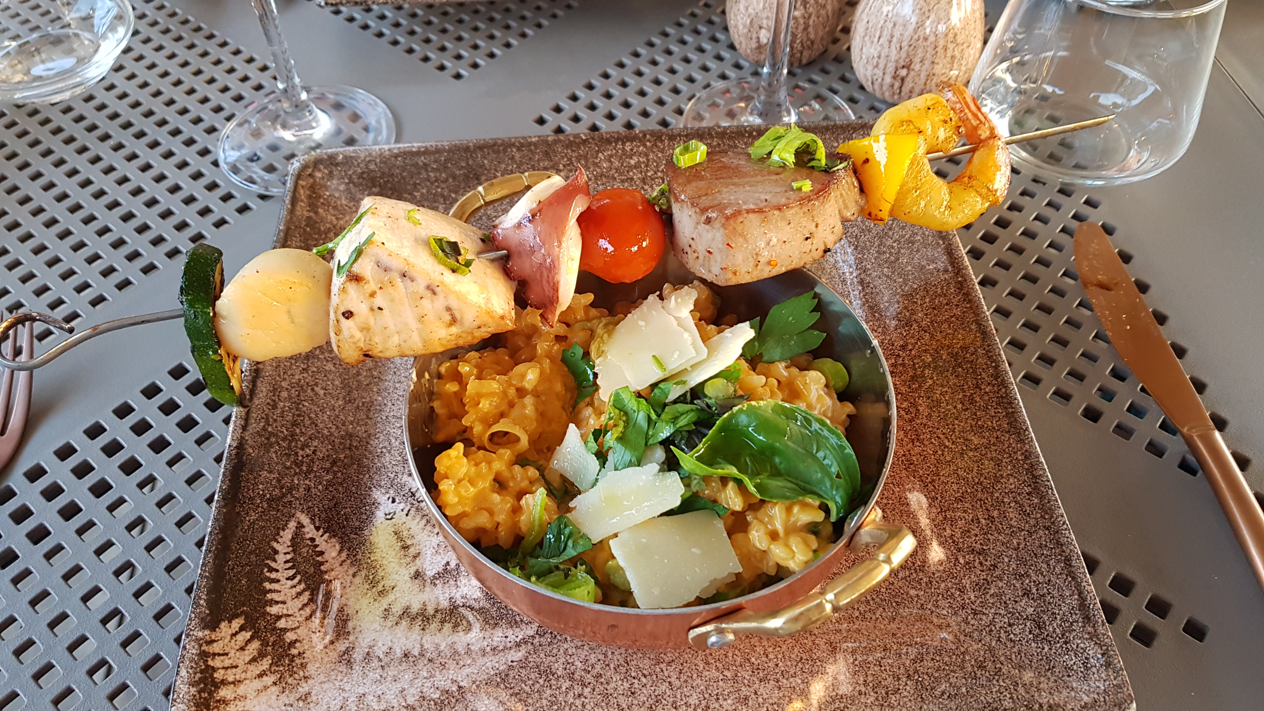 Une excellente soirée en famille avec les chants Corse, que du bonheur. Sans oublier le repas et non des moindres avec : en apéro un cocktail excellent, des beignets de courgettes, suivi d'une brochettes de la mer et son risotto (je n'ai pas pris le dessert en photo mais la tarte au citron-passion et morceaux de mangue était délicieuse) ... vivement la prochaine soirée.