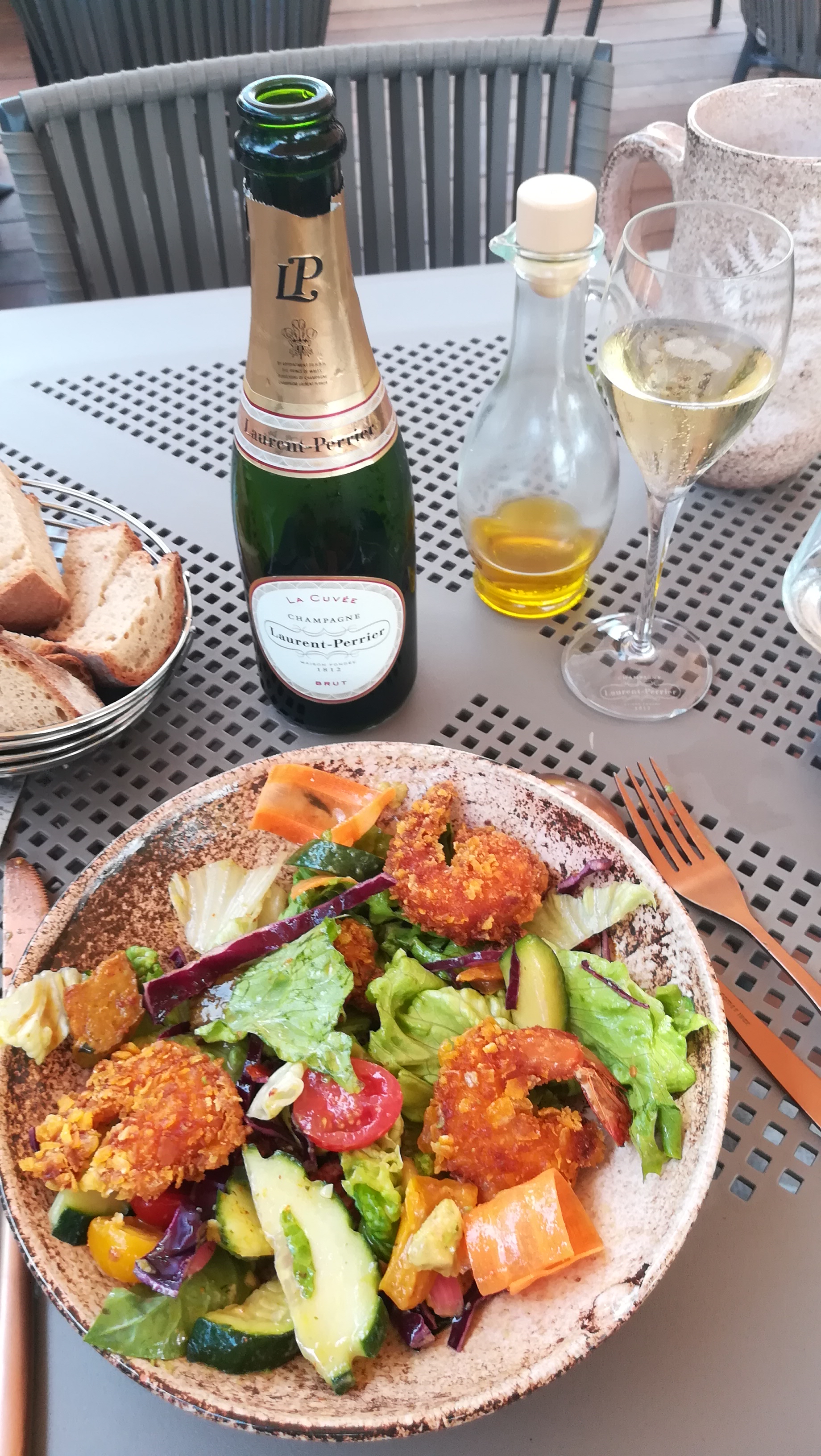 Repas de midi ce jour. Très bonne salade de gambas (même si pour moi c'était des crevettes) cuites avec avocat et légumes de saison. Bon accueil de la serveuse. En terrasse, la haie isole des autres restaurants et des allées et venues des véhicules et le grand parasol abrite du soleil. J'ai aimé prendre le thé gourmand dans les fauteuils club autour de la cheminée. En résumé, cuisine de qualité et décor soigné. Les prix un peu élevés sont justifiés. J'avais choisi le restaurant avec la meilleure note parmi tous les autres du secteur, sans regret, je recommande.
