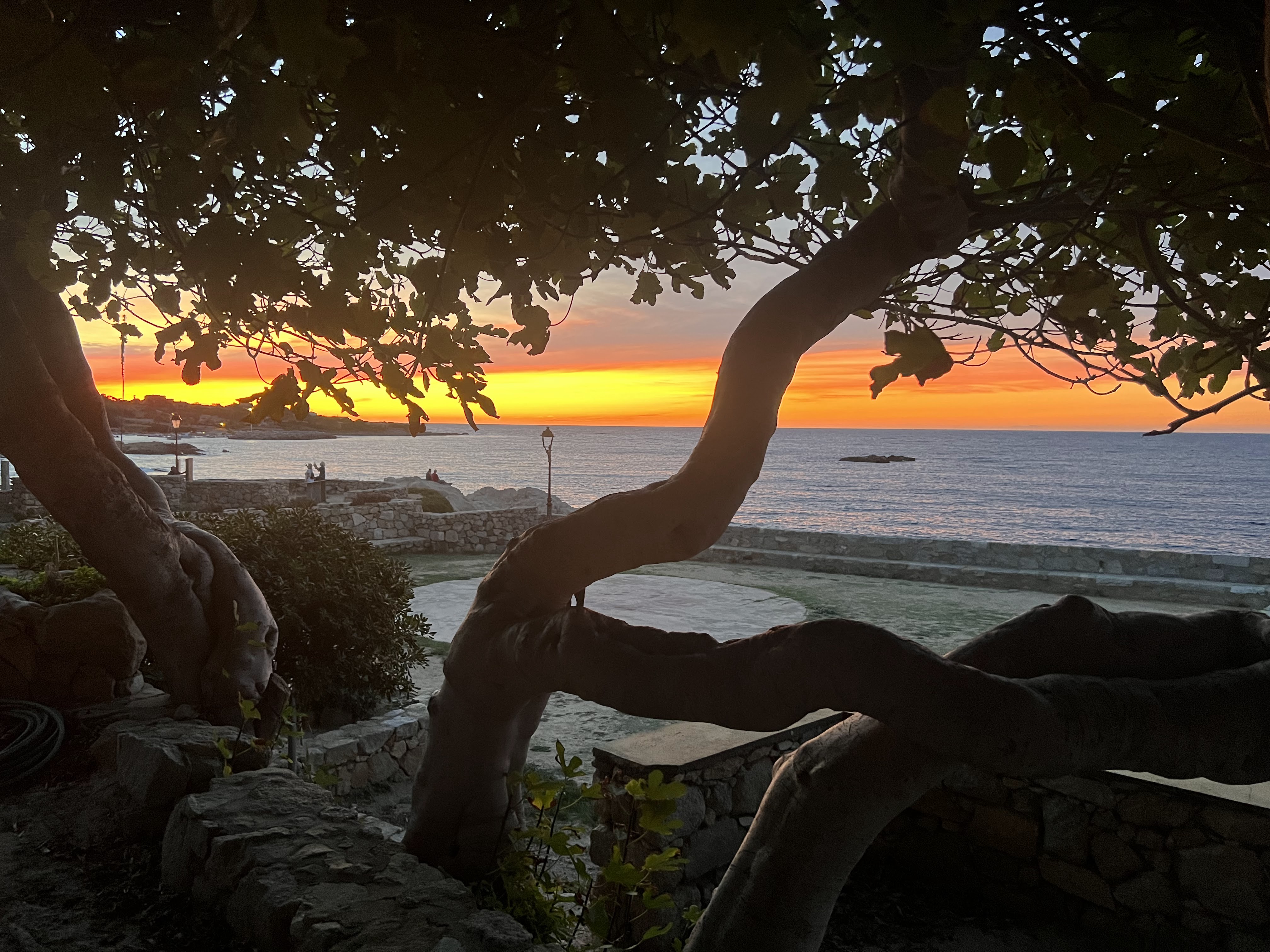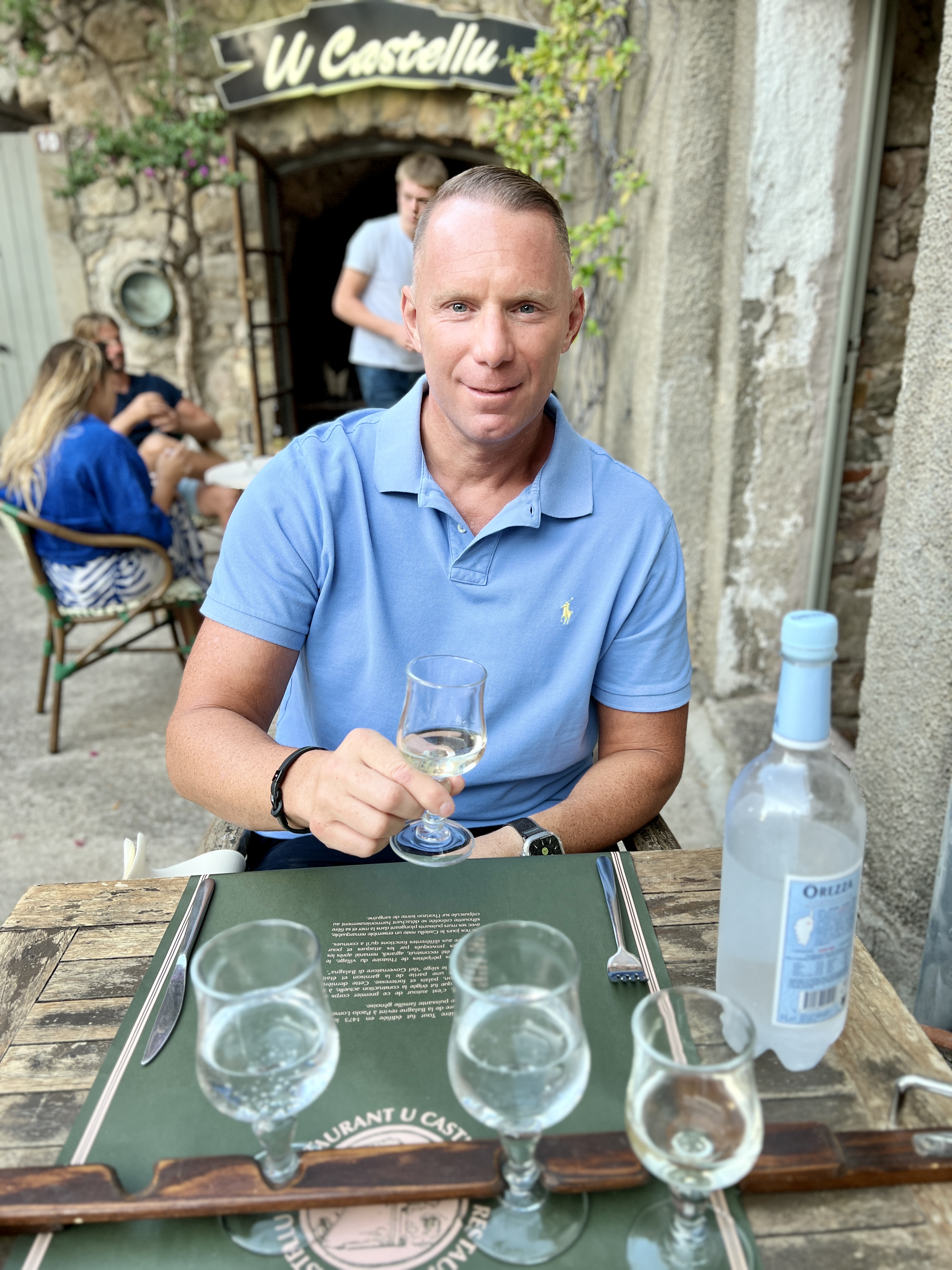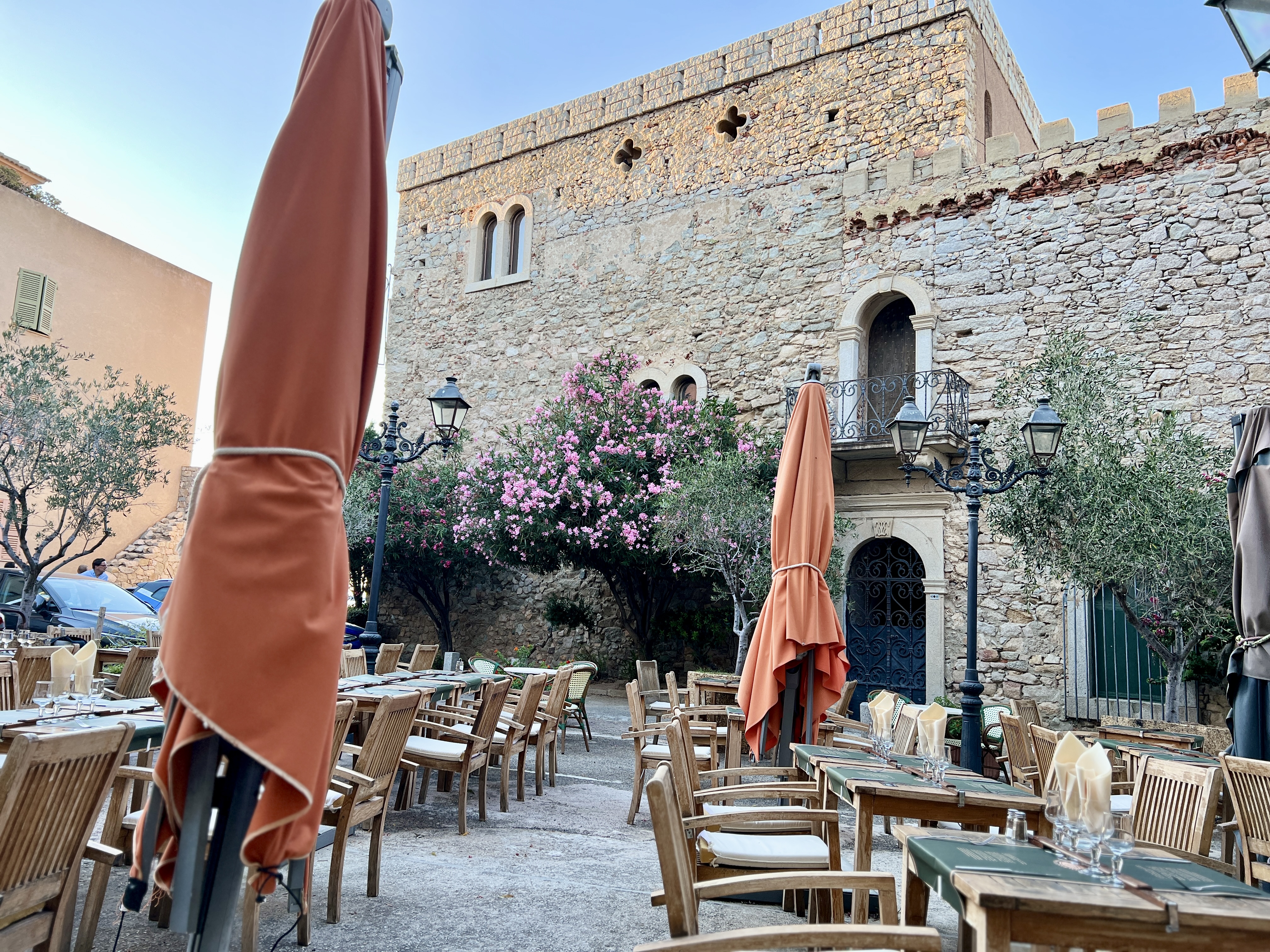 Seuls, sur une table isolée en dessous de la voûte du Castellu, avec une vue mer époustouflante. Accueil chaleureux et cuisine très savoureuse, pour un budget de 100€ pour 4 personnes