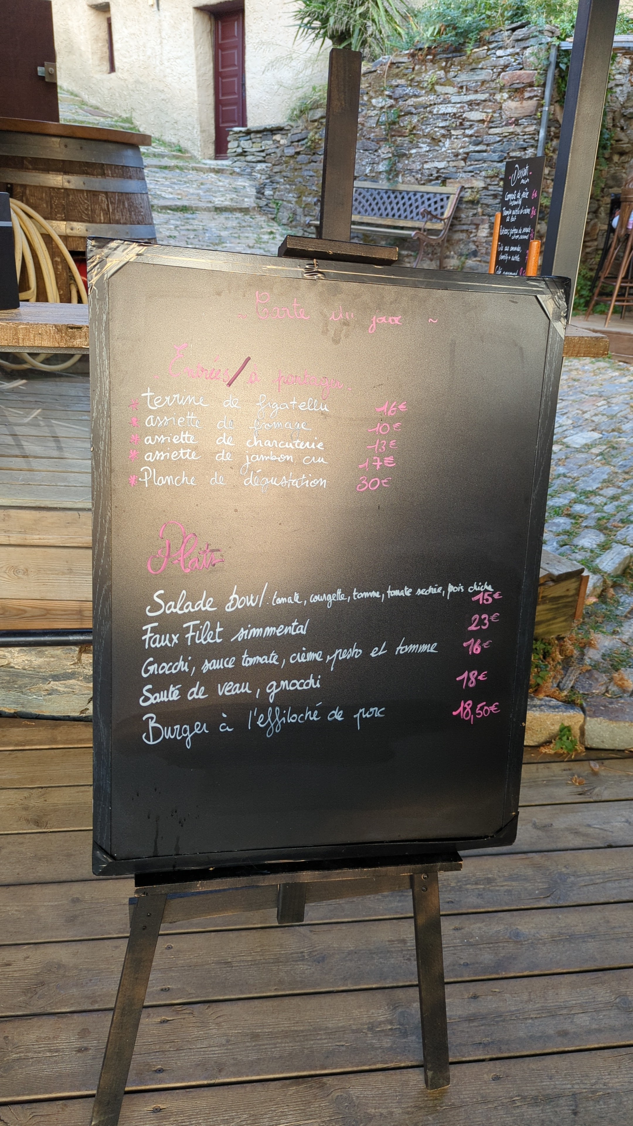 Pas pu s'asseoir au bord pour profiter de la vue. Il y avait de la place pourtant, nous pas compris pourquoi. Nous avons commandés un Burger à Filoche de porc. Un peu gras mais excellent, le filet mignon roulé dans le lard est excellent également. Niveau service pas grand chose à dire, personnel gentil et correct Et très Serviable. Je mets 4 étoiles parce-que nous avions eue plus 40 min d'attente après notre commande. Sinon le cadre est très jolie et vos le détour. Je recommande au passage. Et le village est super beau.