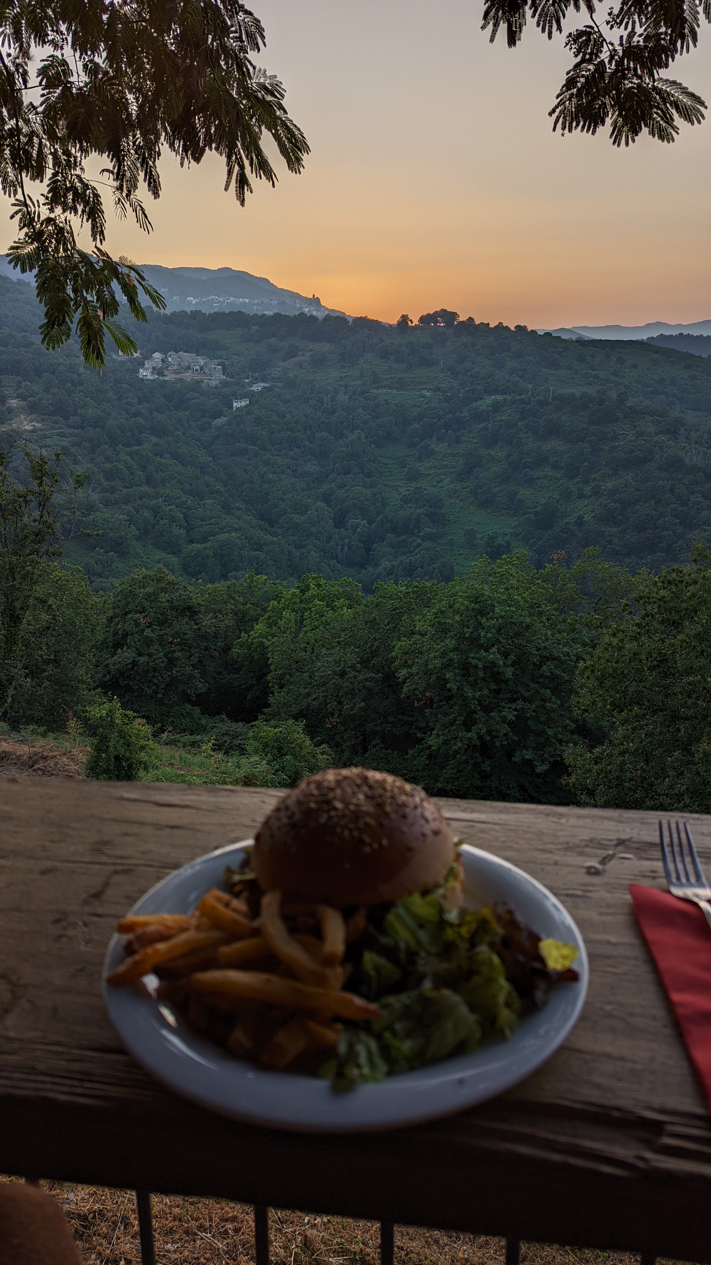 Le restaurant bénéficie d'un cadre unique à la frontière du village médiéval penta-di-casinca. A 400m d'altitude vous dominez la baie de Bastia et une partie du cap Corse. Le menu est très limité - nous avons eu des gnocchis bolognaises et 3x le burger de porc effiloché + vin et eau nous ont laissé une facture de 110 €. Les gnocchis étaient de goût neutre, les hamburgers étaient de bon goût et accompagnés de frites cuites à l'huile d'olive et d'une salade. Le service était plutôt lent, ils ont tendance à prendre table par table car ils n'ont qu'un seul menu. L'endroit est bondé à 20h00 alors assurez-vous de faire une réservation