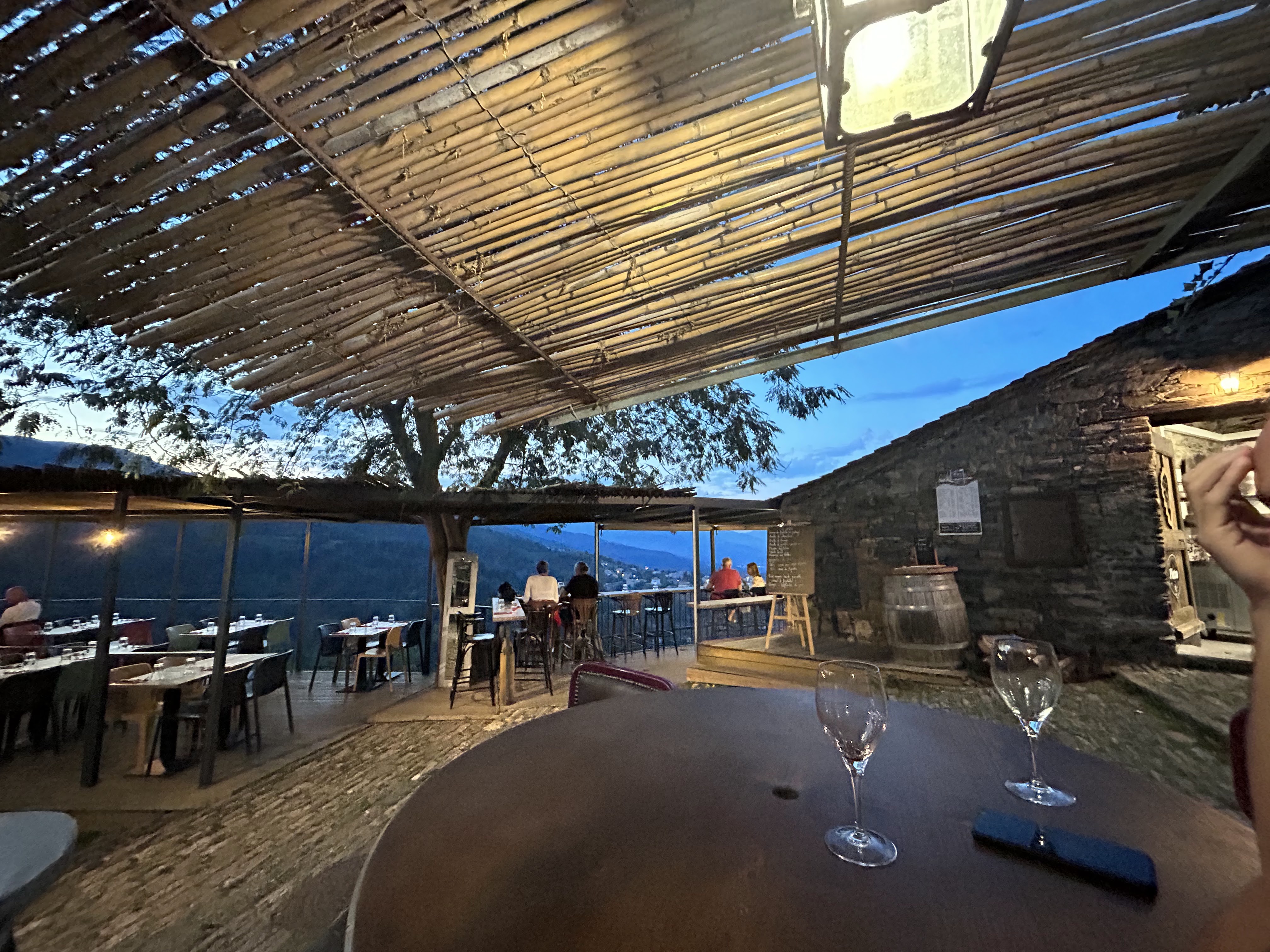 On s est promis de revenir pour admirer la vue de jour . En soiree Bel endroit en pierre atypique vu panoramique avec les lumières des villages voisins et de la plaine. L équipe, service tres agréable souriant et accueillant. Spécialités corses plats soignés bon rapport qualité prix . Merci pour cet agréable moment!!😉