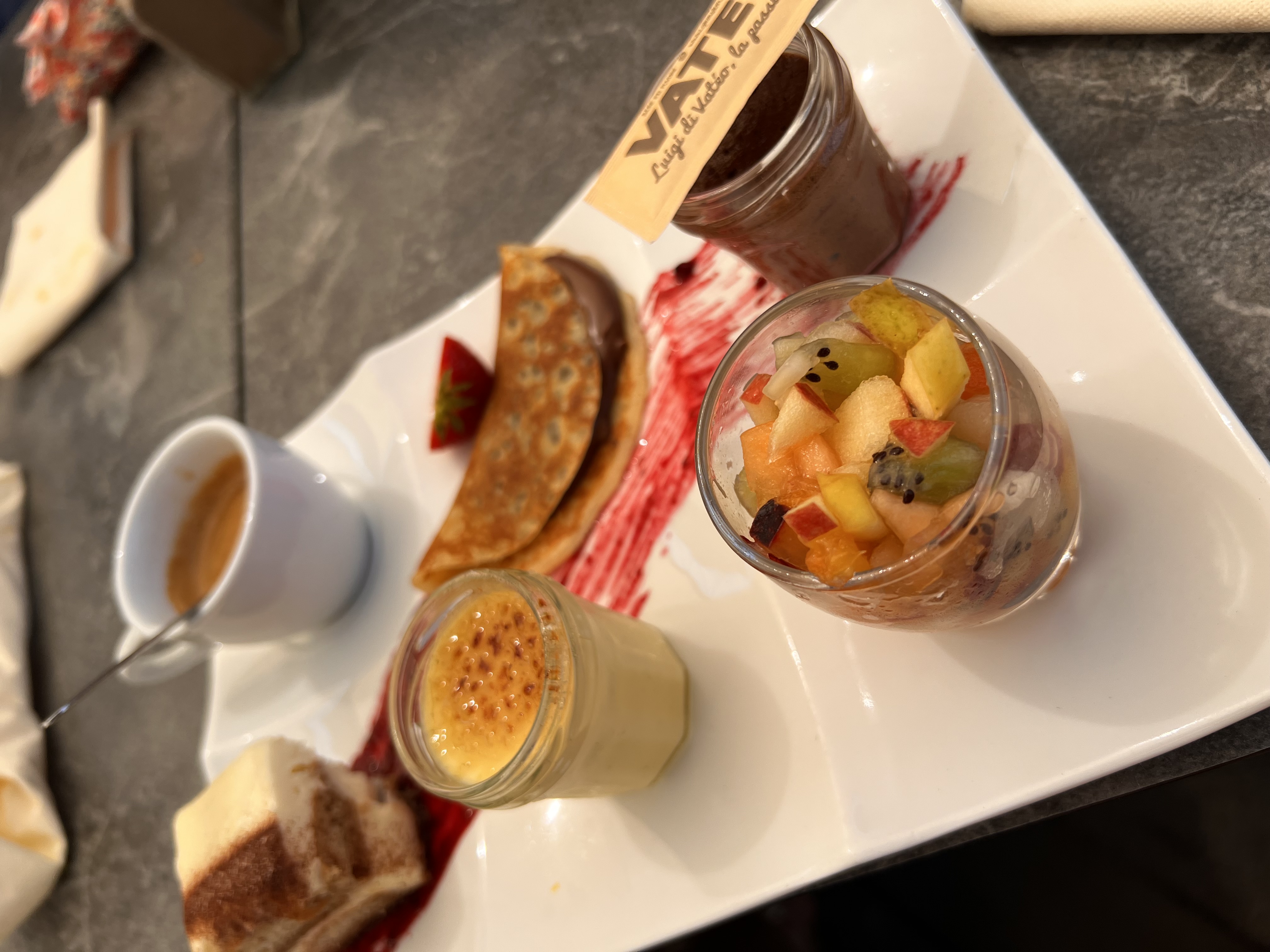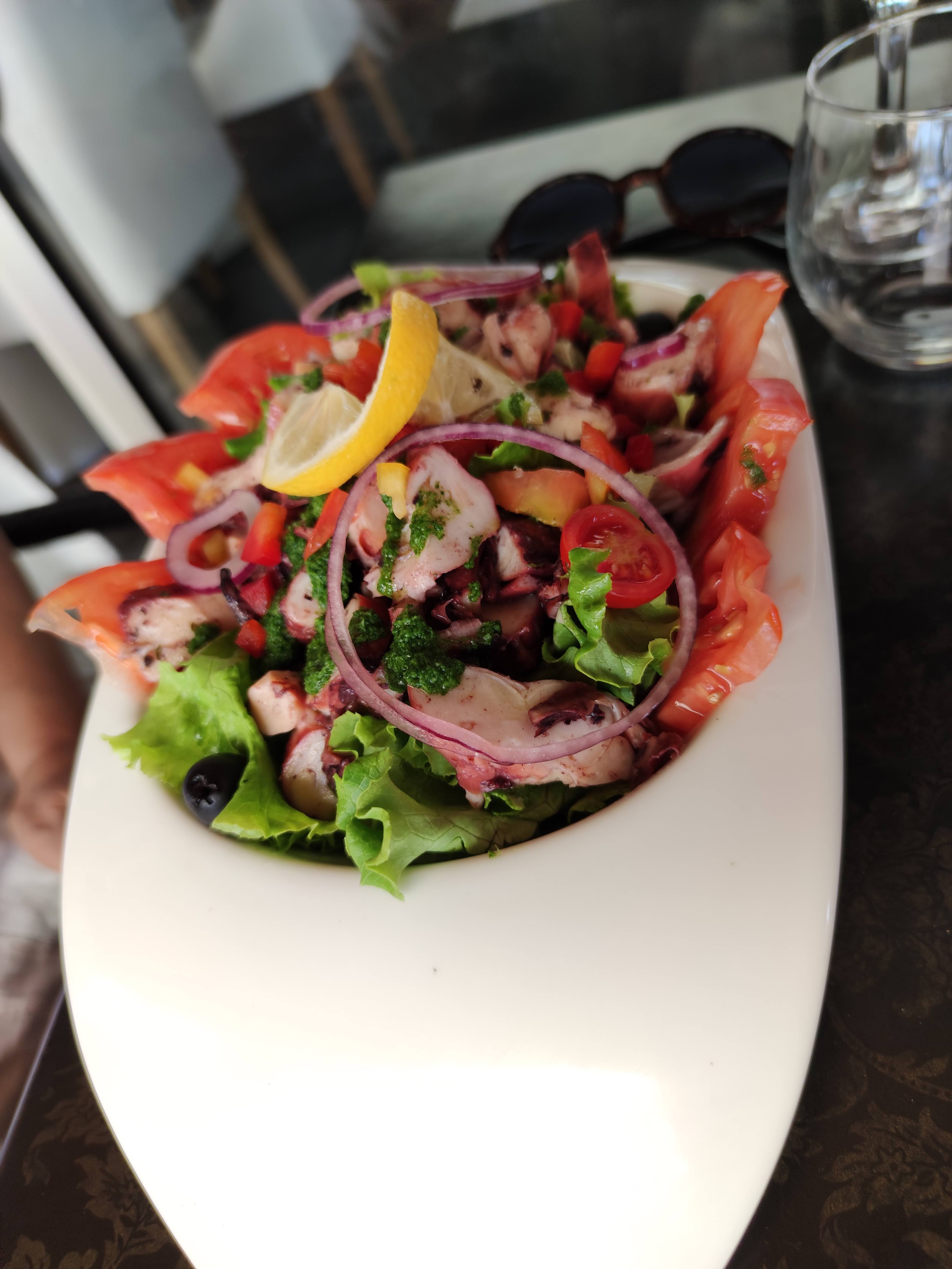 J'ai eu la salade de poulpe, l'aperol spritz et une sélection de desserts. Tellement délicieux!! C'était encore plus agréable en s'asseyant à côté de la plage, en regardant le coucher du soleil et en écoutant les vagues. Nos serveurs étaient arrangeants et agréables. Quelle vie fantastique.