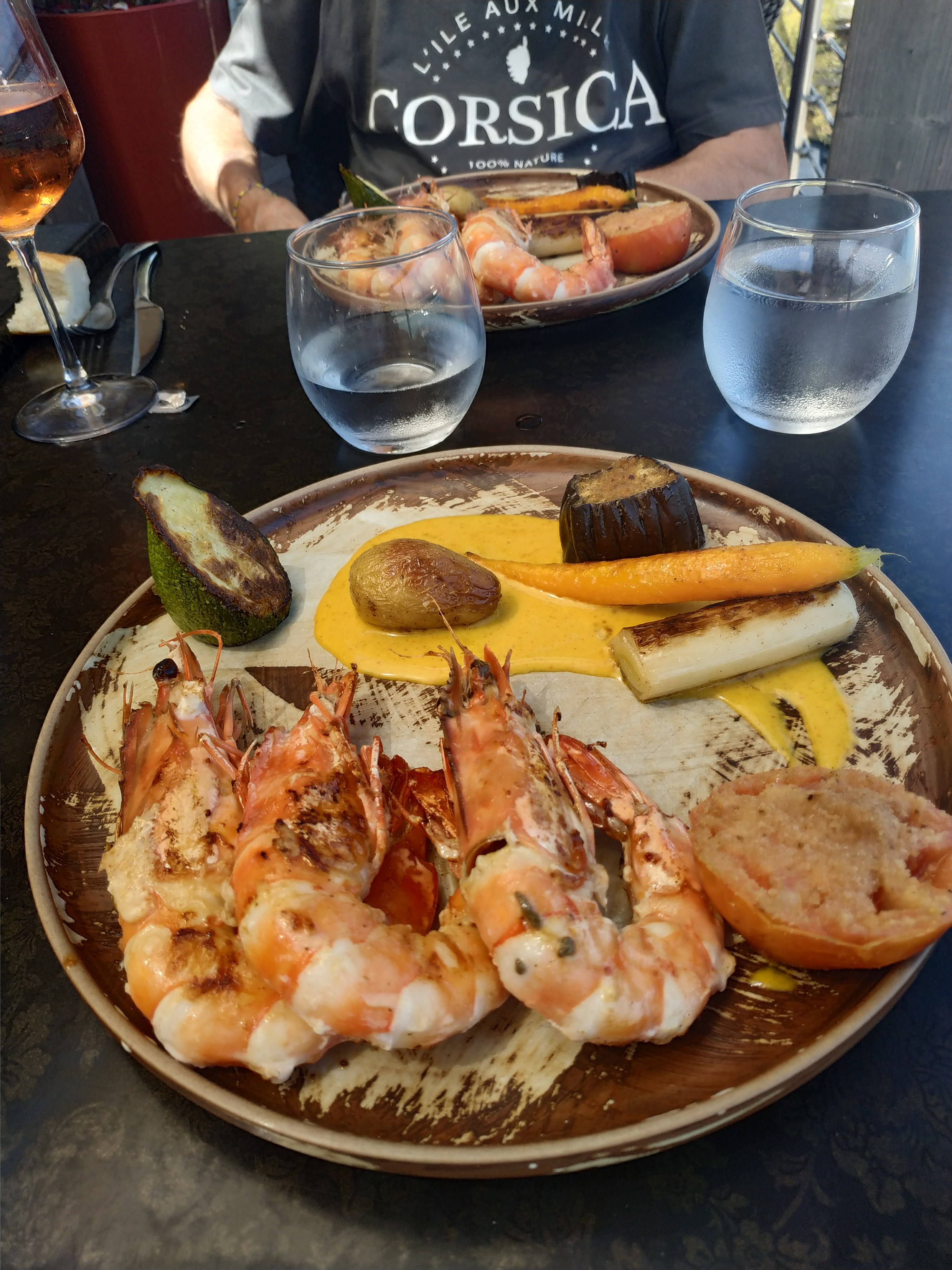 J ai testé les 5 gambas persillées avec un peu de garniture et un bol de frite (pourquoi des frites, on est en corse) ce plat ne vaut pas son prix.