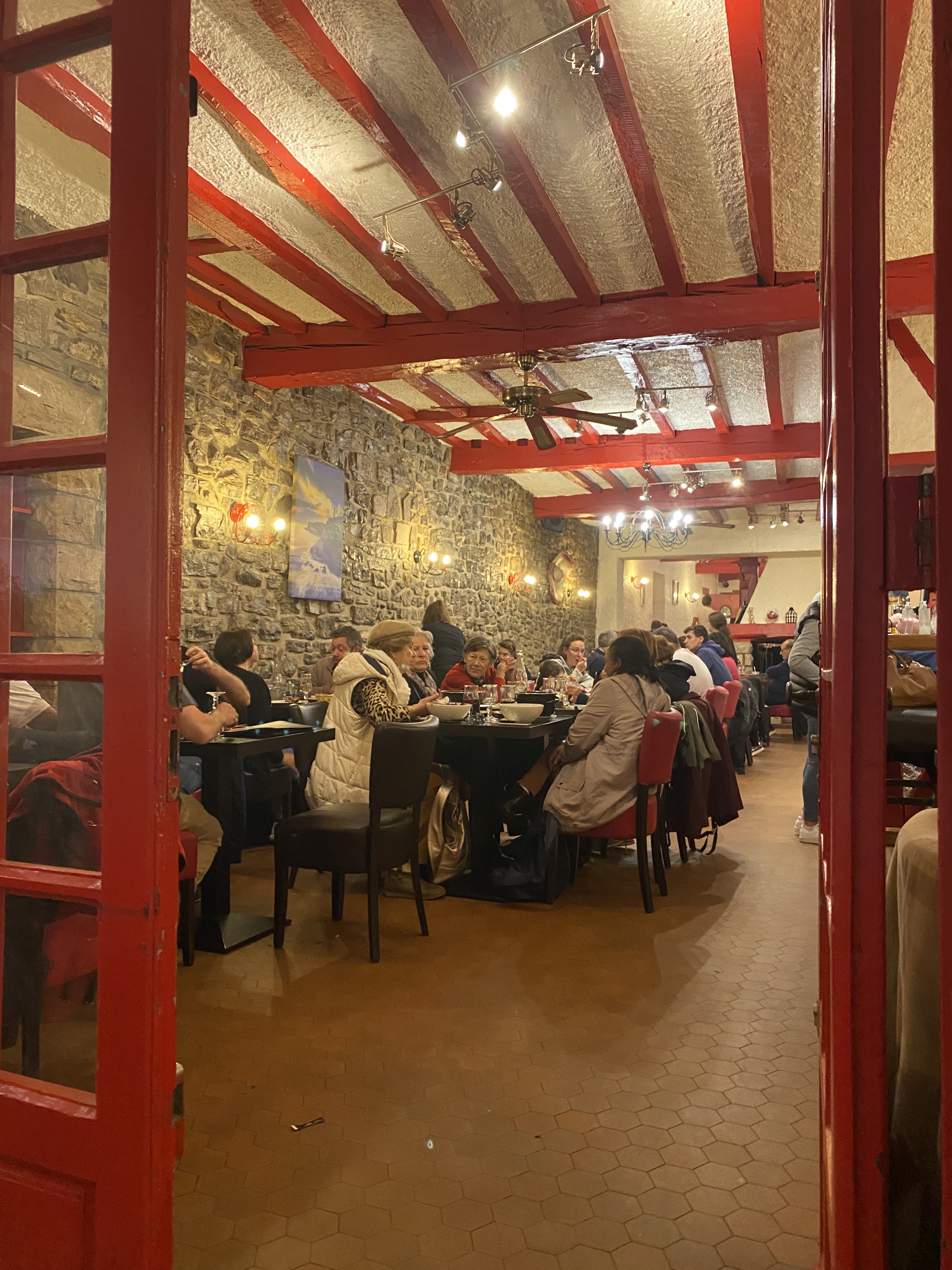 Nous sommes venus pour découvrir la cuisine typique du pays basque. Nous avons vite regretté notre choix : serveurs qui s’insultent toute la soirée, qui éclatent leurs assiettes par terre. Une seule serveuse sympathique, les autres sont incapables de nous demander si le repas s’est bien passé ou simplement de nous souhaiter bon appétit. Cuisine correcte mais pas extraordinaire. Si vous êtes touristes je ne vous conseille pas d’y aller, je pense qu’aucun local ne s’y rend !