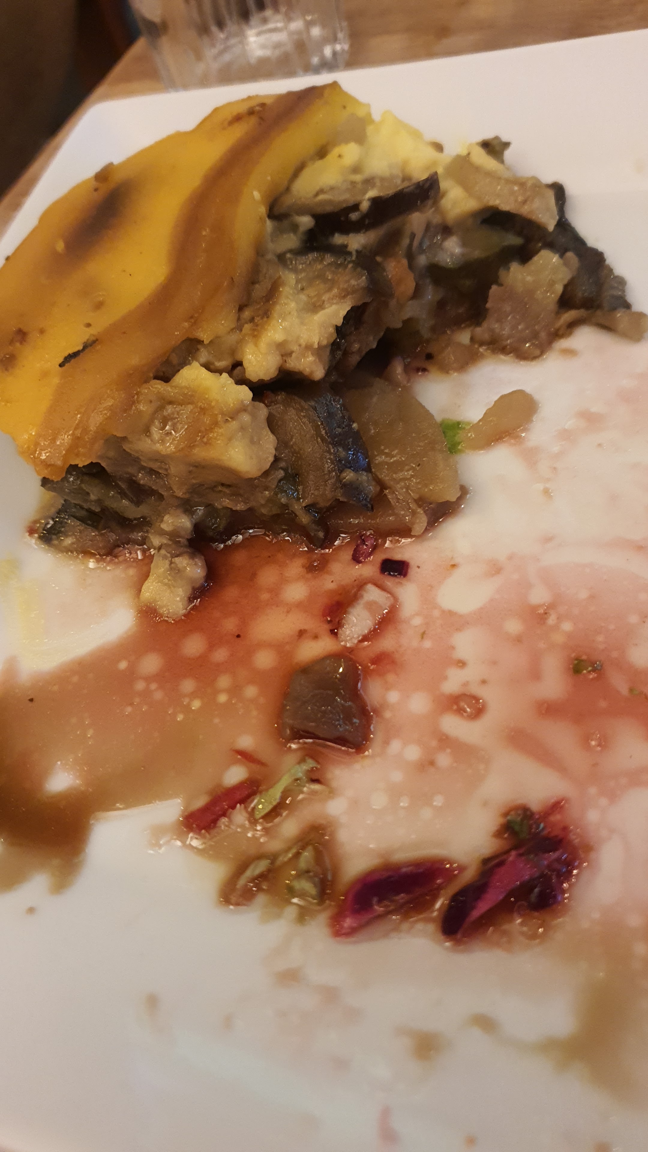 Nous avons commandé des aubergines farcies et du houmous aux falafels. Les deux étaient bons, mais pas géniaux. Pour être honnête, j’avais de plus grands espoirs dans cet endroit. Le service était cependant très rapide.