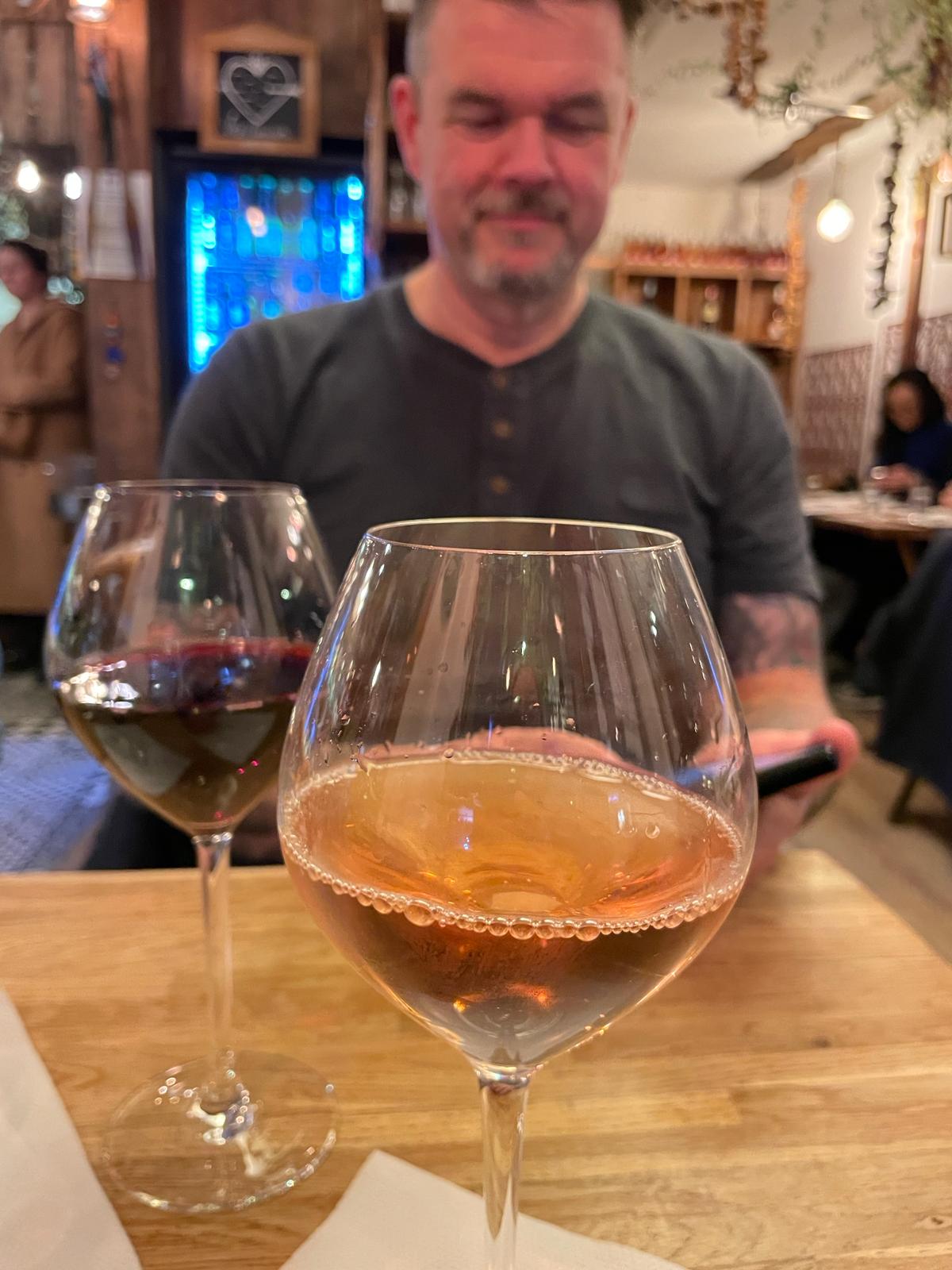 Excellente nourriture végétalienne et autre. Tout le vin turc frais et étonnamment bon. Je ne connaissais pas le vin de Turquie auparavant. Il devrait être plus disponible et populaire