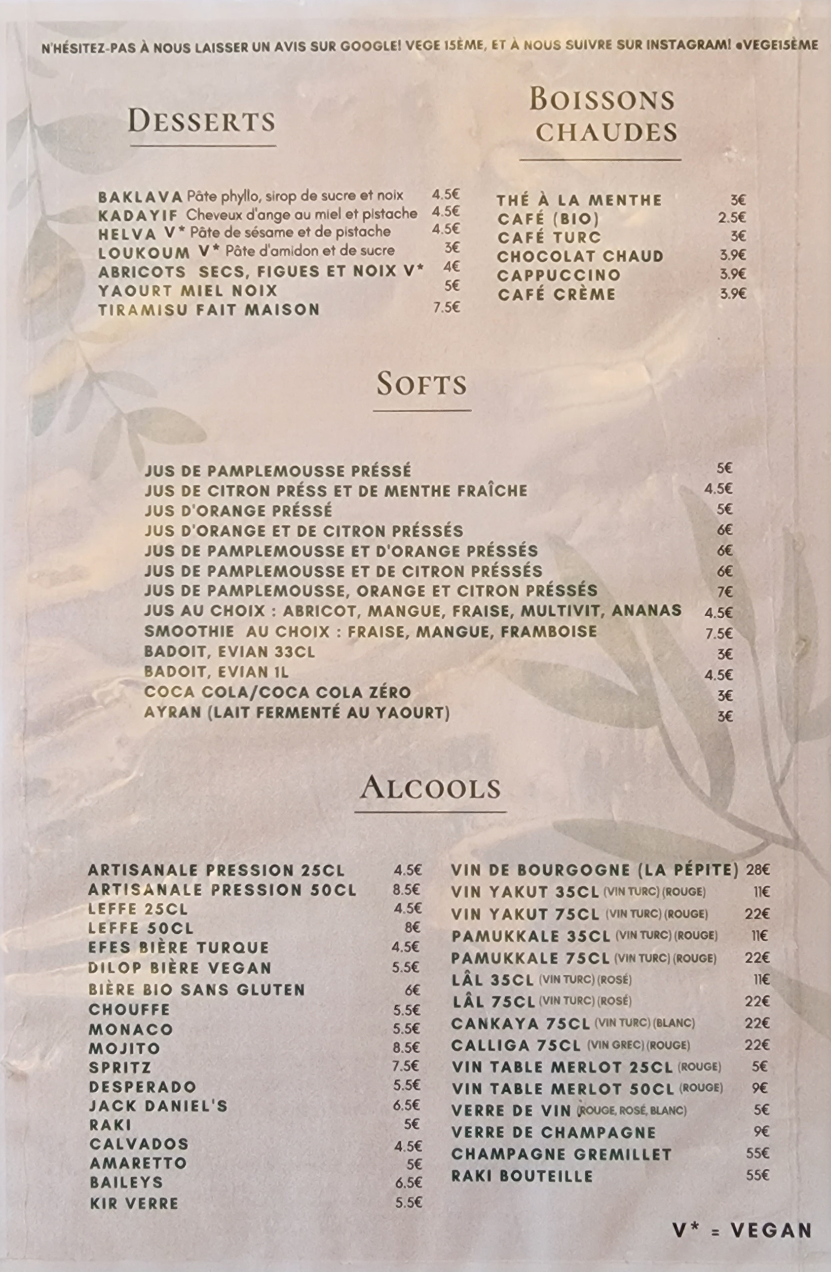 Un restaurant végétarien aux airs libanais ! Une carte d'entrées à partager pleine de saveurs, la possibilité de les prendre individuellement ou d'avoir un assortiment de 6 à 8 entrées (pour une fourchette de prix de 20€) à partager. Des plats aussi à une quinzaine d'euros et des desserts à découvrir ! La vitrine donne envie de tout commander ! Et l'exposition des légumes devant nous nous assure la fraîcheur et la qualité des produits. Idéalement situé dans le 15e, pas loin de l'arrêt Commerce (ligne 8) et de l'arrêt Avenue Émile Zola (ligne 10) : le quartier est également très sympa à visiter ! :) Réservations recommandées !