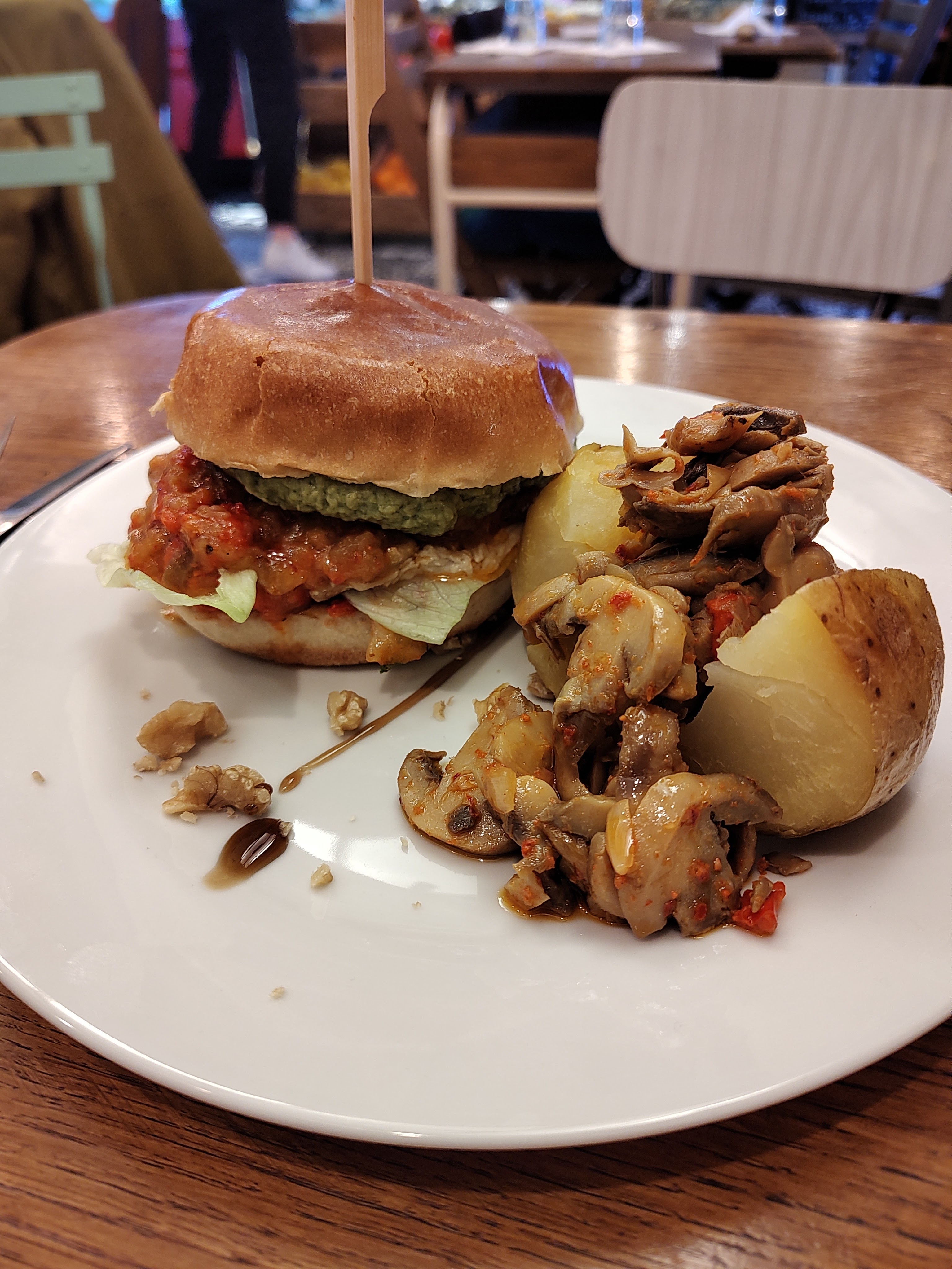 Finalement repéré un restaurant vegan à Paris pour découvrir la nourriture décevante. J'ai commandé le hamburger végétalien mais il était composé de garnitures froides et ressemblant à de la bouillie. Très étrange, mais certaines leçons sur les alternatives à base de plantes en bénéficieraient.