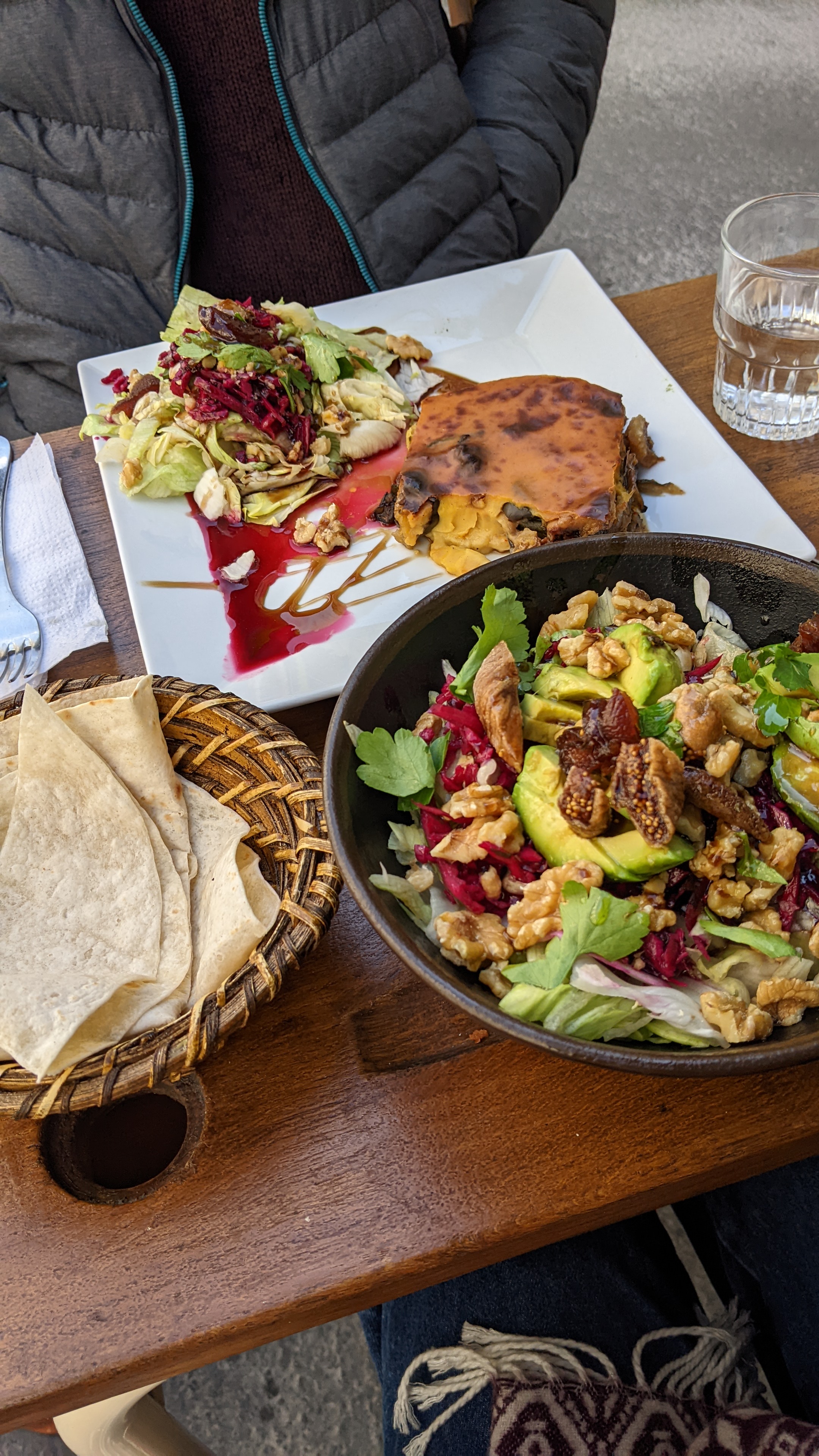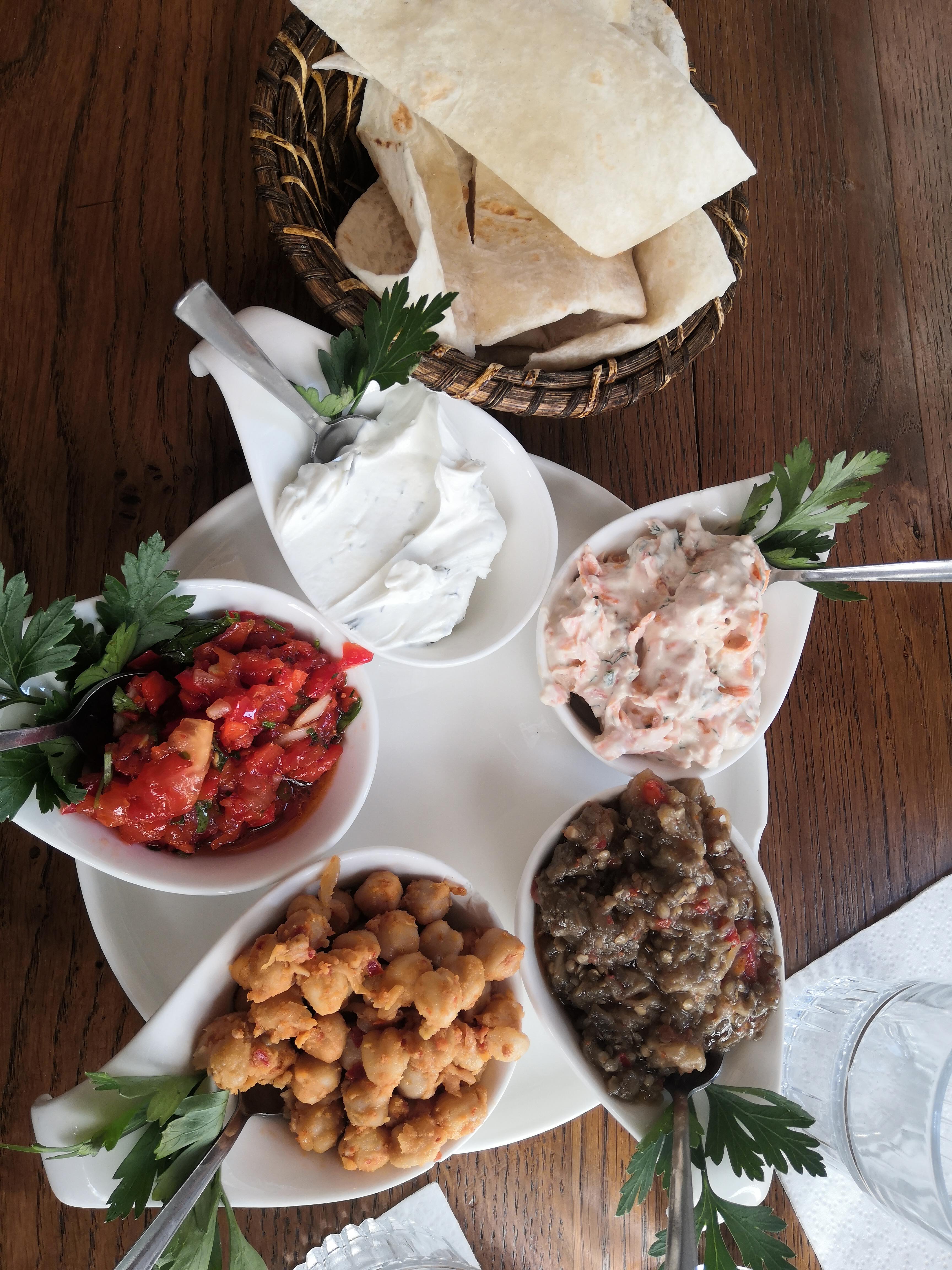 Cuisine végétarienne et végétalienne d'inspiration turque étonnante et savoureuse. Nous avons eu l'assortiment d'entrée (apéritif) - 8 plats sélectionnés par le chef avec un pain plat chaud et frais semblable à une tortilla, puis nous avons divisé le kofte pour terminer par un excellent baklava. Une carafe de Merlot maison était également une bonne idée.