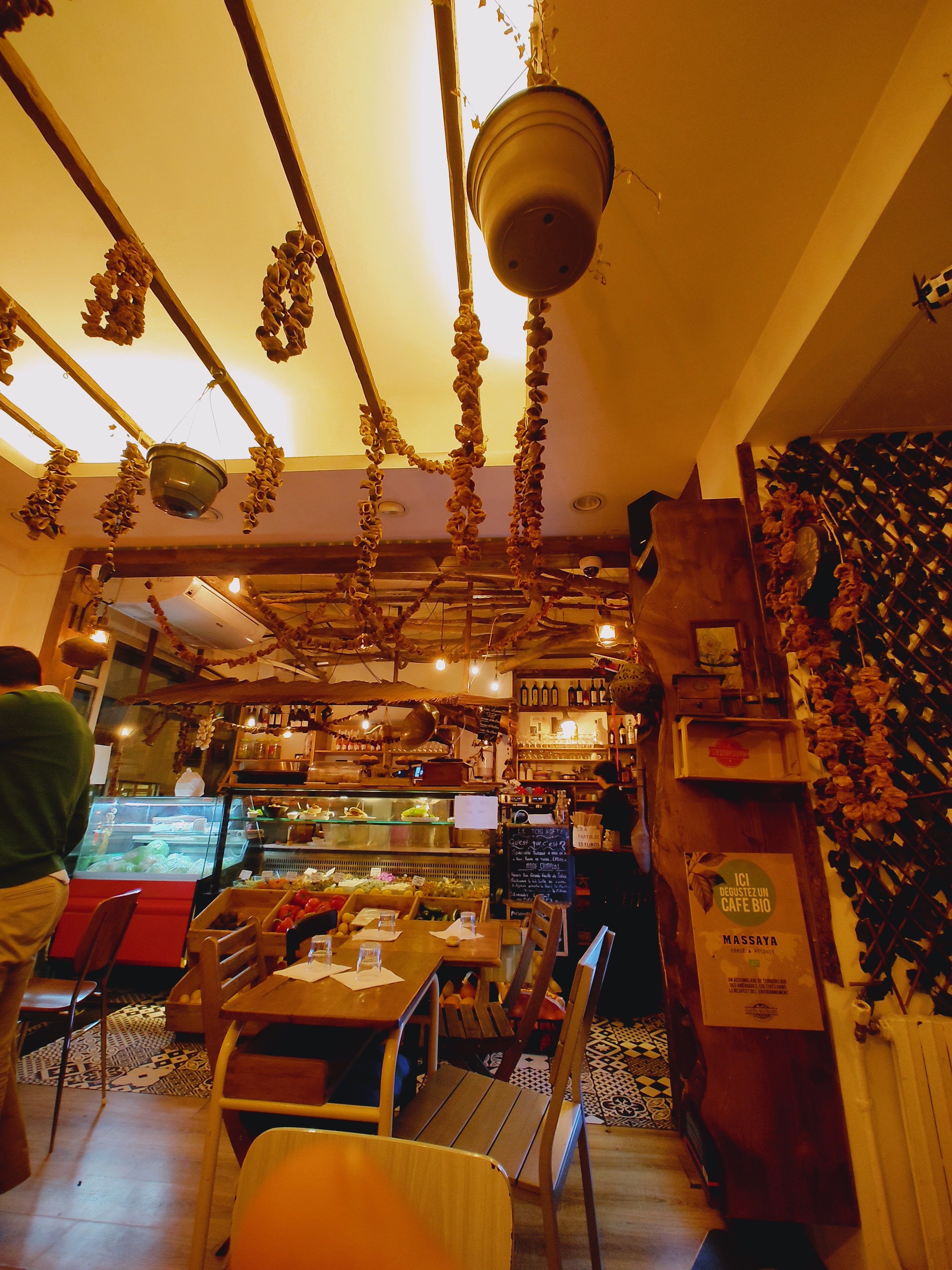En passant devant, on ne s’y arrêterait pas. Mais il vaut pourtant le détour tant il est bon et dépaysant. On y est bien, on mange sainement avec énormément de plaisir. On s’y régale de produits d’une fraîcheur absolue à des prix imbattables : des salades de légumes (lentilles, caviar d’aubergine, chou rouge), des galettes fourrées (exemple falafel et houmous) délicieuses, des petits plats savoureux (aubergine farcie, moussaka). On y croise des gens seuls, des couples, des groupes d’amis, des familles, de tous les âges. Et tout cela dans un restaurant authentique. Que demander de plus ?