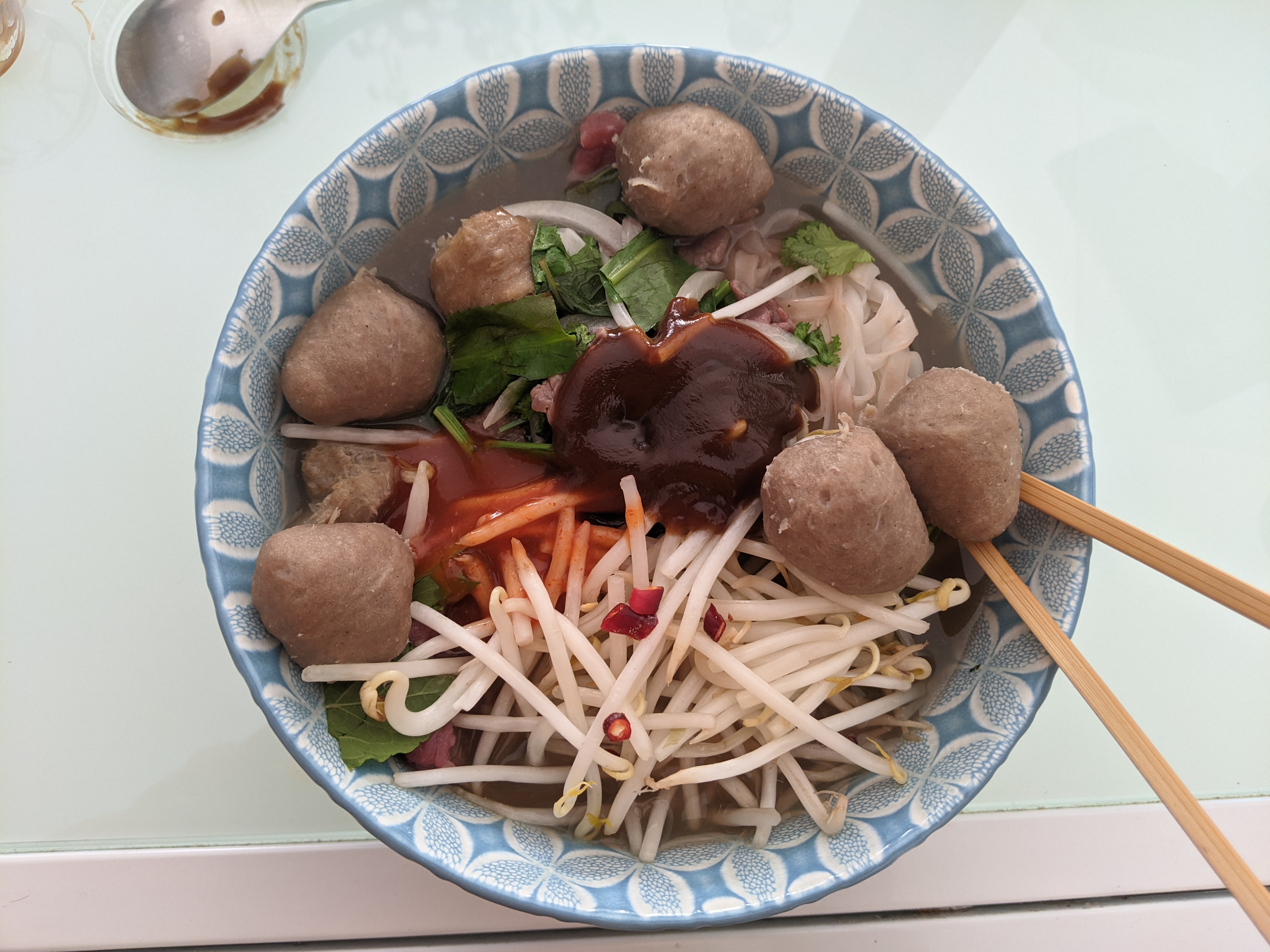 Commande deliveroo pendant le confinement (télétravail). J'ai commandé un pho boulettes de bœuf. Emballage au top. Le plat est très bon. Et en plus ils n'ont pas oublier le soja et les herbes fraîches !