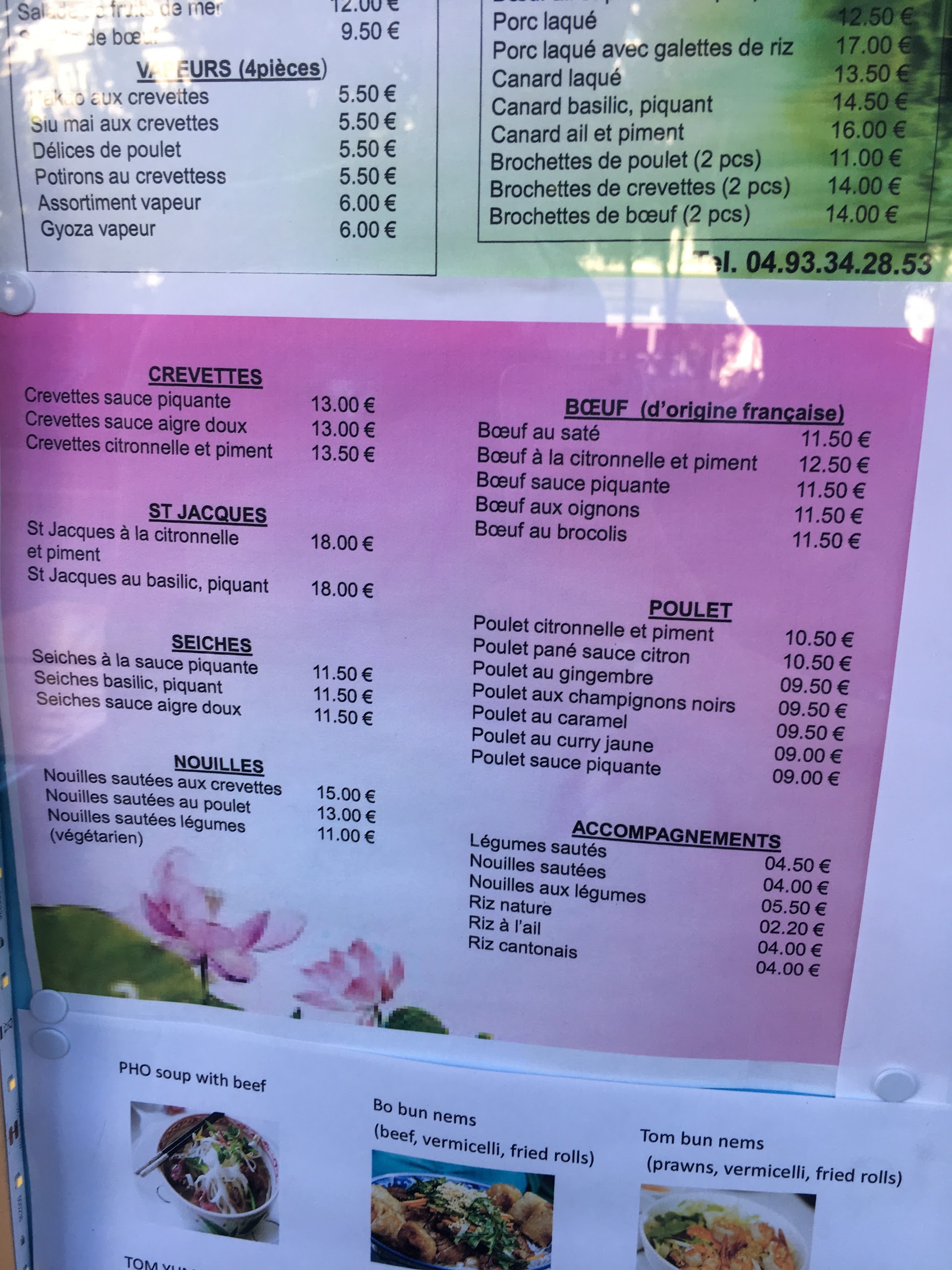 Petit resto vietnamien sympa à Juan-les-Pins. Le restaurant est ouvert sur l'extérieur et propose un menu assez basique. Le service était bon et la dame qui prenait notre commande parlait bien anglais. Je dirais que les rouleaux de printemps (froids) étaient très bons. J'avais une sorte de poulet à la citronnelle, qui était savoureux, bien qu'il s'agisse d'une portion relativement petite. Les prix étaient raisonnables.