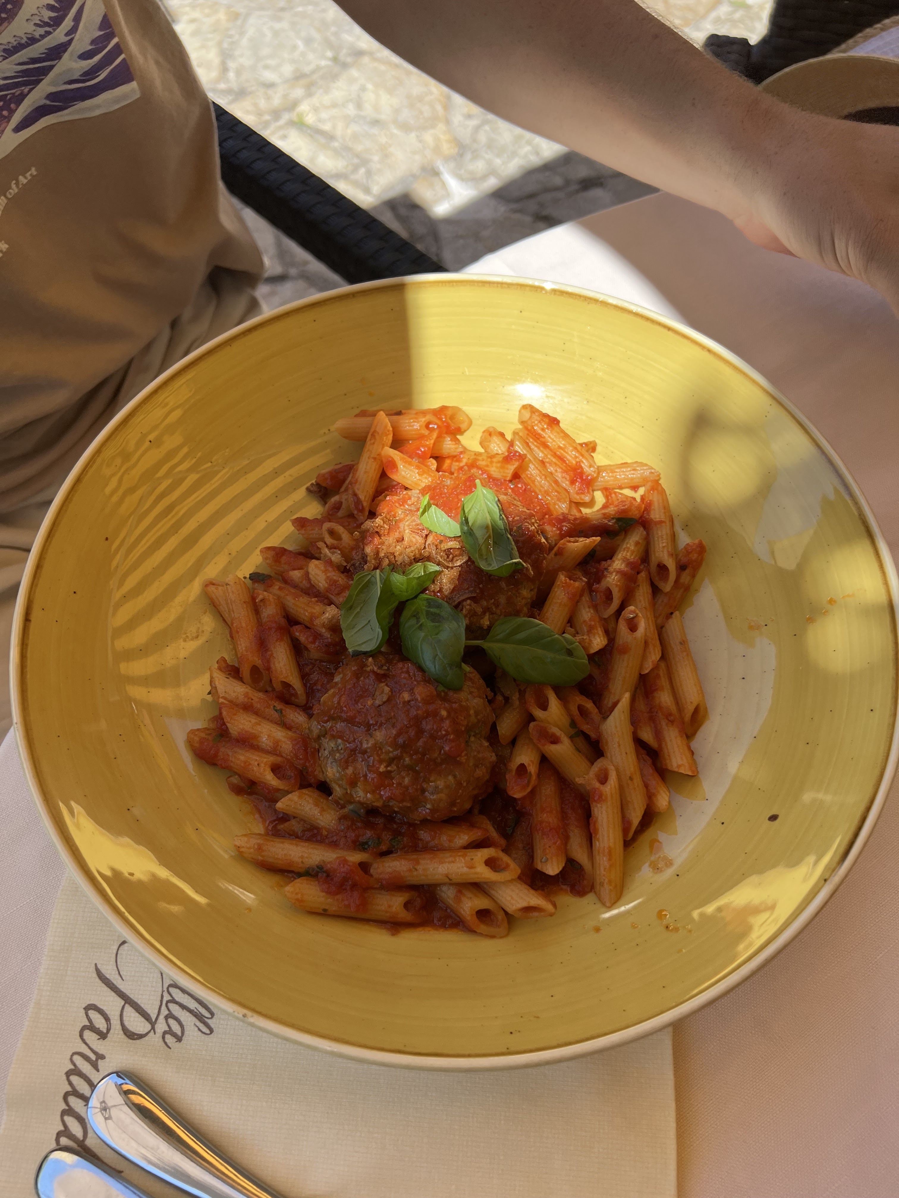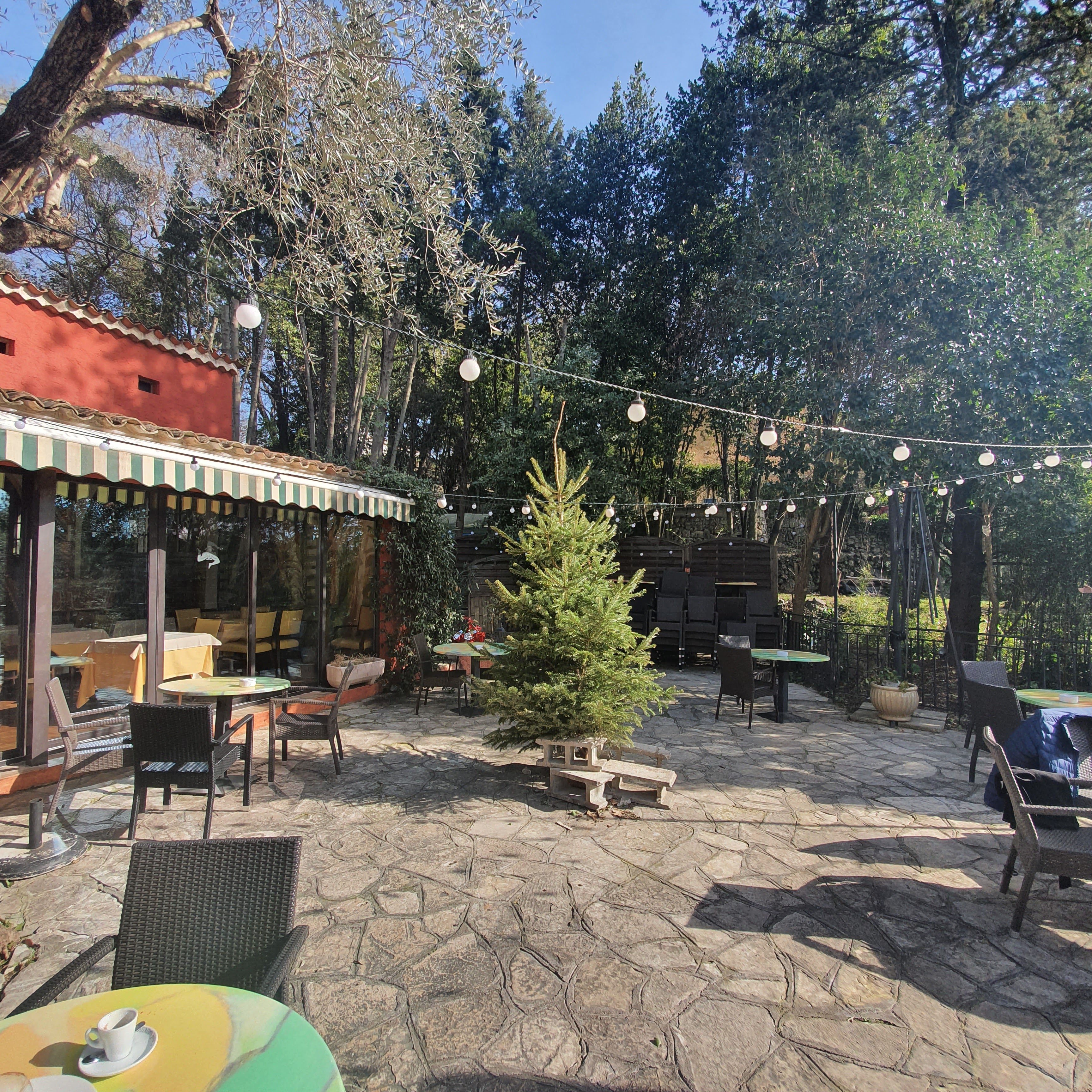 Très bon emplacement, le patio est immergé dans la nature. Le personnel est poli et certains parlent également anglais et italien. La nourriture était bonne et nous la présenterons même si la plupart des assiettes sont assez chères. Je suggère le menu du midi car à 20 € vous obtenez une assiette, un verre de vin, un dessert et un café.