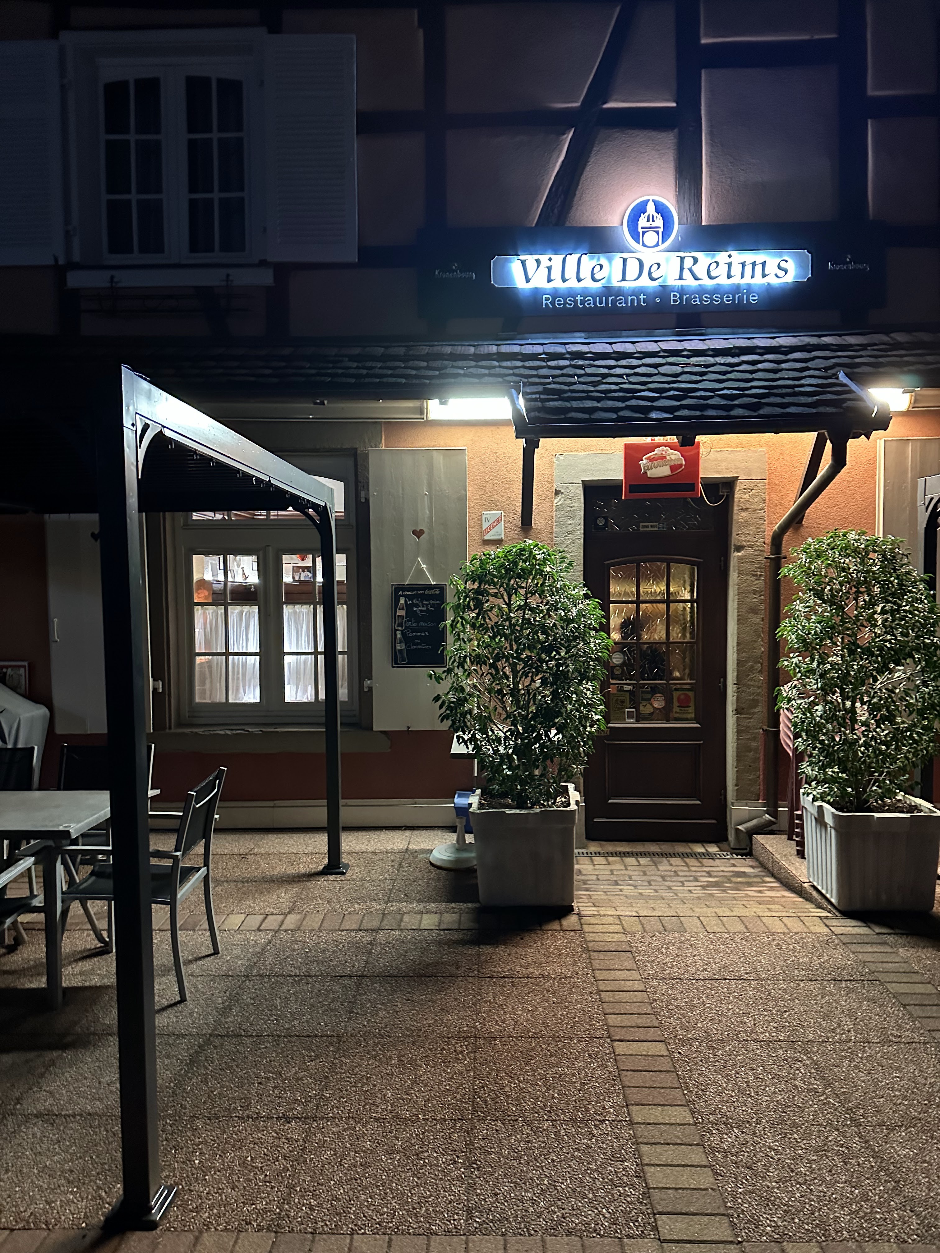 Enseigne originale pour un restaurant alsacien mais cela n'enlève rien au charme de l'endroit et à la qualité des produits. Le repas était excellent. Chapeau à la serveuse qui s'est occupée de la salle toute seule avec sourire et professionnalisme. Jolie découverte. Nous n'hésiterons pas à revenir lors de notre prochain séjour dans cette jolie région. Les prix sont plus que raisonnables pour des produits de qualité. Bravo au chef.