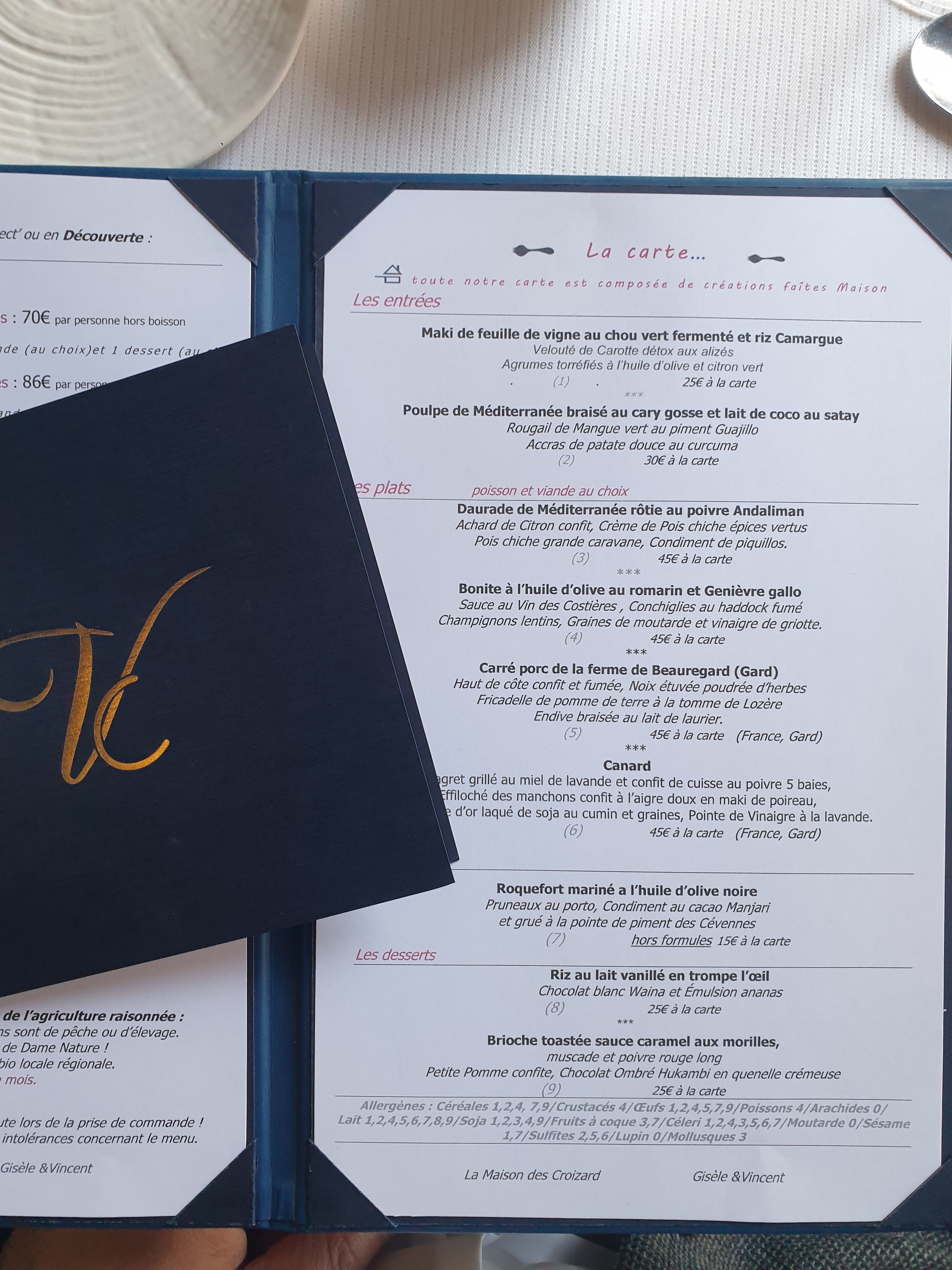 Un lieu unique ,une cuisine raffinée jouant sur les épices.. Merci à Gisèle et Vincent nos hôtes et leur équipe sympathique au service..merci aussi pour l'attention spéciale portée car nous venions fêter un anniversaire de rencontre ..du Darling au Croizard..quel parcours..