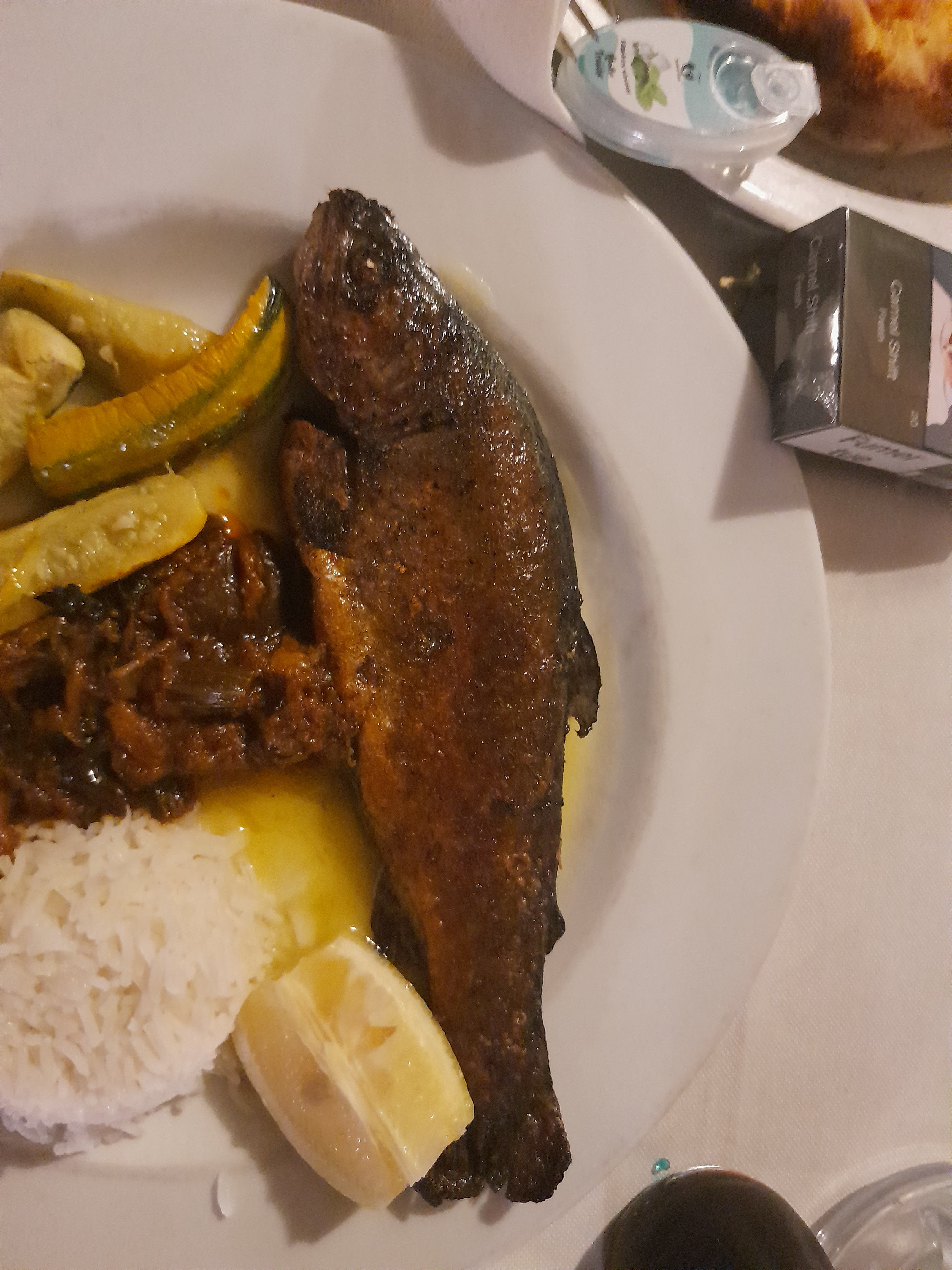 Personnels super sympa j'ai trouvé un peu cher deux petits morceaux de poissons avec quelques poivrons pour 21 euro un tiramisu six Euro cinquante pour moi c'est un peu léger