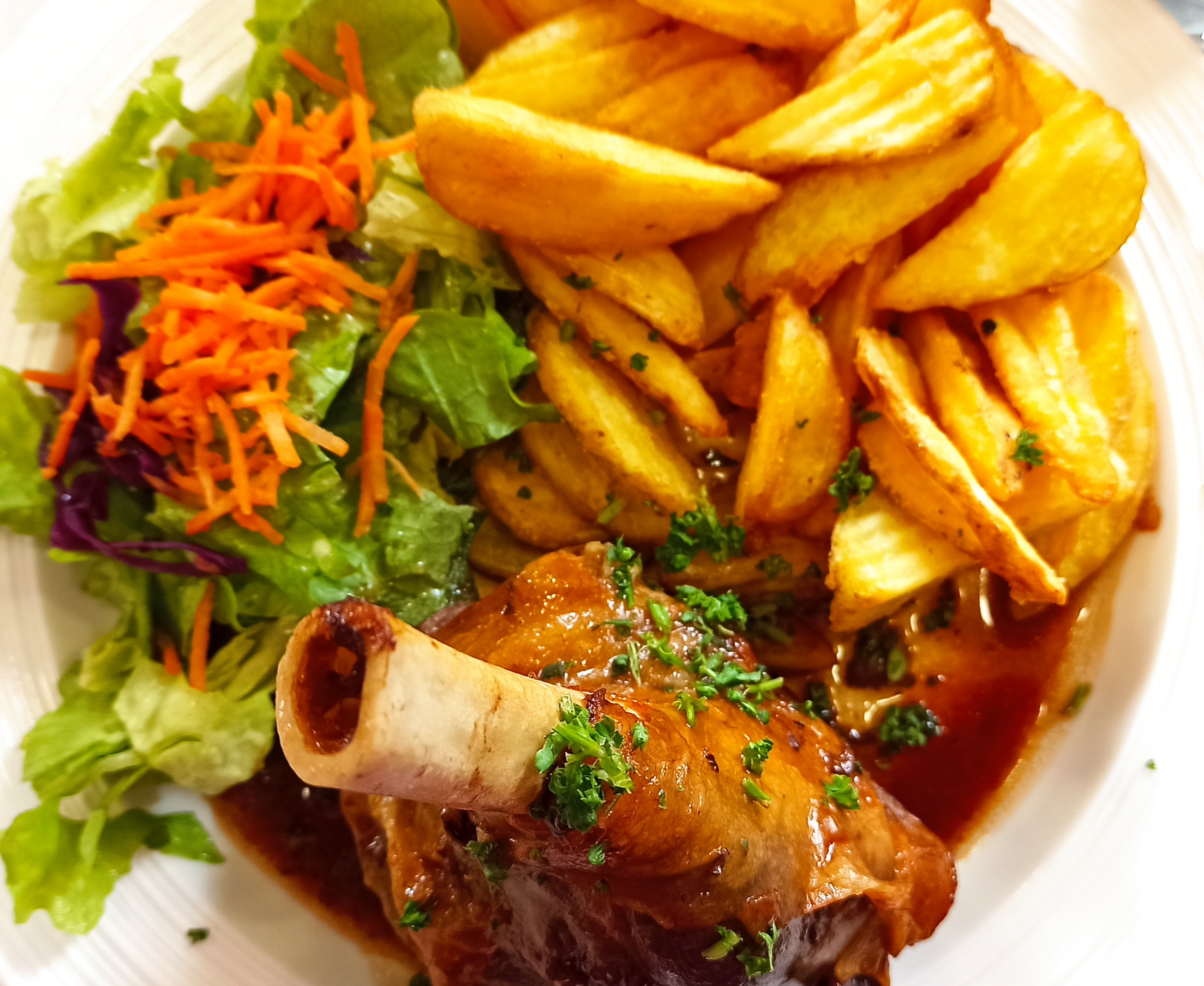 Salades entrée copieuses Le menu du jour prévu avec un accompagnement mais servi avec un autre sans nous prévenir... Mais le serveur a bien réagi et repris le plat sur notre demande Très correct