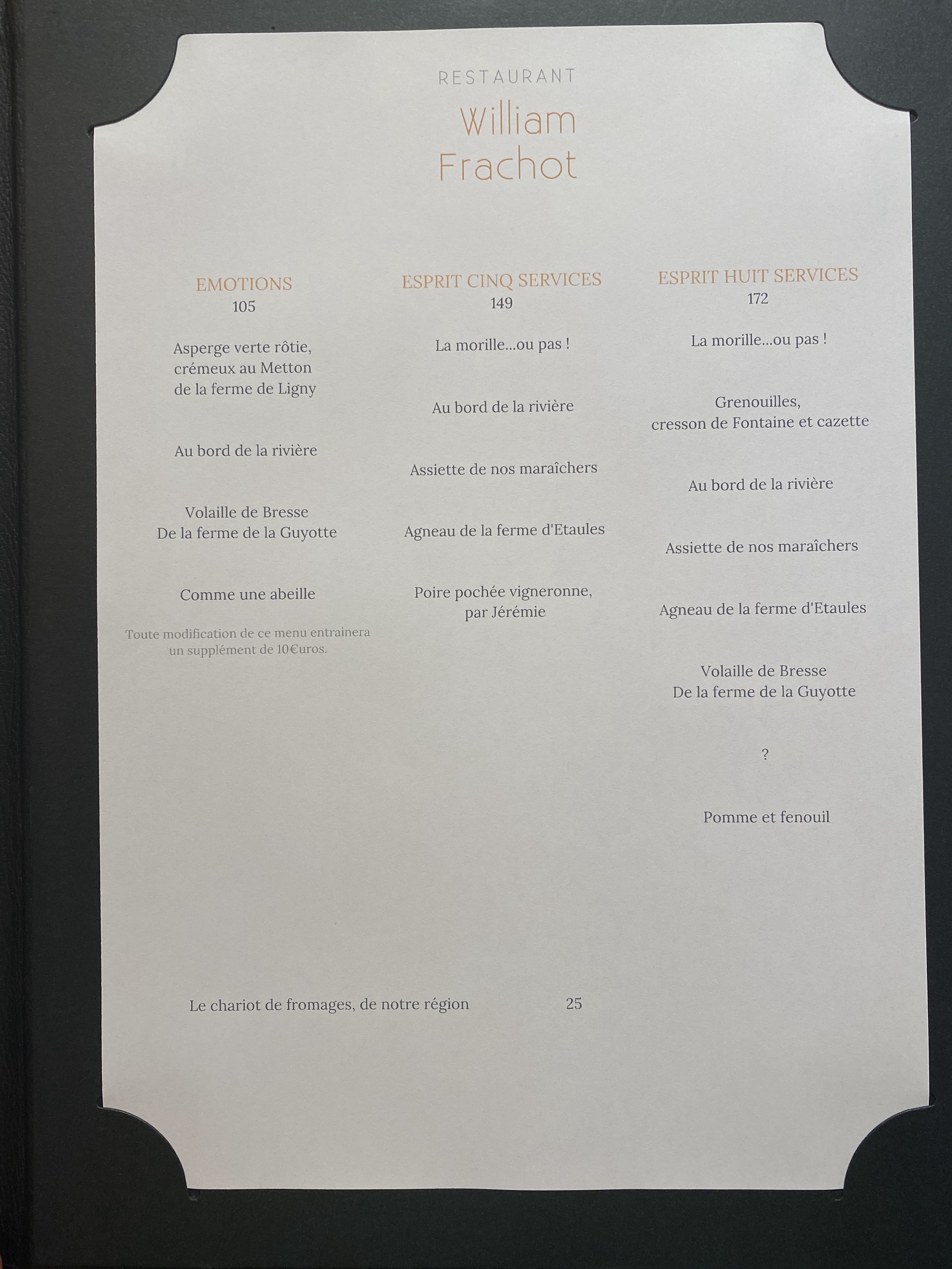 Nous sommes un groupe de 4 personnes ayant fait un tour de France gastronomique en allant manger tous les soirs dans un restaurant ayant au moins une étoile Michelin. Le restaurant William Frachot est notre 7eme de la liste. Pour ce repas, nous étions exceptionnellement 8 personnes. Comme le chef propose essentiellement des produits du marché, le restaurant a beaucoup communiqué avec moi, pour connaître en détail nos goûts et intolérances. Une semaine avant, j’ai eu connaissance du menu proposé. Pour nous c’était un tout légumes et poissons avec le menu Esprit en 5 plats plus les fromages et accords de vins pour 220 euros par personne. Nous avons eu droit à la salle privée, une ambiance moderne et confortable. De la superbe vaisselle et un service hors du commun. A la lecture du menu, cela pouvait paraître simple, mais wow, que de la recherche et une explosion de saveurs. Pour moi, la tomate a été une révélation ! Et tout au long du repas, des petites surprises en plus. Le sommelier et les serveurs ont fait un super job pour la présentation et le tout en 2 langues ! Chapeau bas, messieurs, mesdames, c’est avec plaisir que je reviendrai diner dans votre établissement