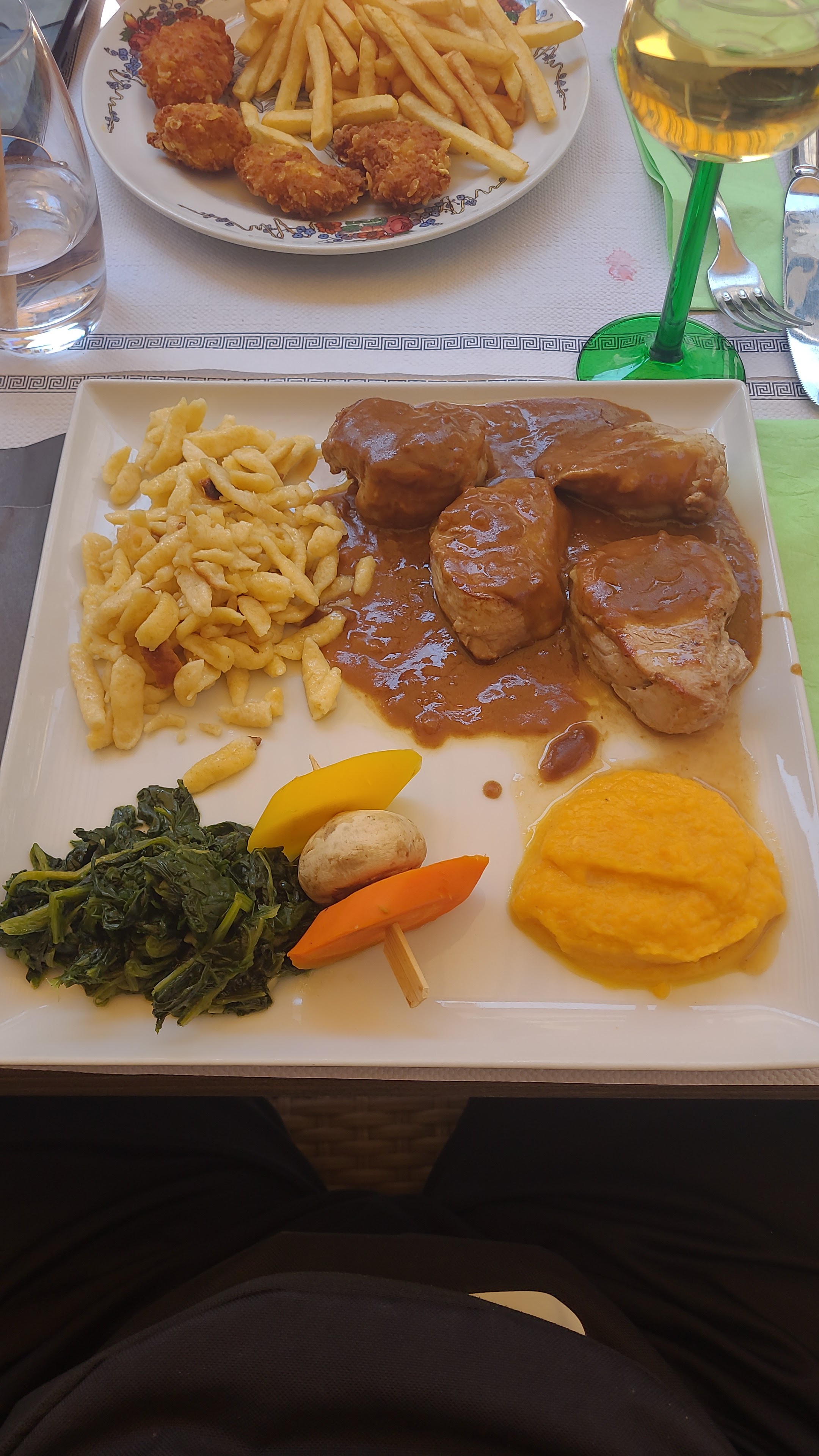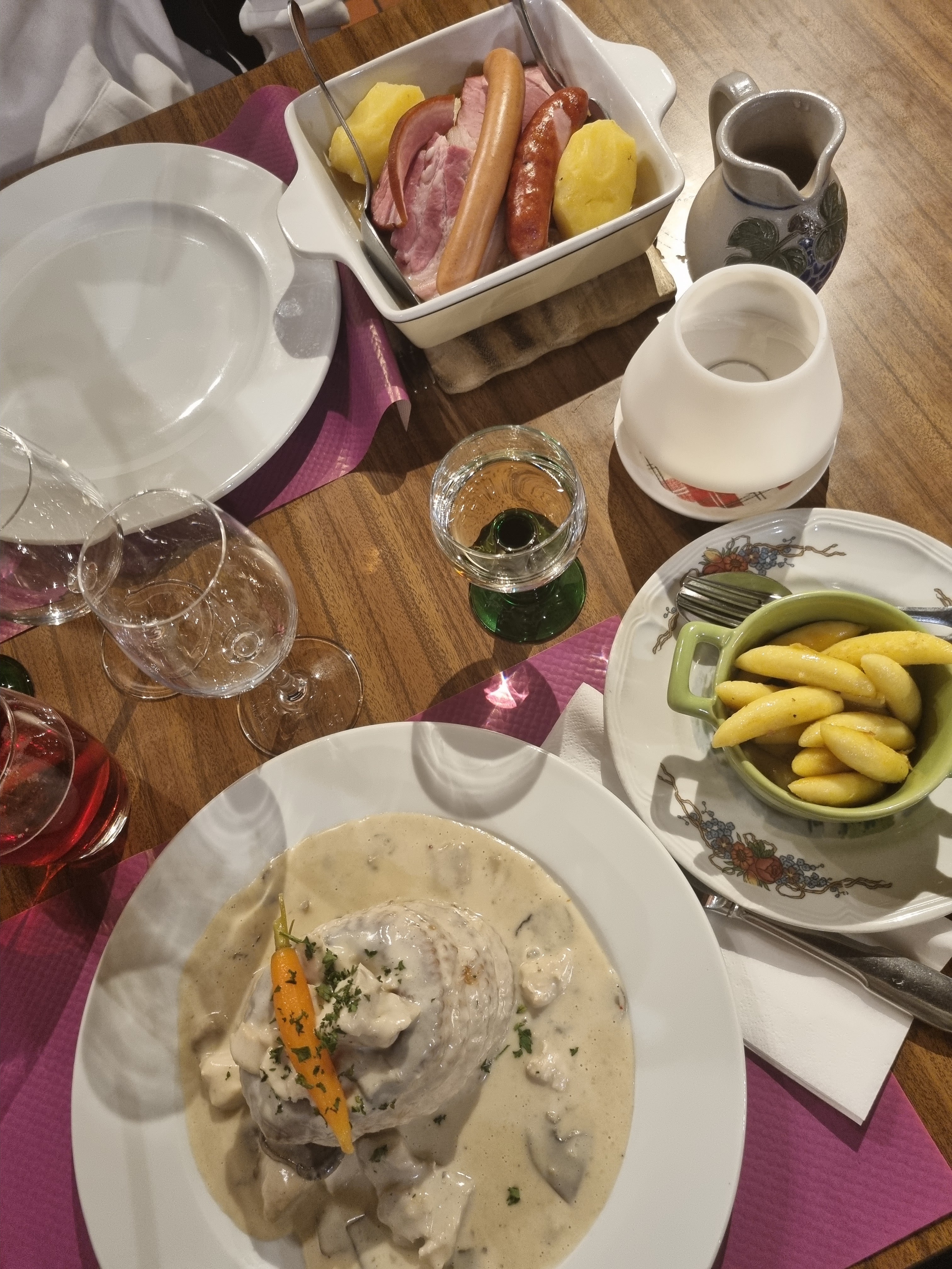 Bof bof bof.. joli bâtiment typique. Nous arrivons un dimanche midi avec réservation, nous avions annoncé deux enfants la serveuse nous dit qu’il n’a pas de chaise enfants, finalement deux réhausseurs arrivent… Il faisait très chaud ce jour là, la terrasse étant située entre deux bâtiments et couverte de parasols cela crée un effet « serre » nous avions tous extrêmement chaud et avons demandé deux fois des glaçons afin que nos boissons ne deviennent pas chaudes, nous avons remarqué que ça dérangeait. J’ai aussi eu l’impression que les carafes d’eau demandées n’ont pas été appréciées non plus .. Aussi, Le service était bien trop long, les explications de certains plats pas assez claires .. un petit travail à faire niveau communication serait bienvenu. La carte est petite, ils ont des suggestions du moment ce qui es bien. Très dommage les tartes flambées proposées uniquement le soir. Je mets les étoiles pour la Cuisine qui était très bonne, les plats généreux.
