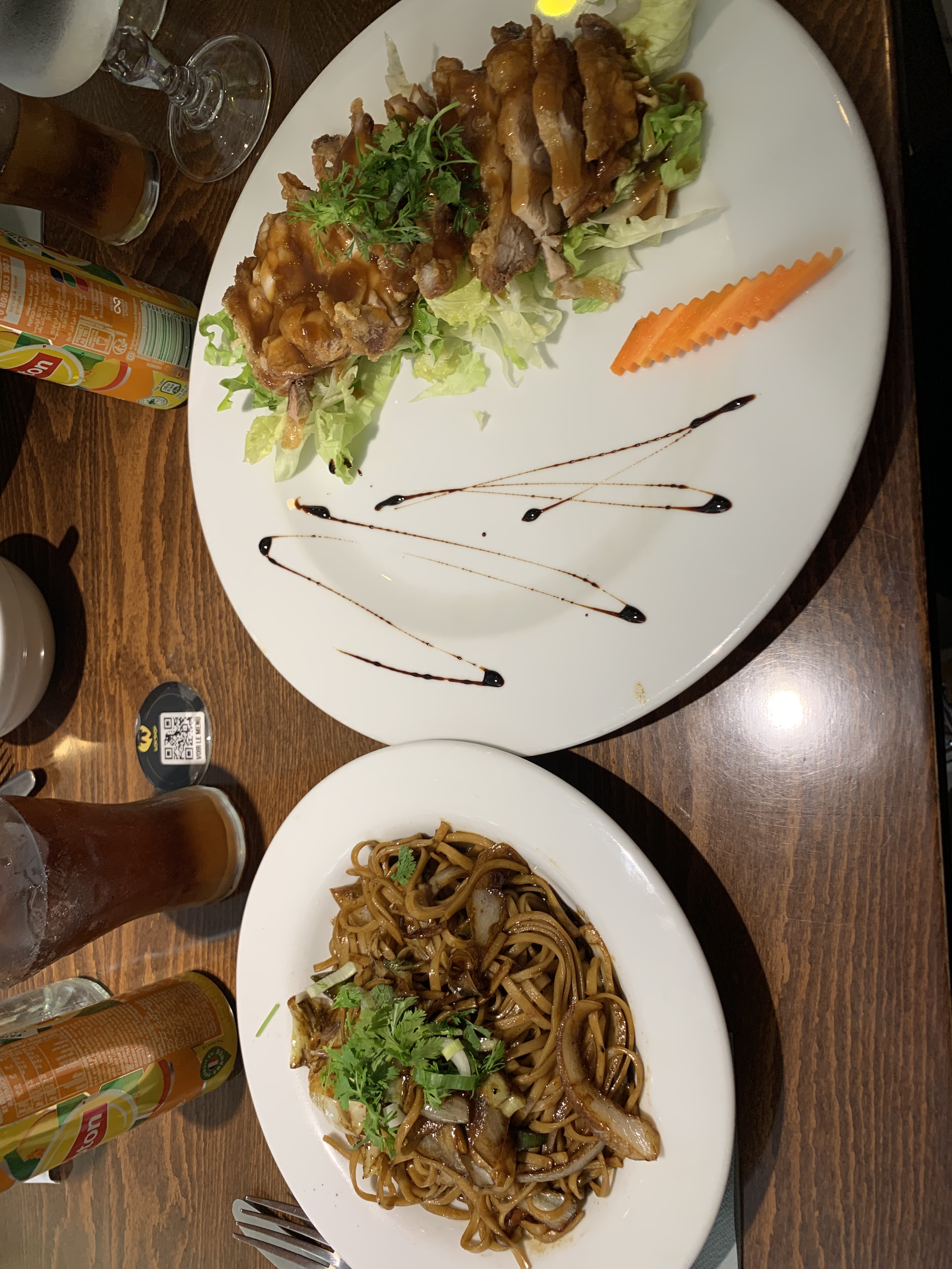 Rapport qualité/prix imbattable. Un cadre très sympa, une musique d’ambiance apaisante, le serveur a été très agréable avec nous et souriant. Les photos sur leur menu ne reflètent pas le réel visuel des plats qui sont bien plus beaux qu’en photo. J’ai personnellement pris le bobun au porc laqué et ma sœur le poulet croustillant teriyaki avec des nouilles sautées que vous pouvez voir sur la photo. Une très très bonne adresse que je n’hésiterais pas à partager à mes proches. Un gros pouce vert pour cette adresse! 👍🏼 ✅