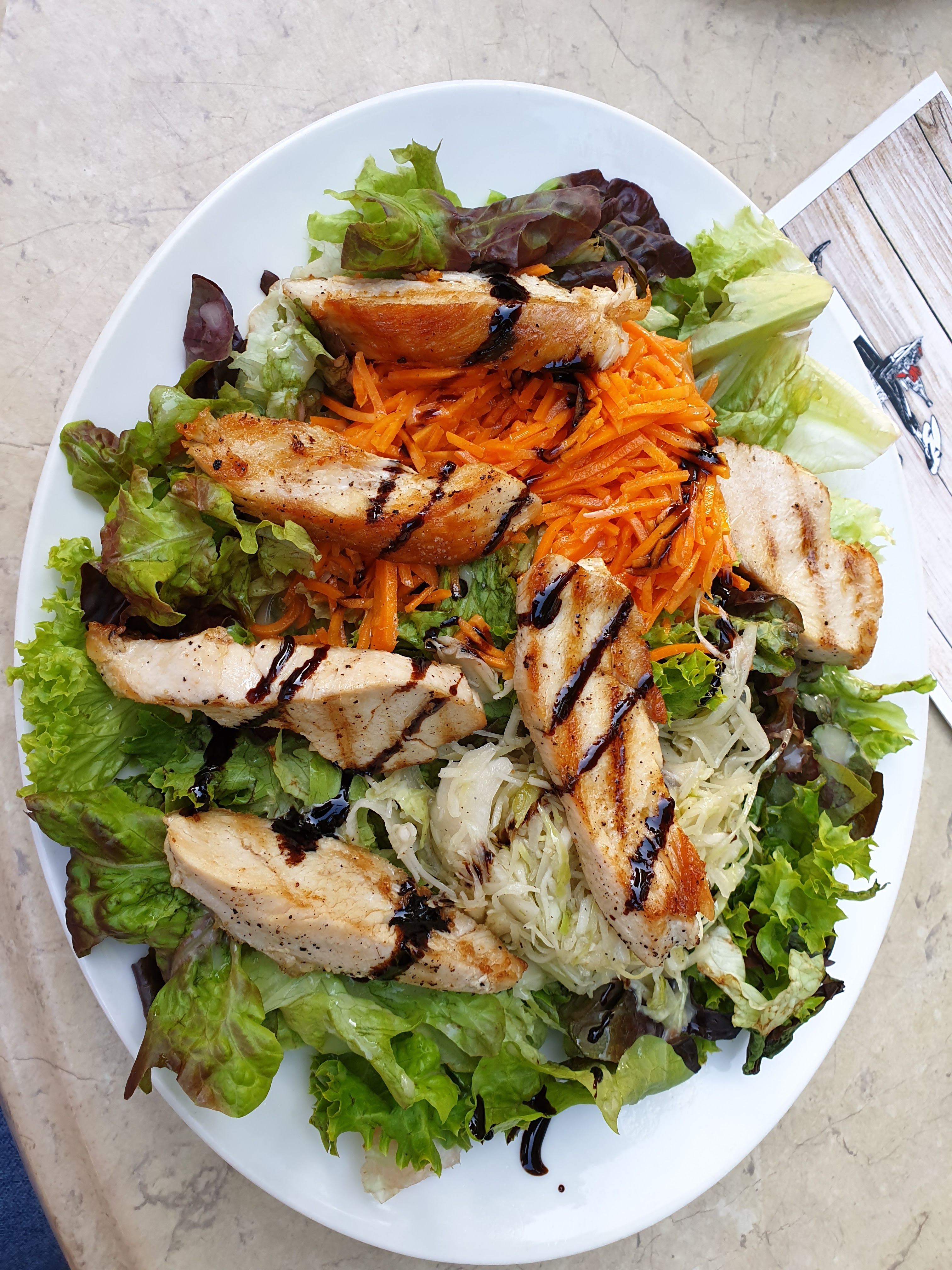 Poulet très sec en salade. Dégusté car préparé quelques jours avant de servir. Je ne m'attendais pas à une qualité aussi médiocre pour le prix.