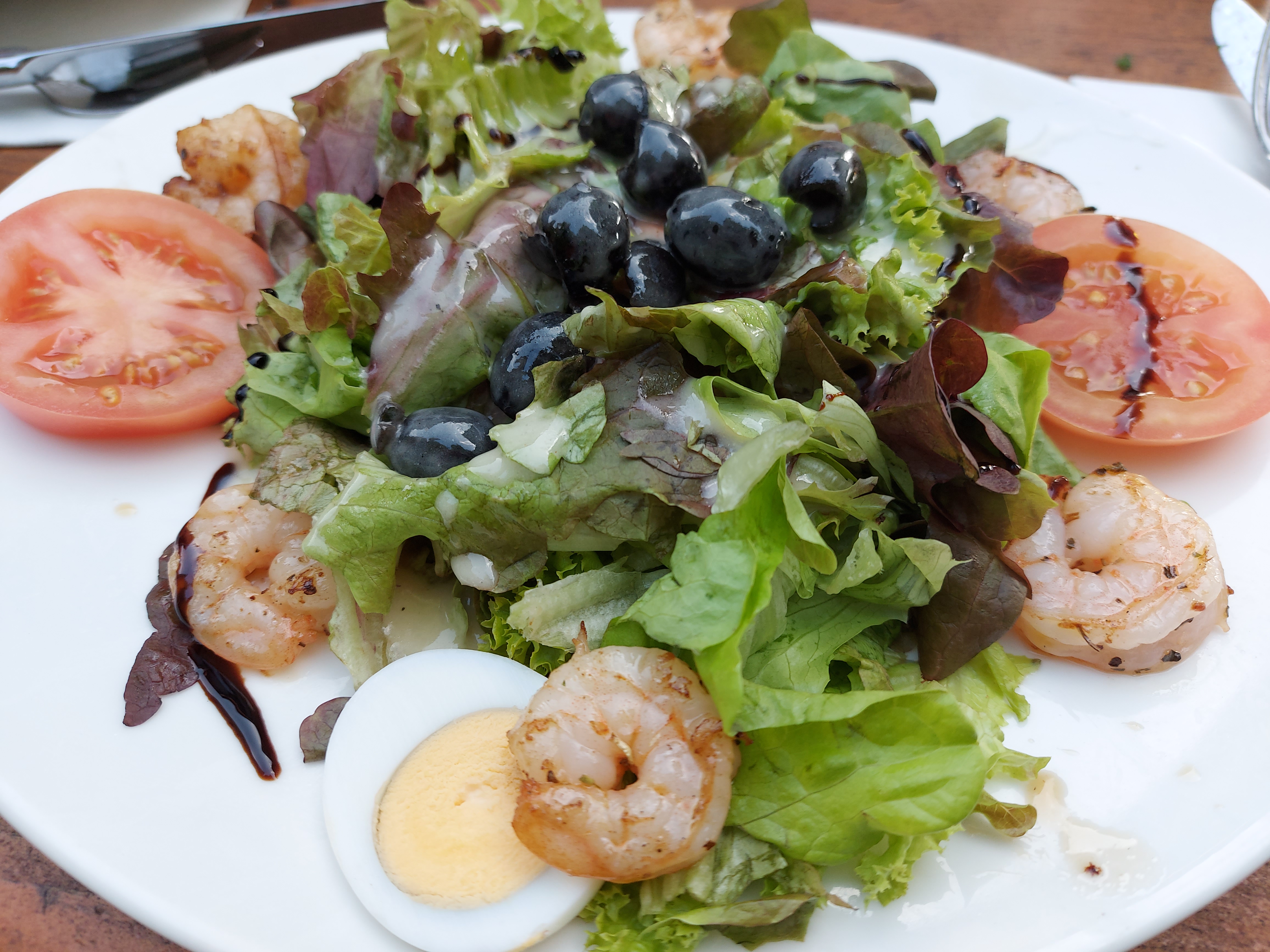 Très bon restaurant dans un cadre superbe, où l'on peut s'asseoir dehors même par beau temps. Pour les enfants, il y a une grande aire de jeux à l'extérieur où ils peuvent jouer au football, par exemple, il y a une table de peinture, un baby-foot et une table de ping-pong. Pour le dîner, nous avons eu une assiette d'entrée française pour deux personnes, ce qui était très bon. Ensuite, j'ai pris une salade de crevettes et mon mari a pris une salade de baquette rôtie et de fromage de chèvre. Les deux étaient également très savoureux.