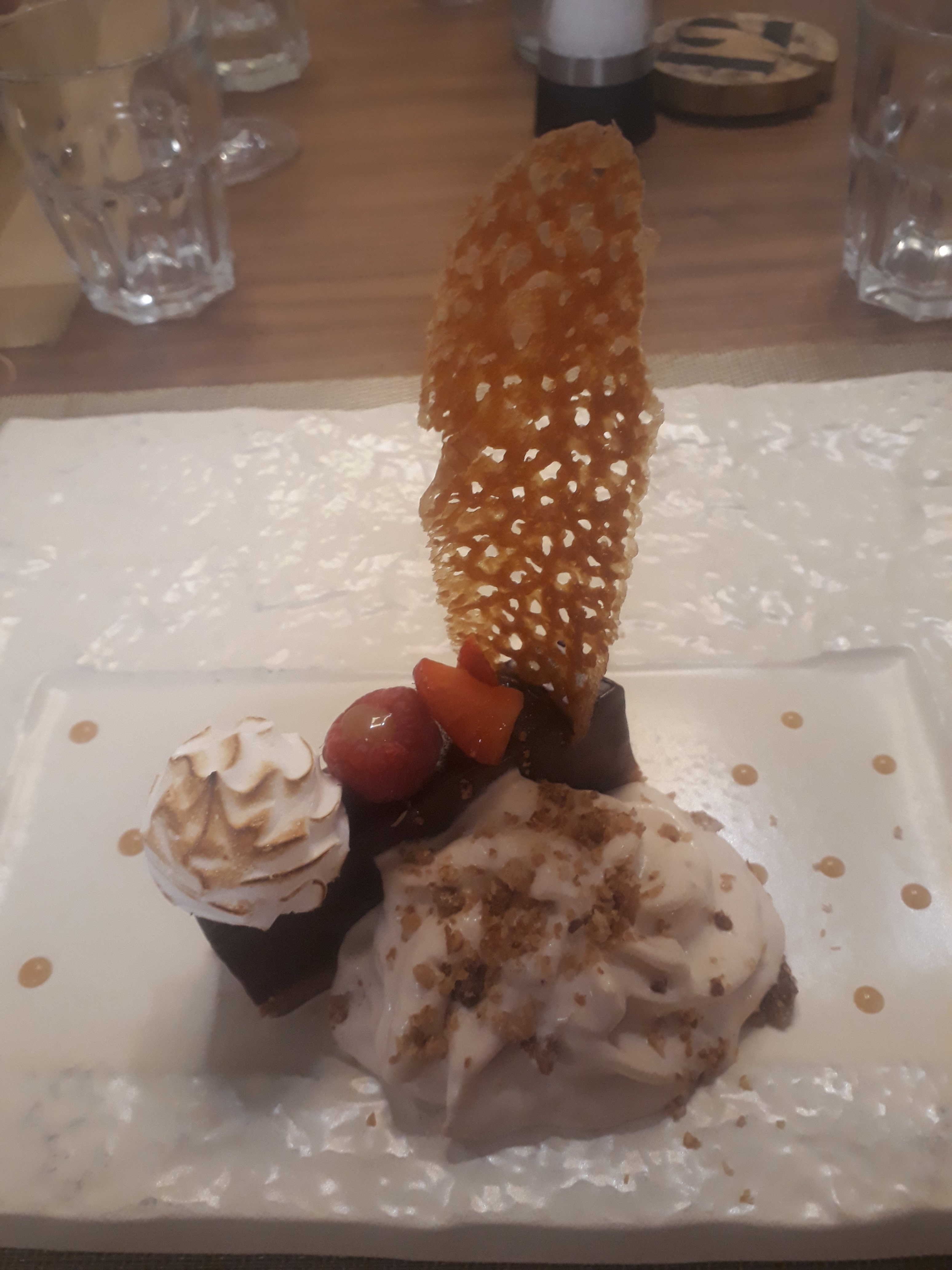 Très jolis plats pour l entée et le dessert avec de belles saveurs et découvertes ; le plat était assez classique (risotto aux gambas) et trop sale à mon goût. La décoration pourrait être plus cosy tables et murs d entrée.