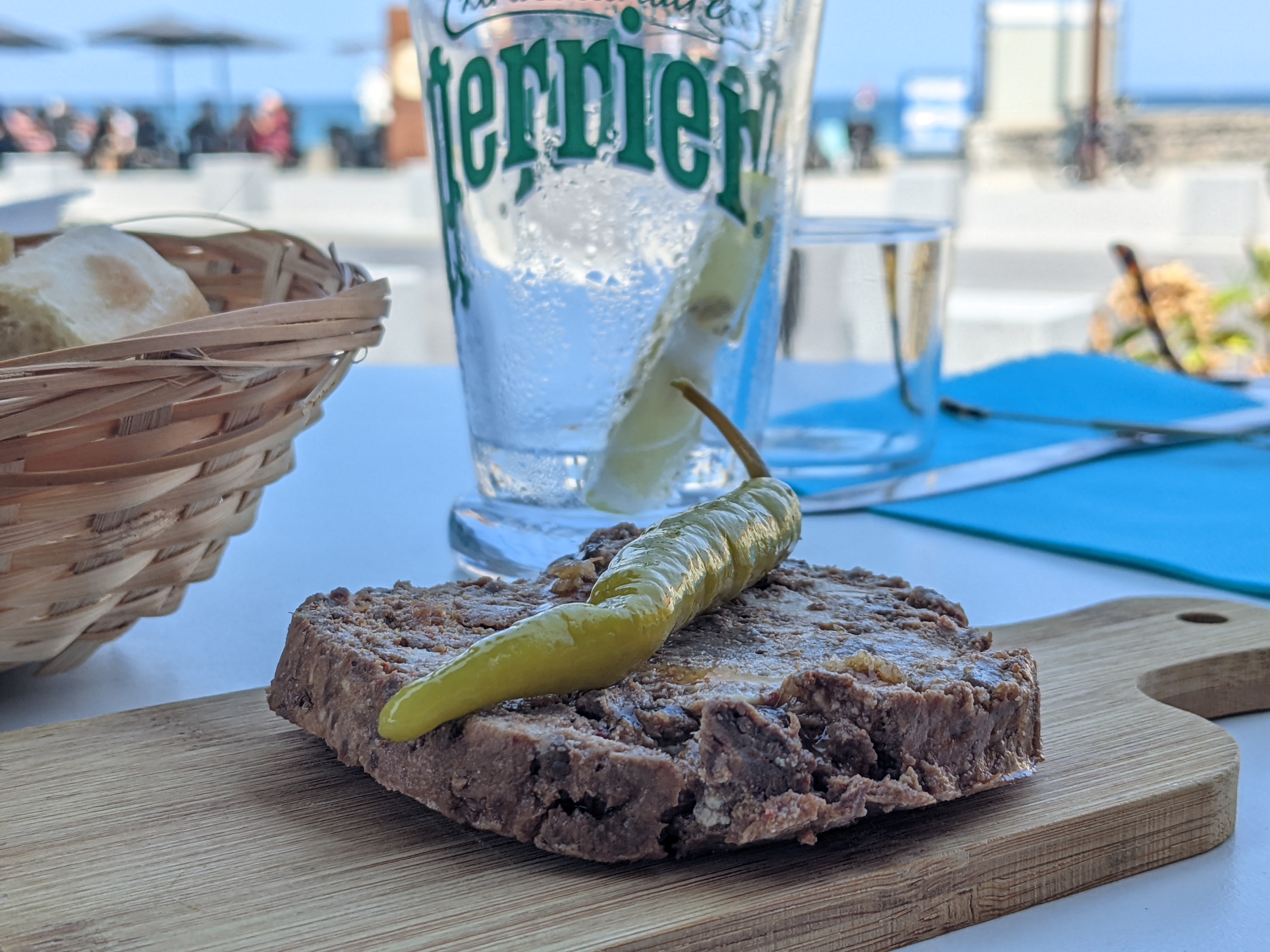Bonne collation, verre de vin cher. En bord de mer, superbe vue !