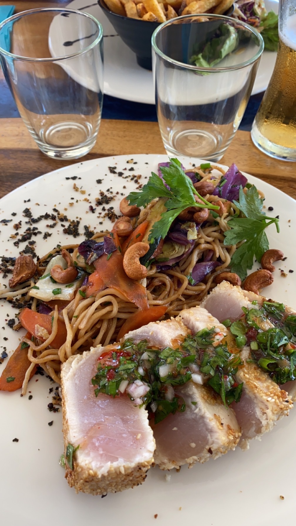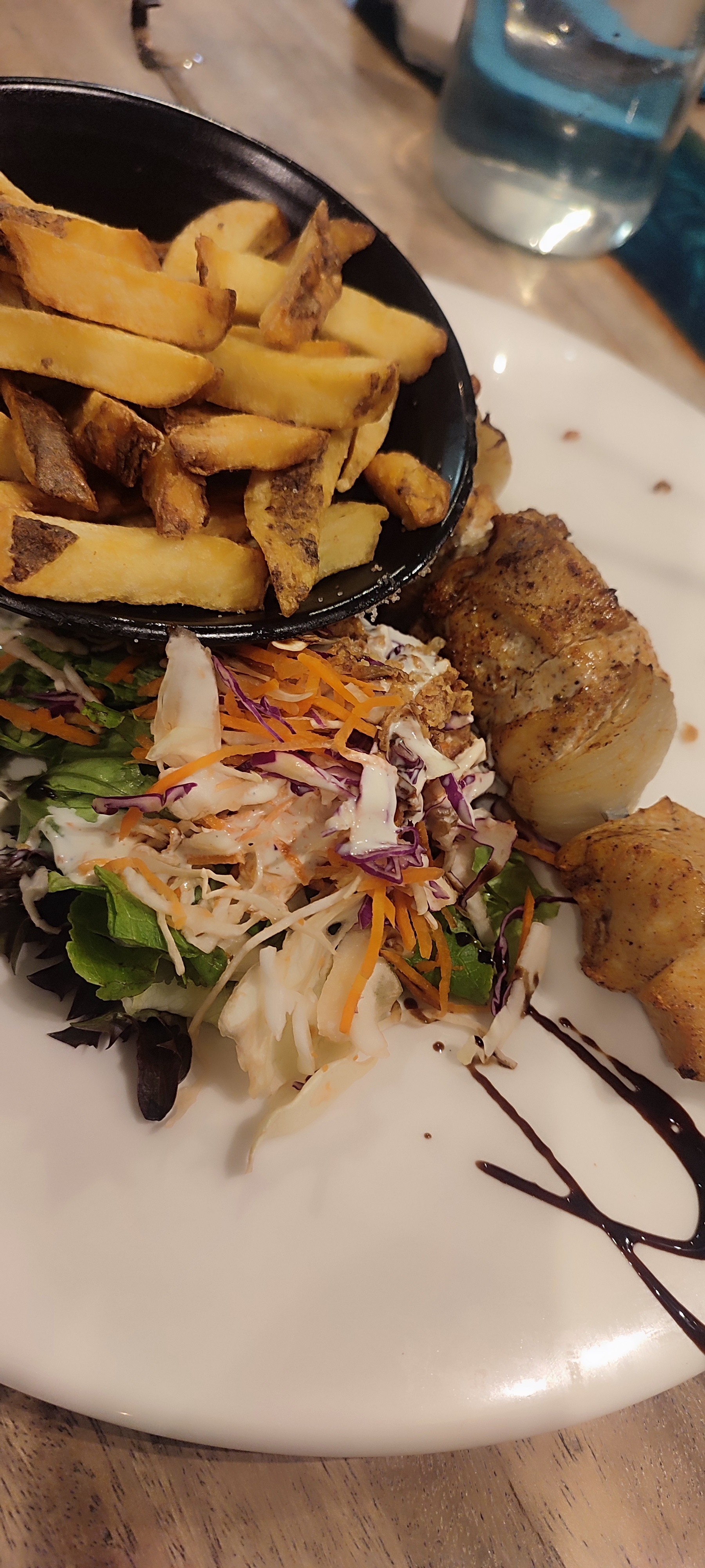 Brochettes de poissons délicieuses et copieuses, tataki de thon extra, les burgers sont super bons. On a aussi testé les cocktails Detox 😅. On est venus à plusieurs reprises. Vue sur la mer imprenable, personnel aux petits soins. On recommande !