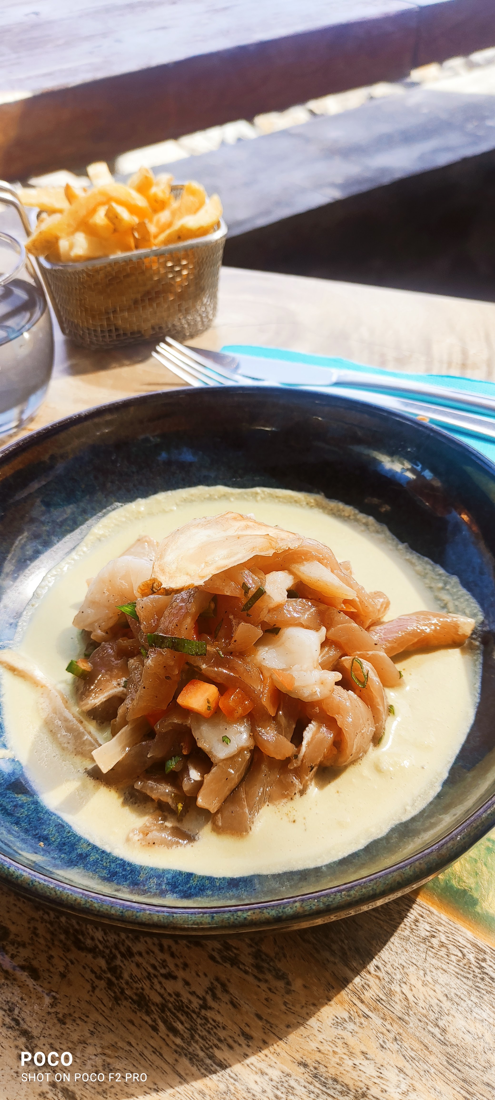 Le cadres est sublime, bercé par le bruit des vagues. Un petit peu d’attente pour la prise de commande mais le reste a bien suivi. Les tapas et le trio de poissons étaient réussis ainsi que la très bonne sauce à la vanille. Serveur très agréable.