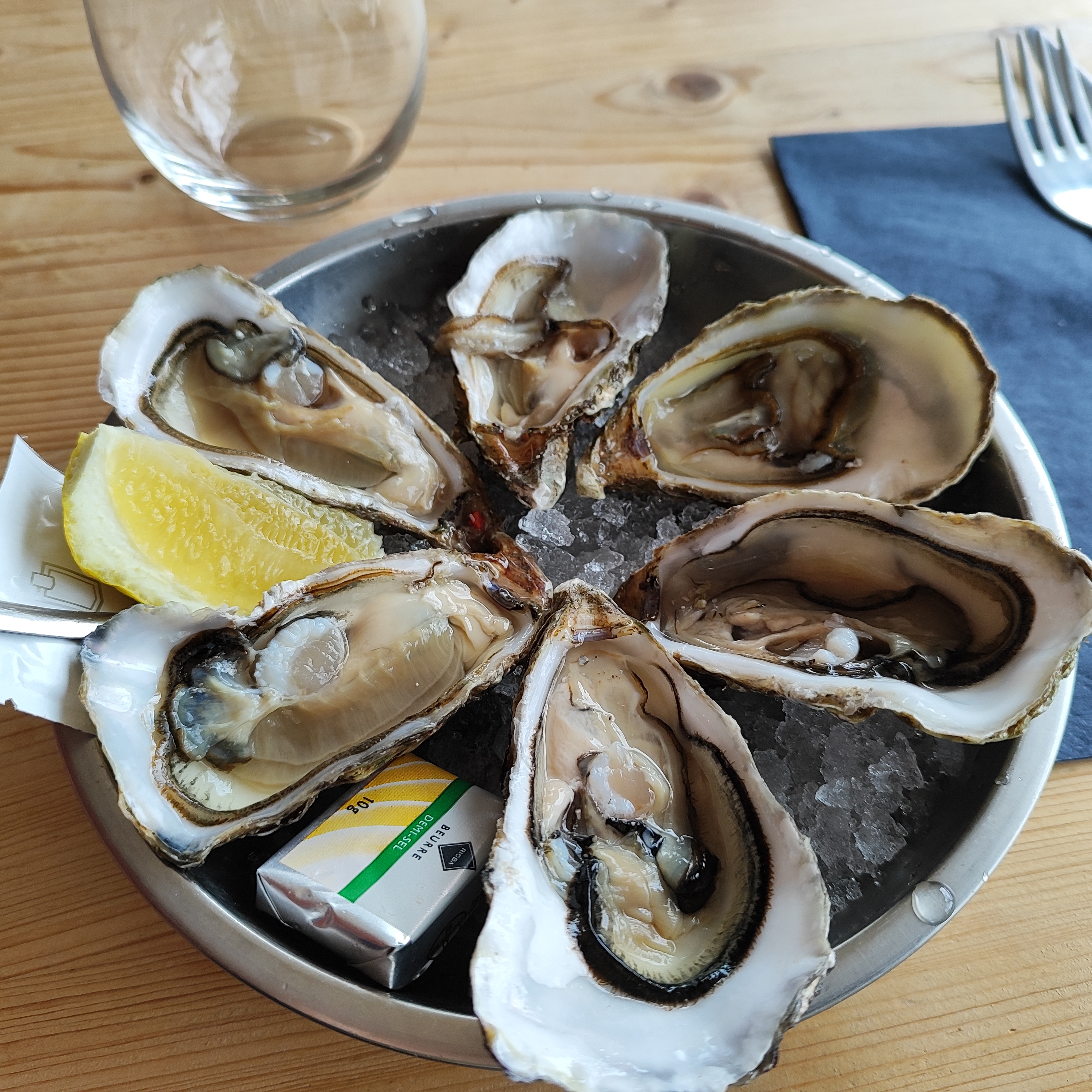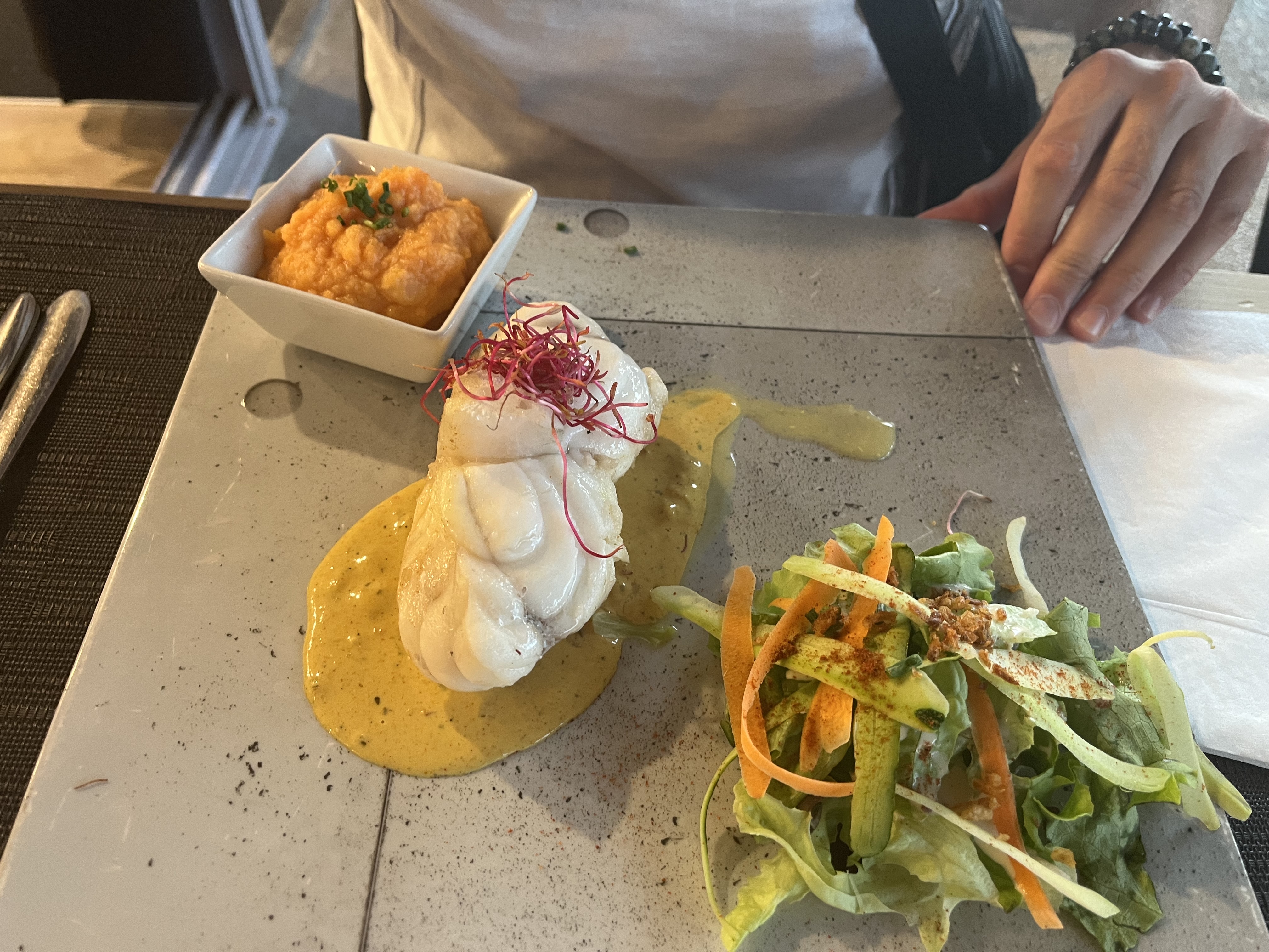 Après un petit couac de réservation, qui s’est arrangé avec l’aimable et débordé serveur , ma mère s’est régalée avec une grande assiette d’huîtres fraîches et mon cabillaud était particulièrement bon, cuisson au détail, filet d’huile d’olive de qualité et mousseline maison.