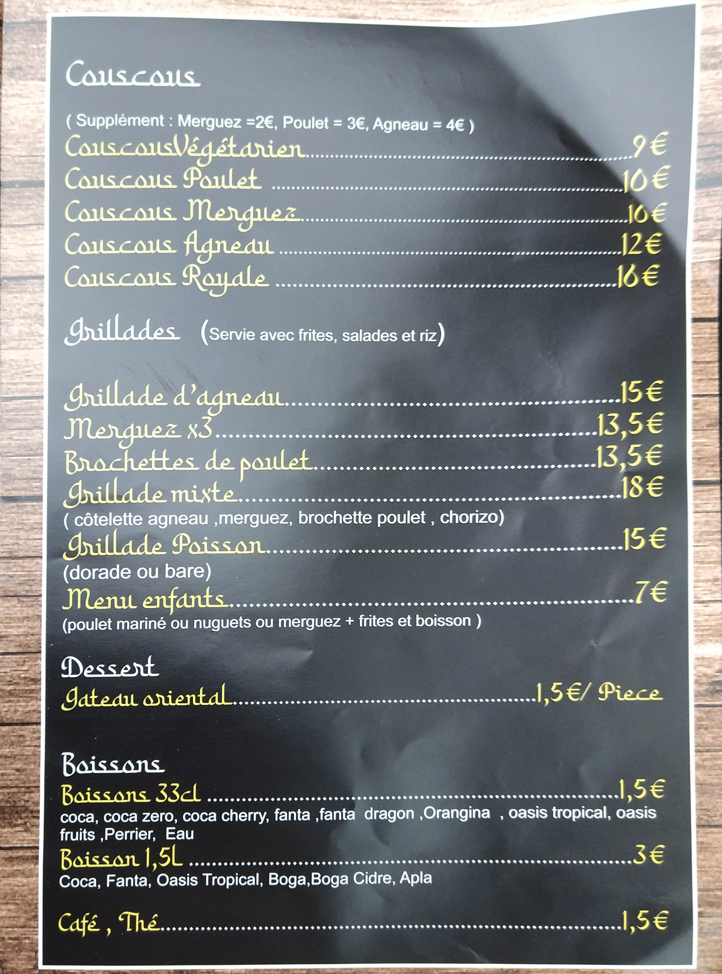 Resto accueillant , couscous au top et copieux j ai pris 3 royale . Suis juste un peu déçu ou surpris de payer 54 e pour 3 royale et 4 gâteaux je paye légèrement moin cher a st etienne ou lyon .