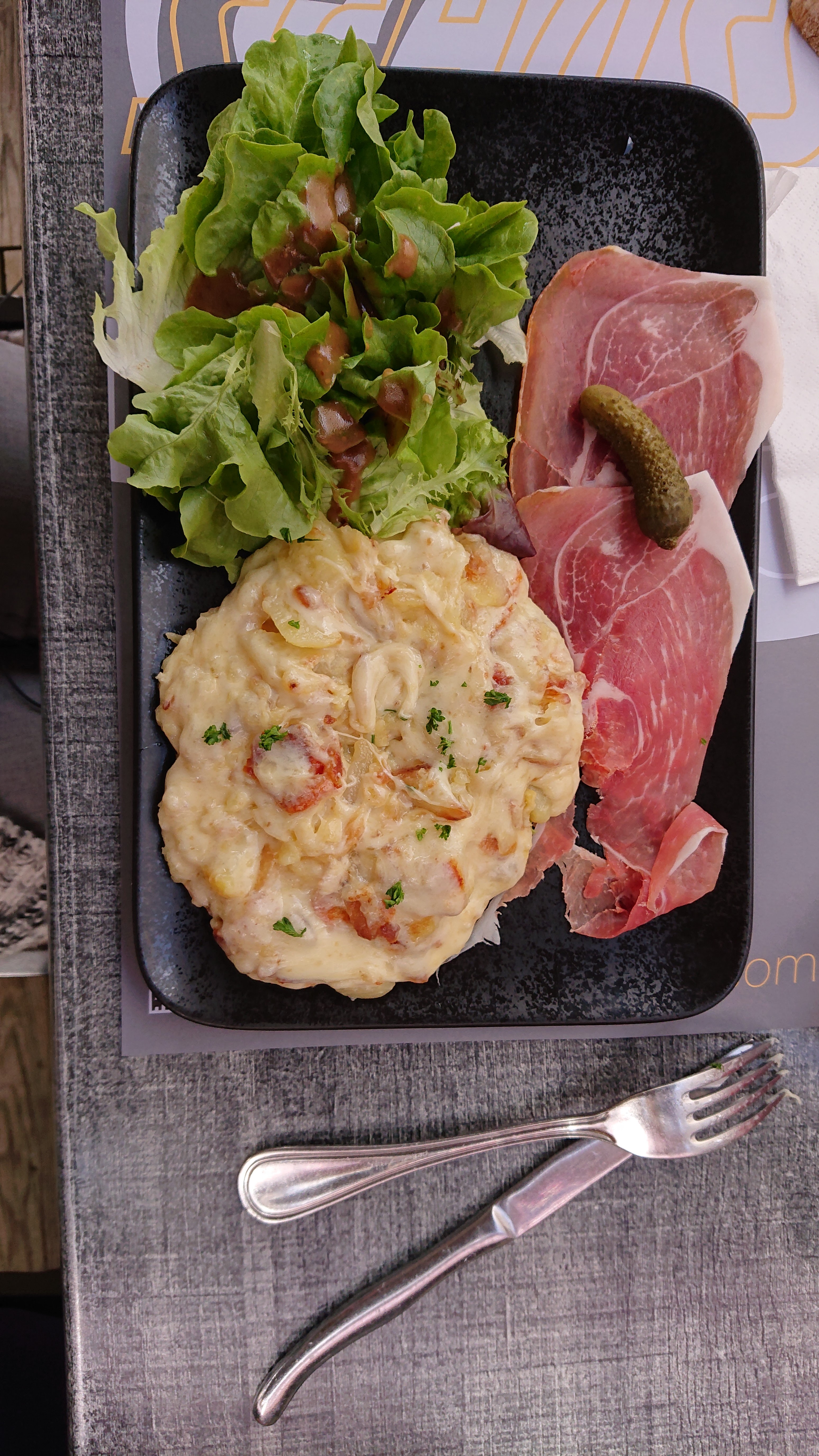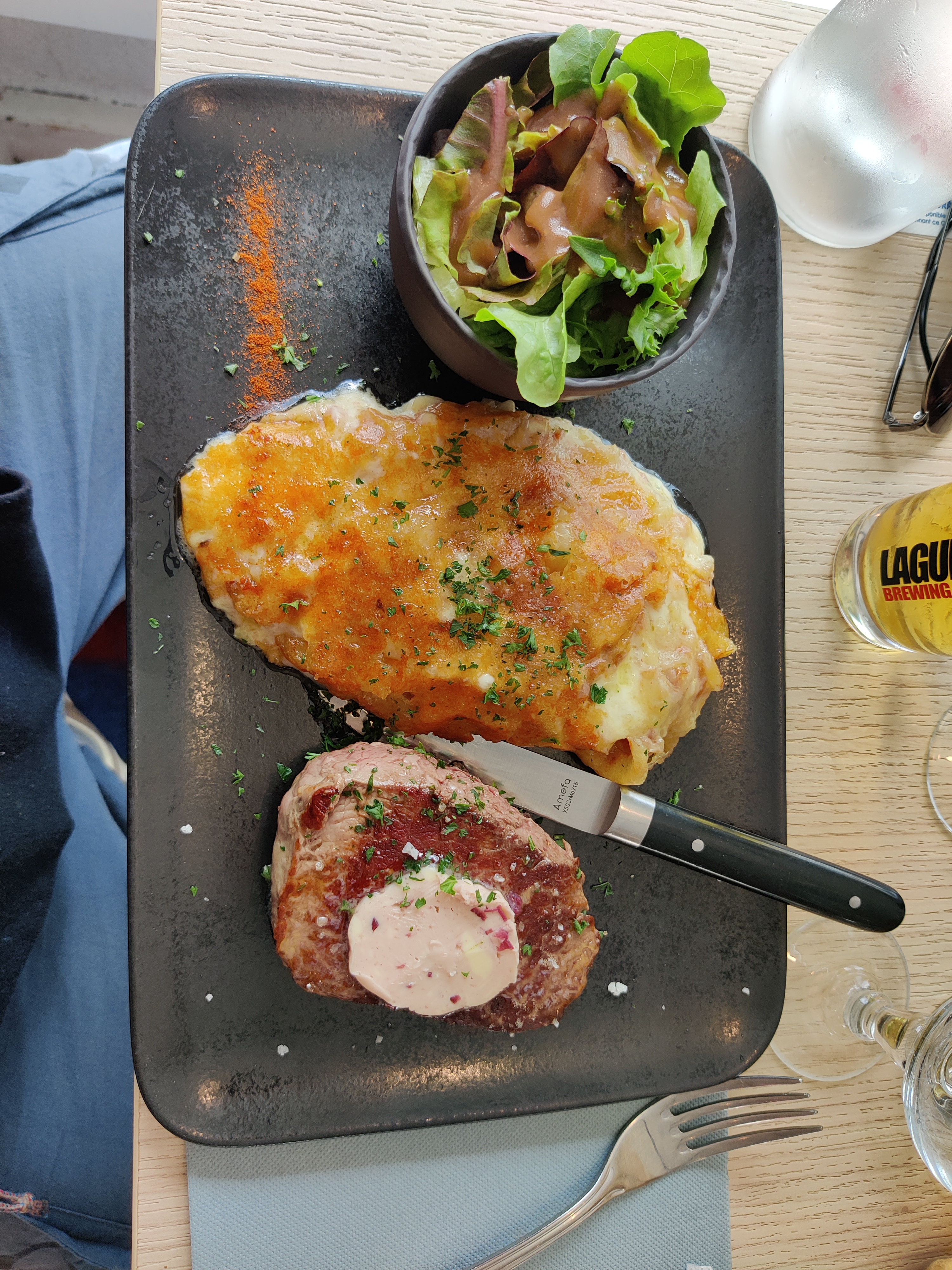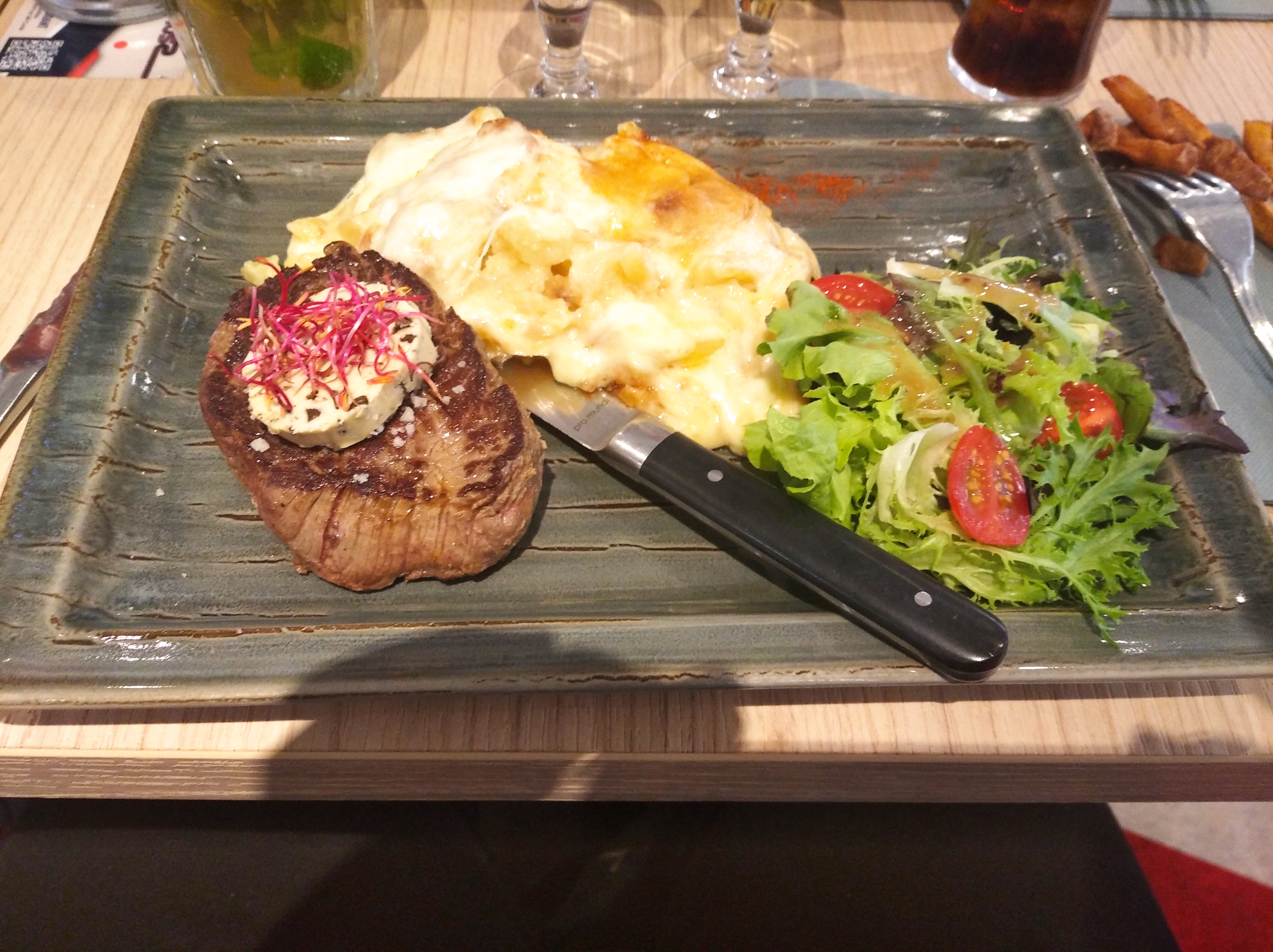Pas eu le choix de la place ..... imposée . Entrecôte de 3 millimètre (oui, c'est pas du baratin ! Une feuille de viande salées au gros sel .... de la Salers ou pas....j'ai pas vu de différences), un feuille de salade avec une tomate cerise et 3 cuillerées de truffade ......24,50 EUROS ! ! ! ! Rien à voir avec les photos On paye vraiment pour leurs 8 mois de retraite hors saison et surtout pris pour de gros pigeon de touristes . Et j'habite à 1h de la station .