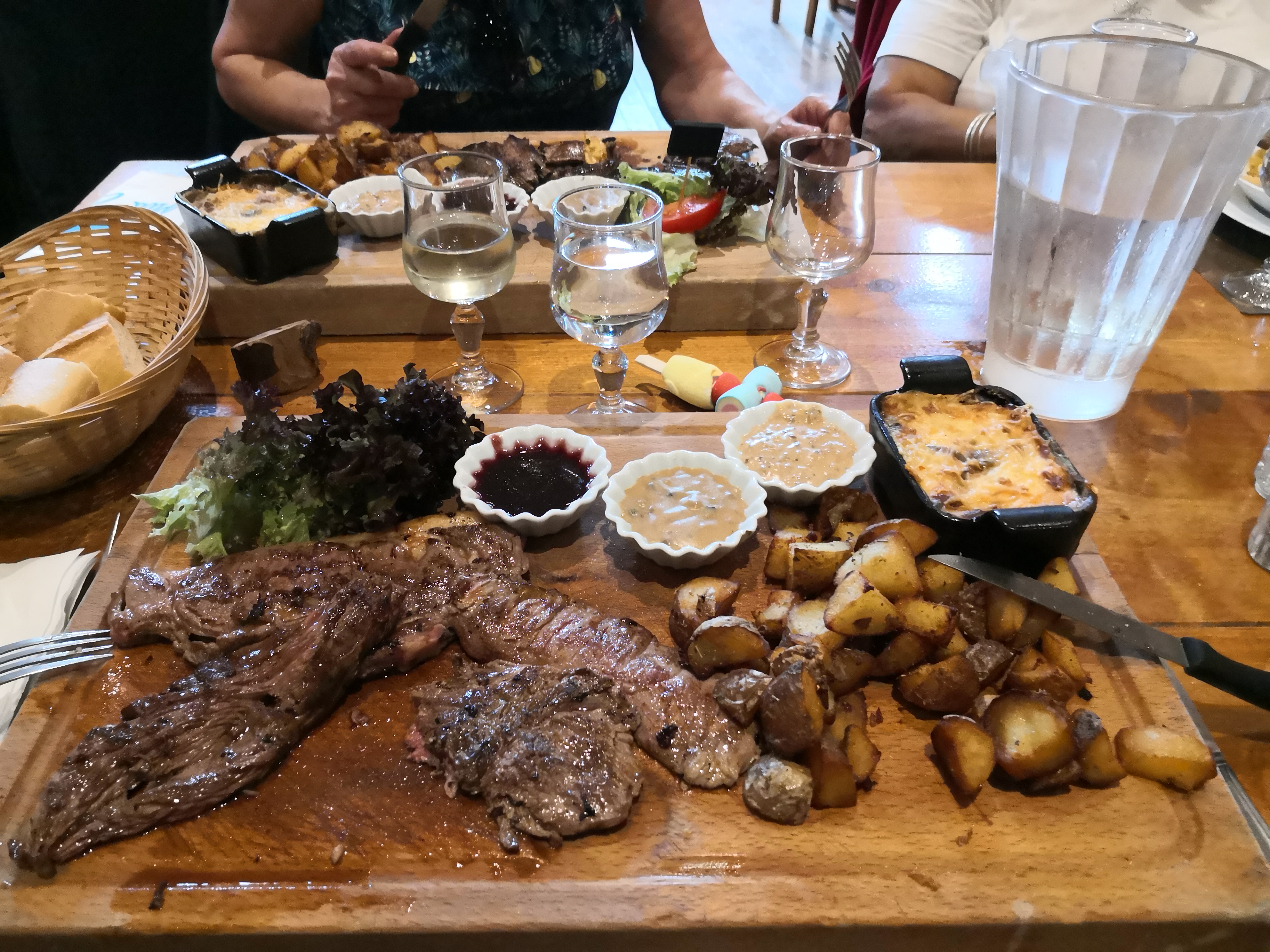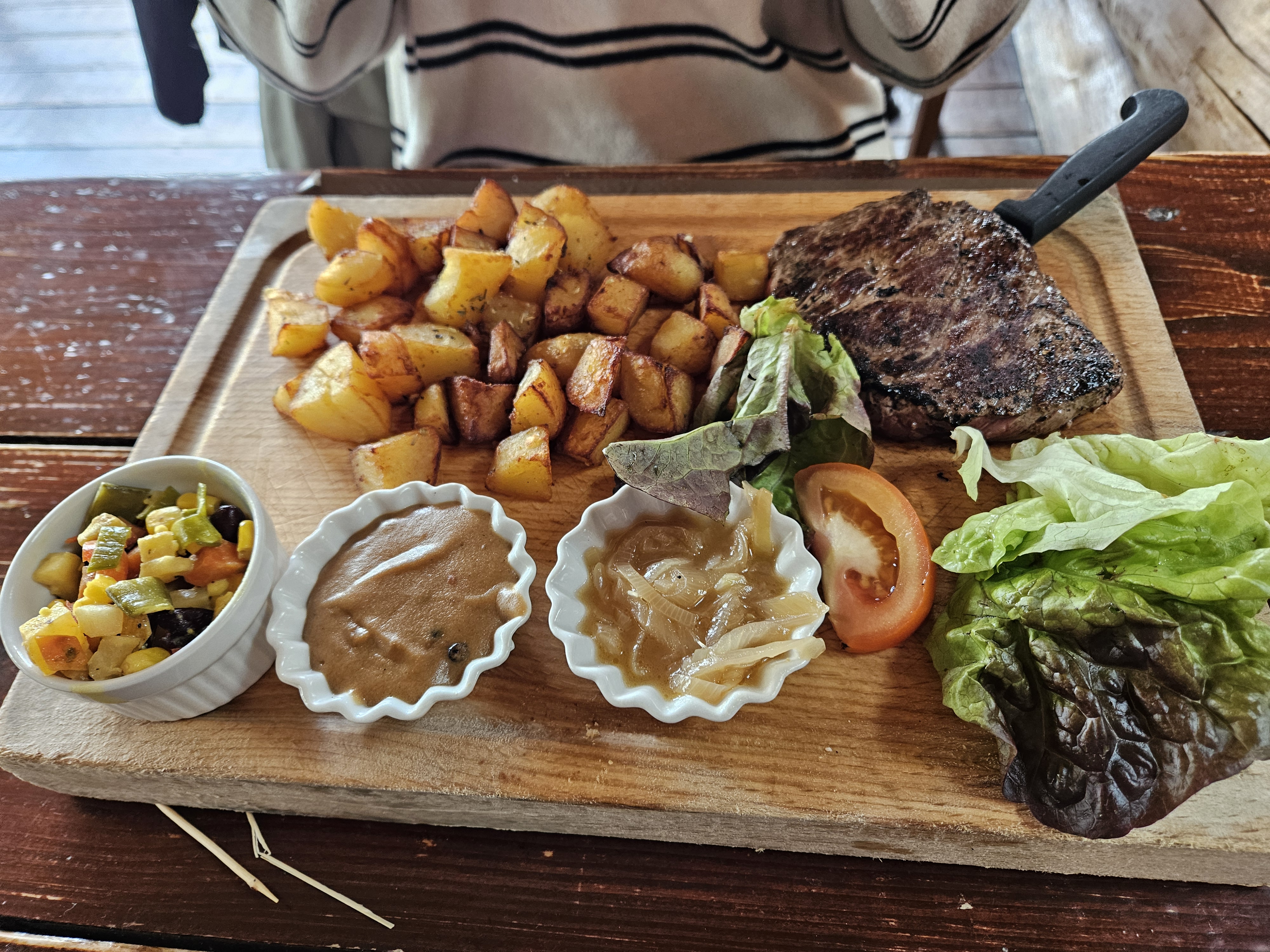 Restaurant bien dans le thème dommage il était début de service plus d'entrecôte ni de pavé de bisson on nous oriente sur une planche découverte à 39€ + 10€ car on l'a partage à deux plutôt exagérer et le service est très long et pour régler l'addition une file d'attente pas possible sinon la viande bonne le goût du bisson n'ai pas trop fort. Après avons fais visite des bissons + loups génial .