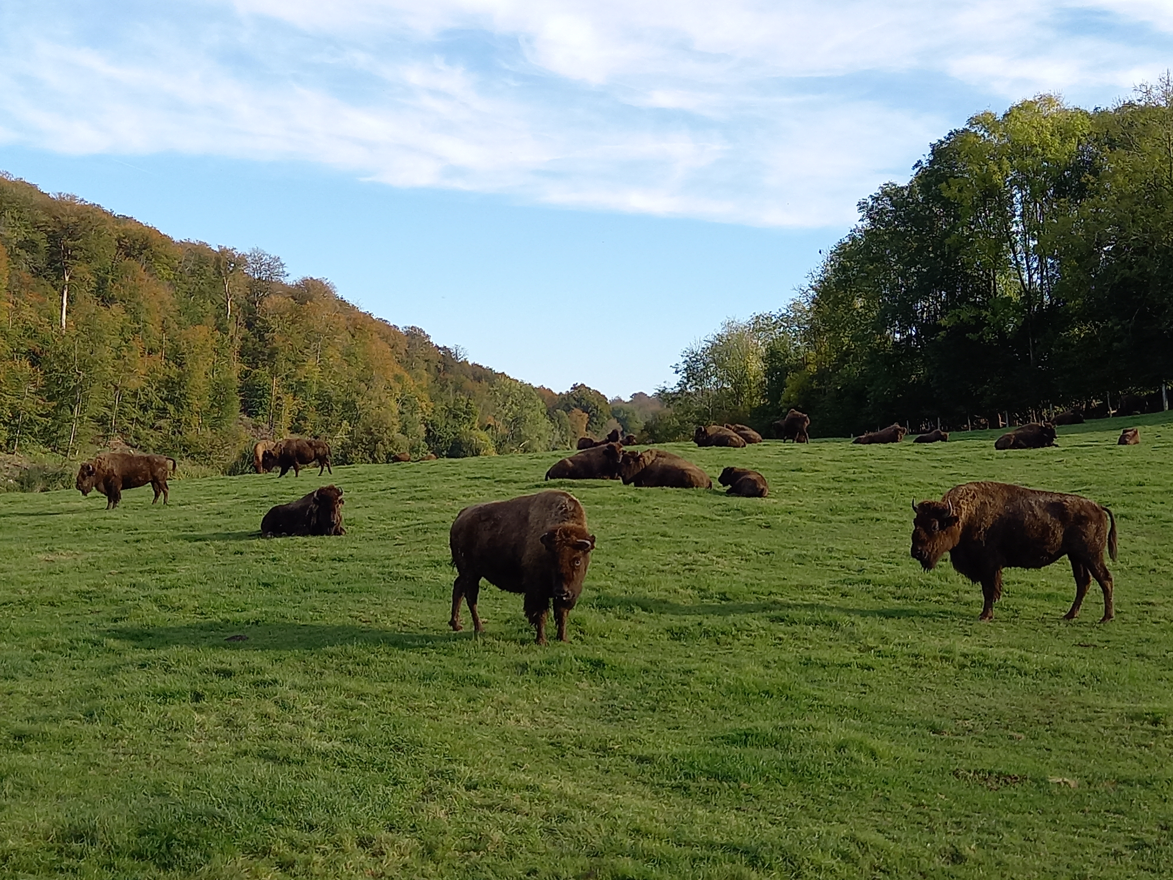 Dépaysement garanti ! En plein coeur de la Normandie et pourtant on pourrait jurer qu'on a traversé l'Atlantique. Les visites vous emmènent au plus près des animaux, dans le respect maximum de leurs conditions de vie, et bisons, loups et autres cervidés n'auront plus beaucoup de secrets pour vous après les commentaires et explication du personnel vous accompagnant. Et pour répondre à la question que vous n'osez pas poser : oui, il est possible d'acheter de la viande de bison à la boucherie ou d'en manger au restaurant. Les animaux ne sont pas abattus pour cet usage, mais lorsque que les autorités vétérinaires demandent un prélèvement pour conserver l'équilibre fragile de l'écosystème... en acheter c'est aussi participer à leur conservation.