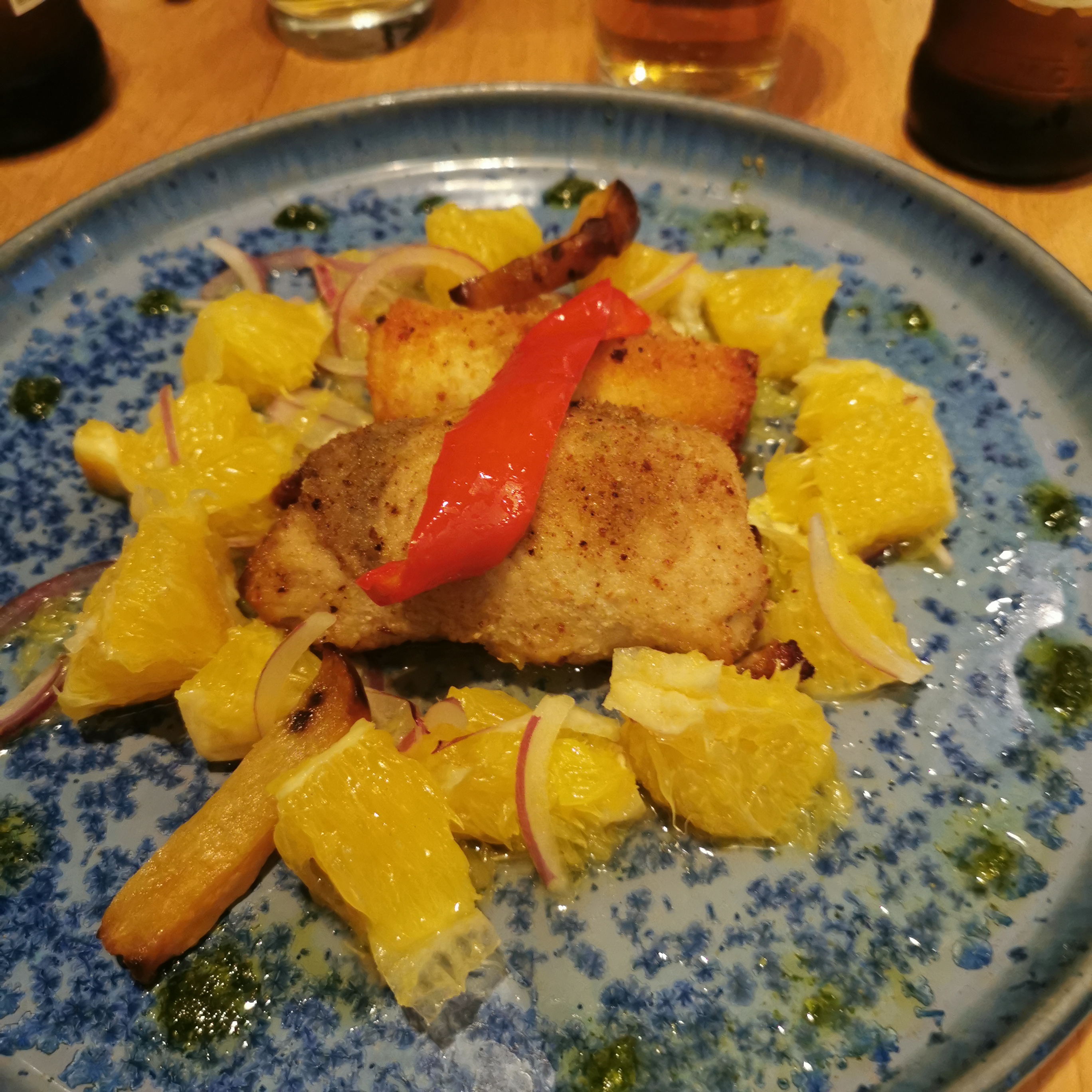 Voici une adresse exceptionnelle que je vous recommande ! L’entrée : Légumes rôtis au Four sur une salade de roquette Le plat Espadon farcis aux légumes et espadons avec Légumes al dente et quartiers d’orange 🥰 Super Délicieux !!! 🥰😍