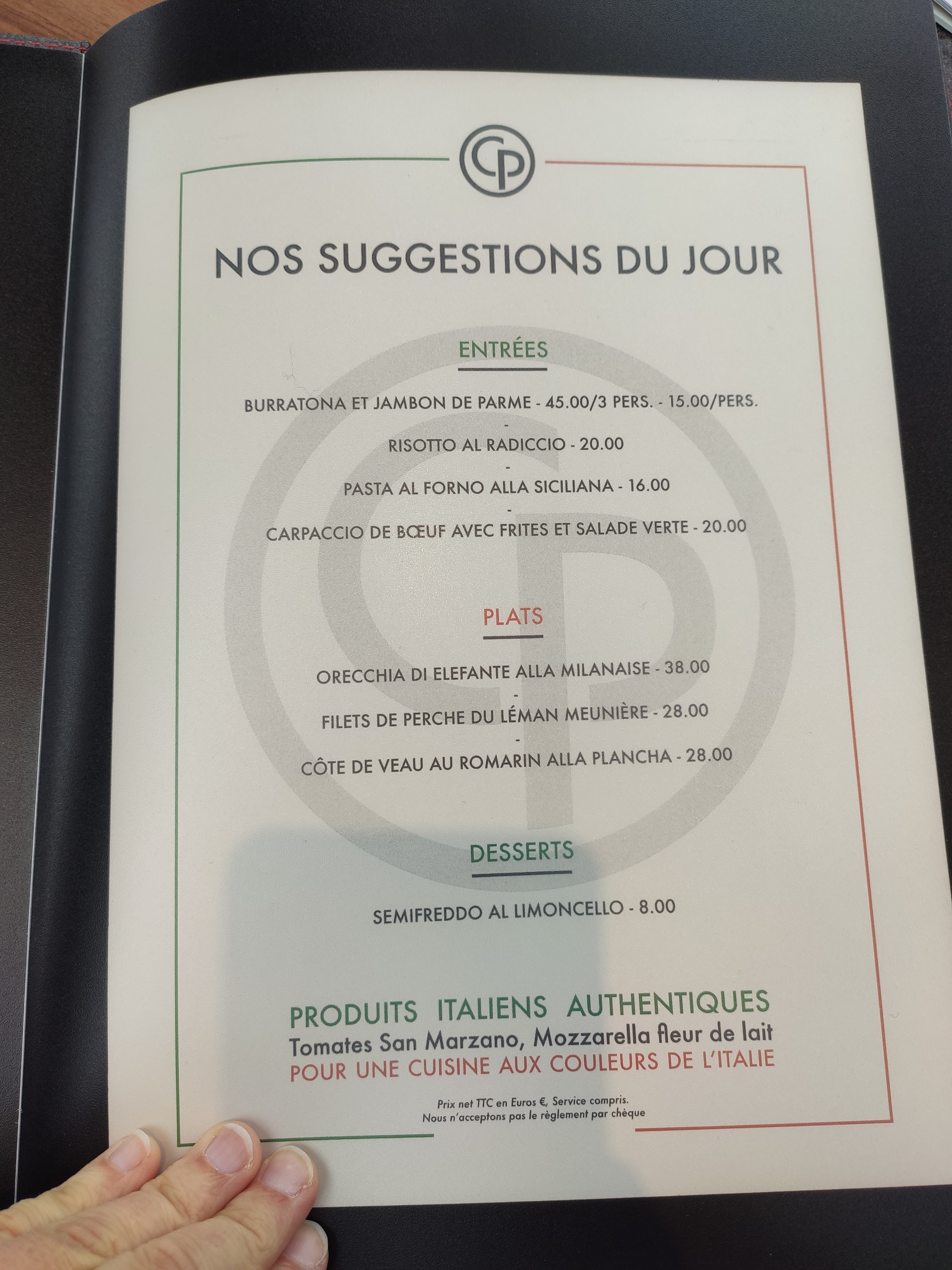 Lors de ma 1ere venue en juillet c'était tres positif car nous étions en terrasse et pizzas super bonnes Donc retour 15 j apres et...la cata! En interieur un bruit assourdissant( a 2 on s'entendait a peine) - cuisine tres bof, pizza nettement moins bonne- et des prix hallucinants! Un vitello tonato a 22€ mangé en a peine 3 fourchettes et banal au possible...et pourtant je connais tres tres bien ce plat étant moi mm italienne ! Messieurs on est a Seynod..!!!.pas a Annecy au bord du lac ni a Venise ou a Paris! 1 spritz 1 kir - 1 vitello- 1 pizza- 1 linguine- 1 tiramisu 86€! En 1h30 le repas a été expédié et grosse grosse deception!